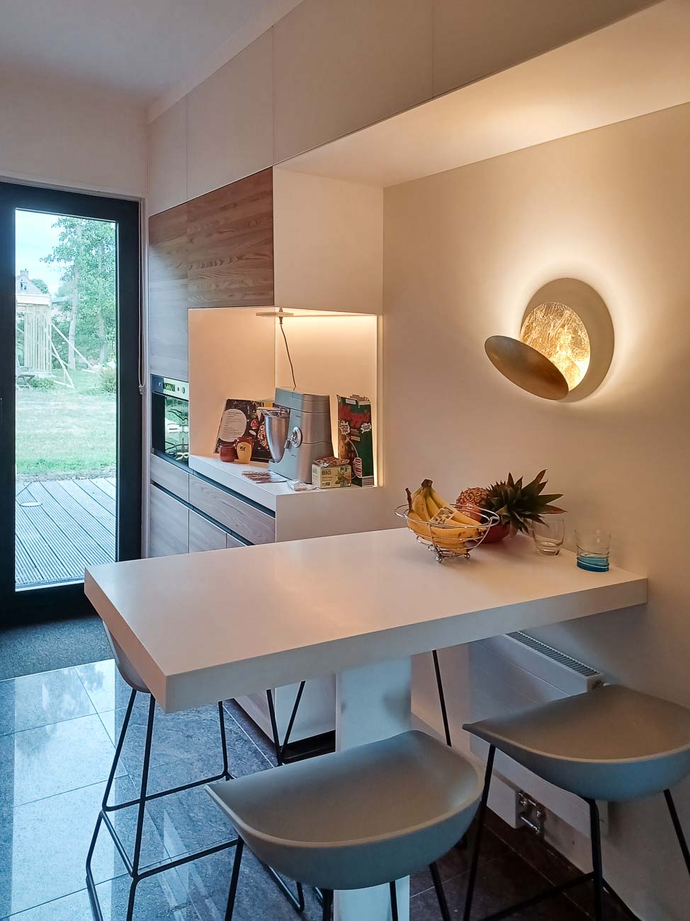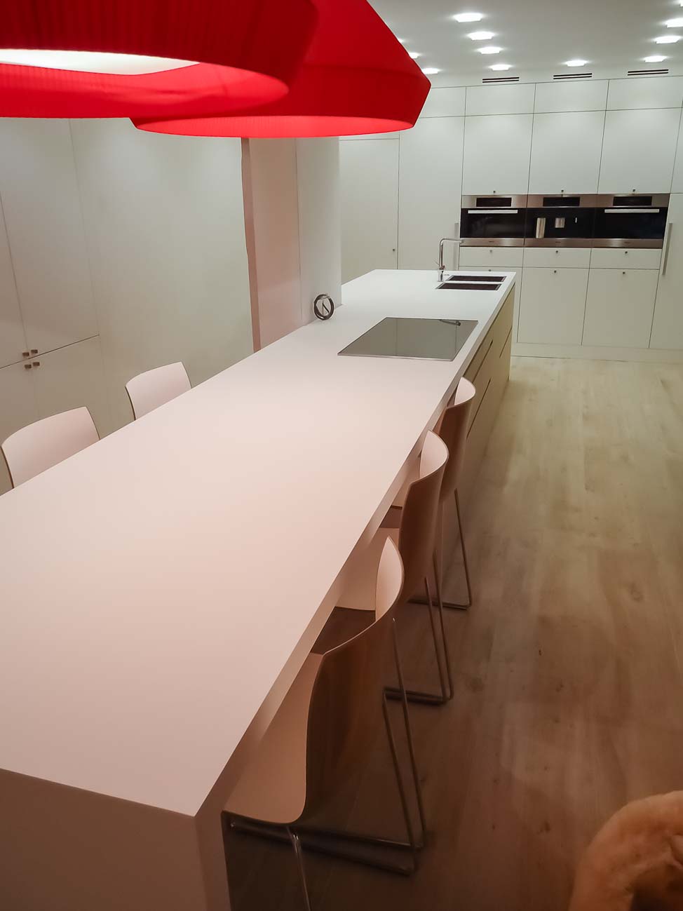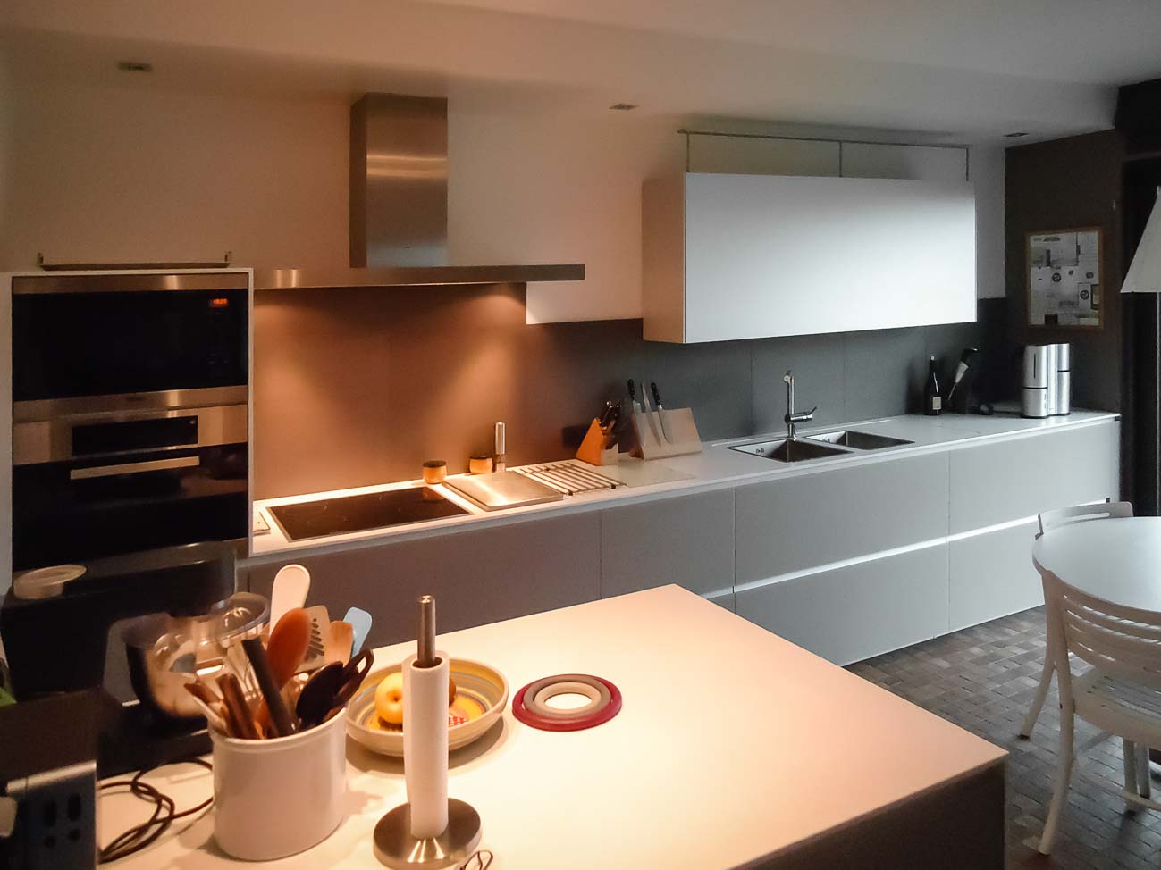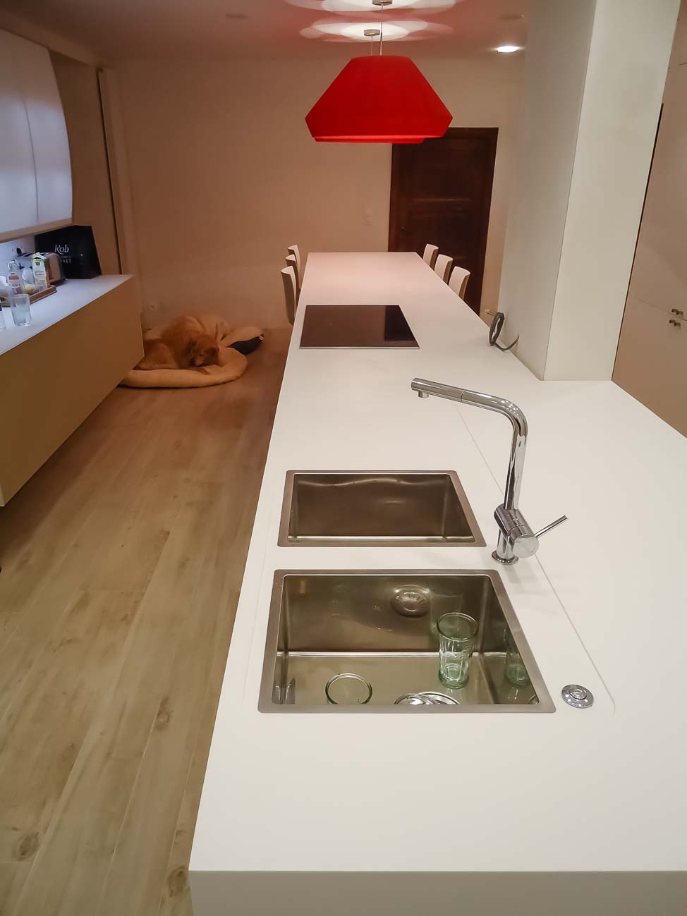 • Cuisine, meuble et luminaire avec du verre blanc, du bois et du Corian blanc :