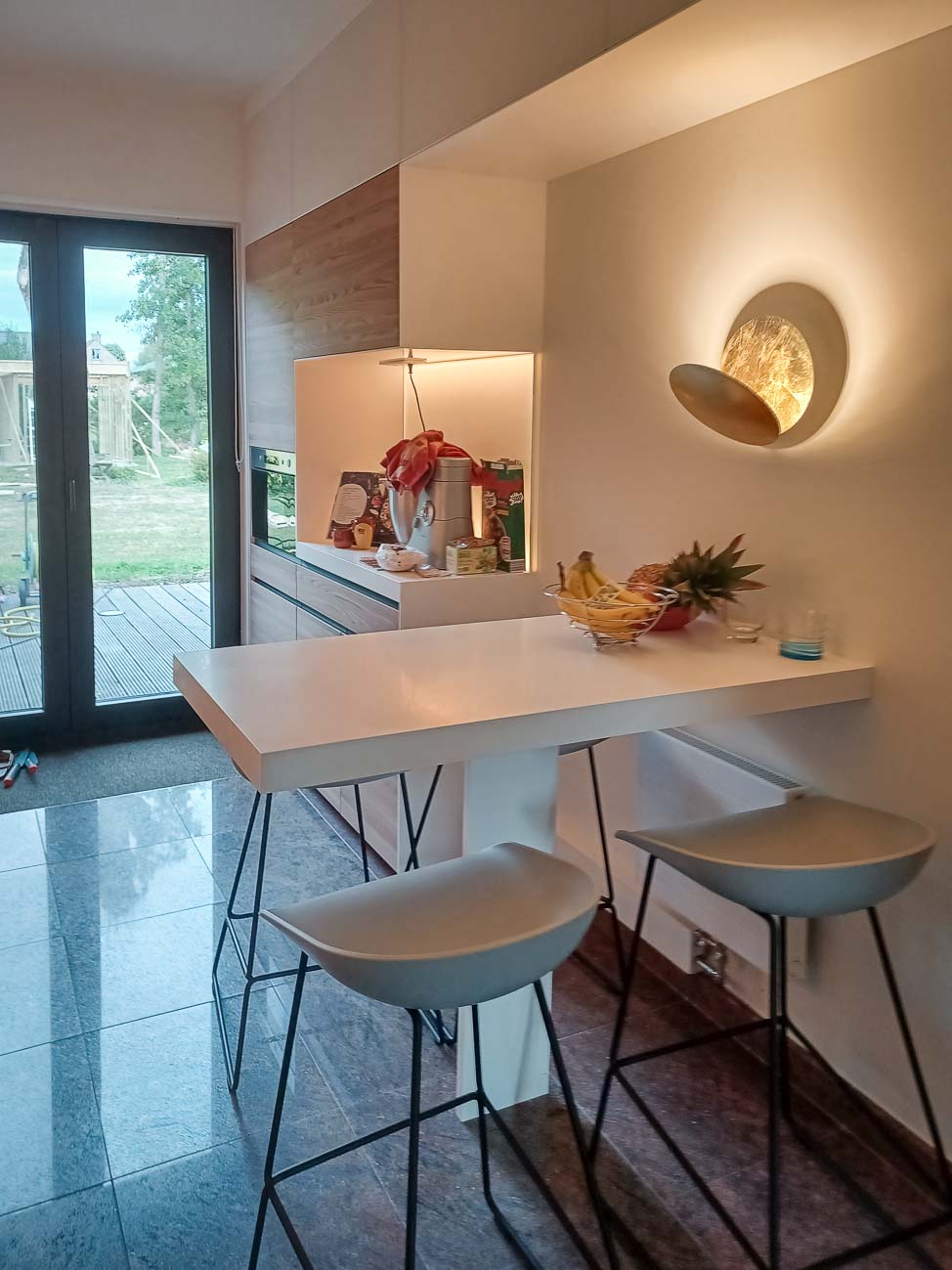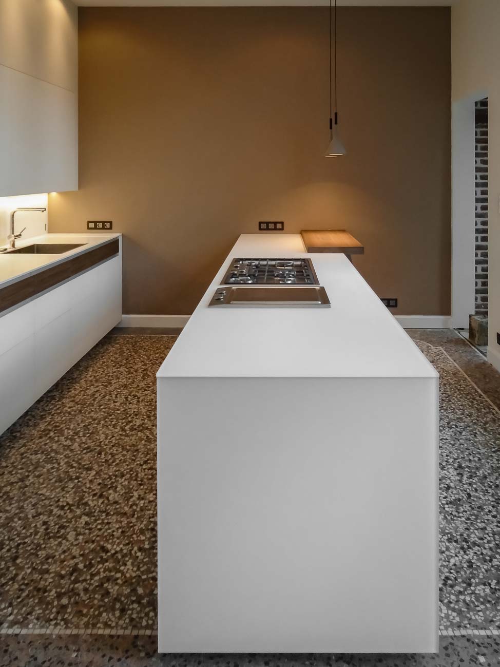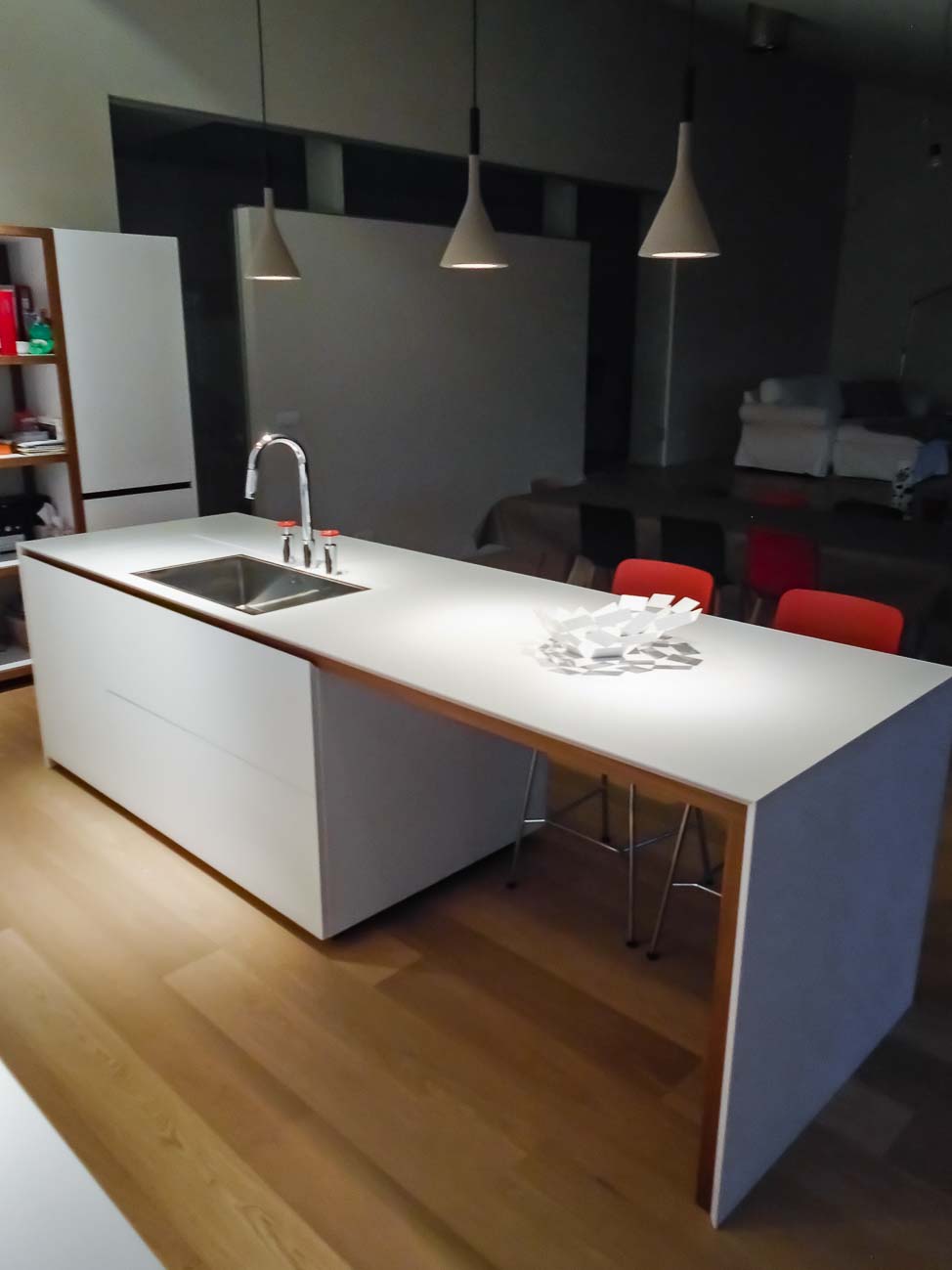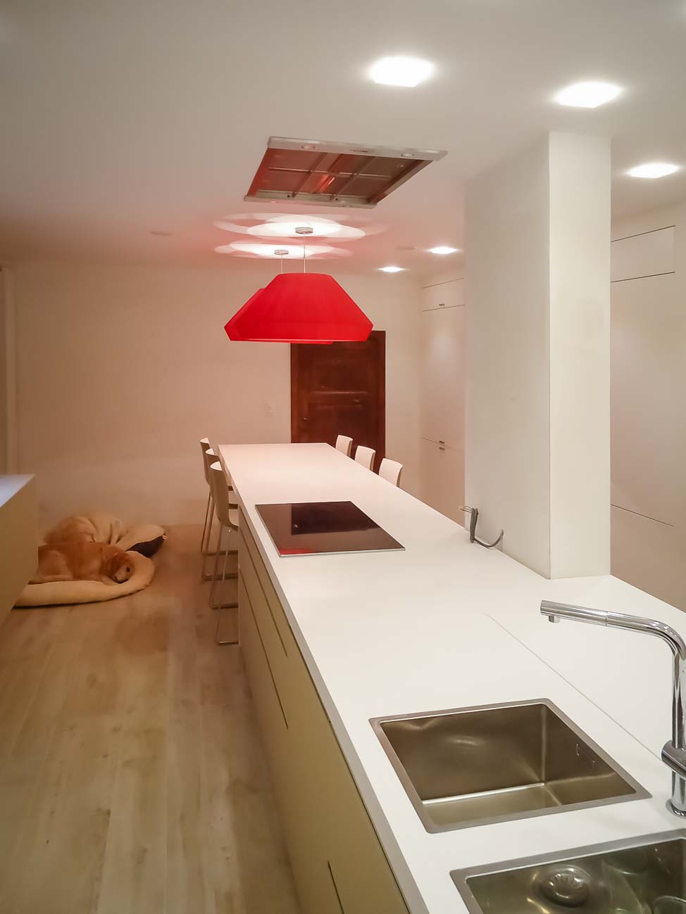 • Cuisine, meuble et luminaire avec du verre blanc, du bois et du Corian blanc :