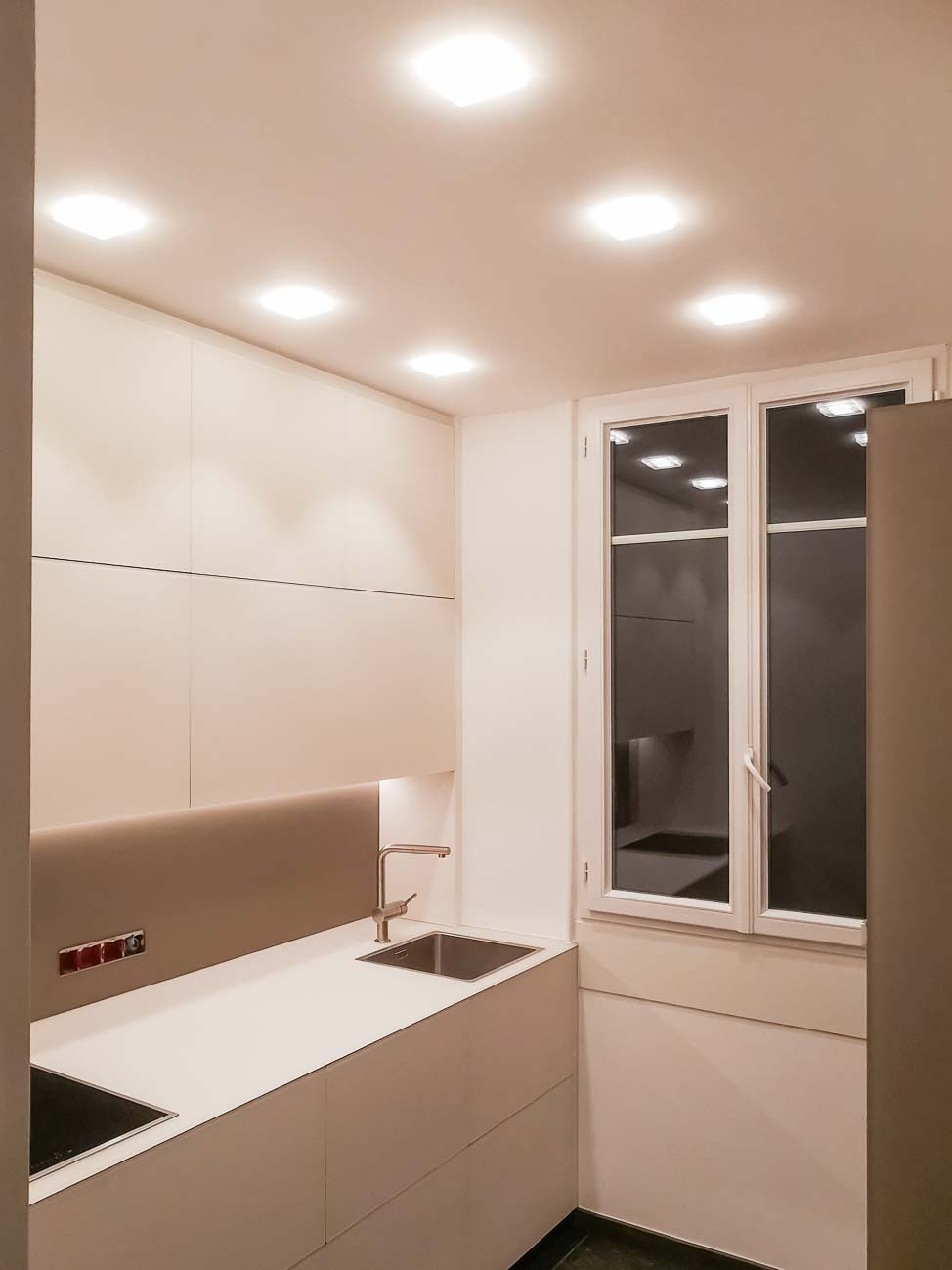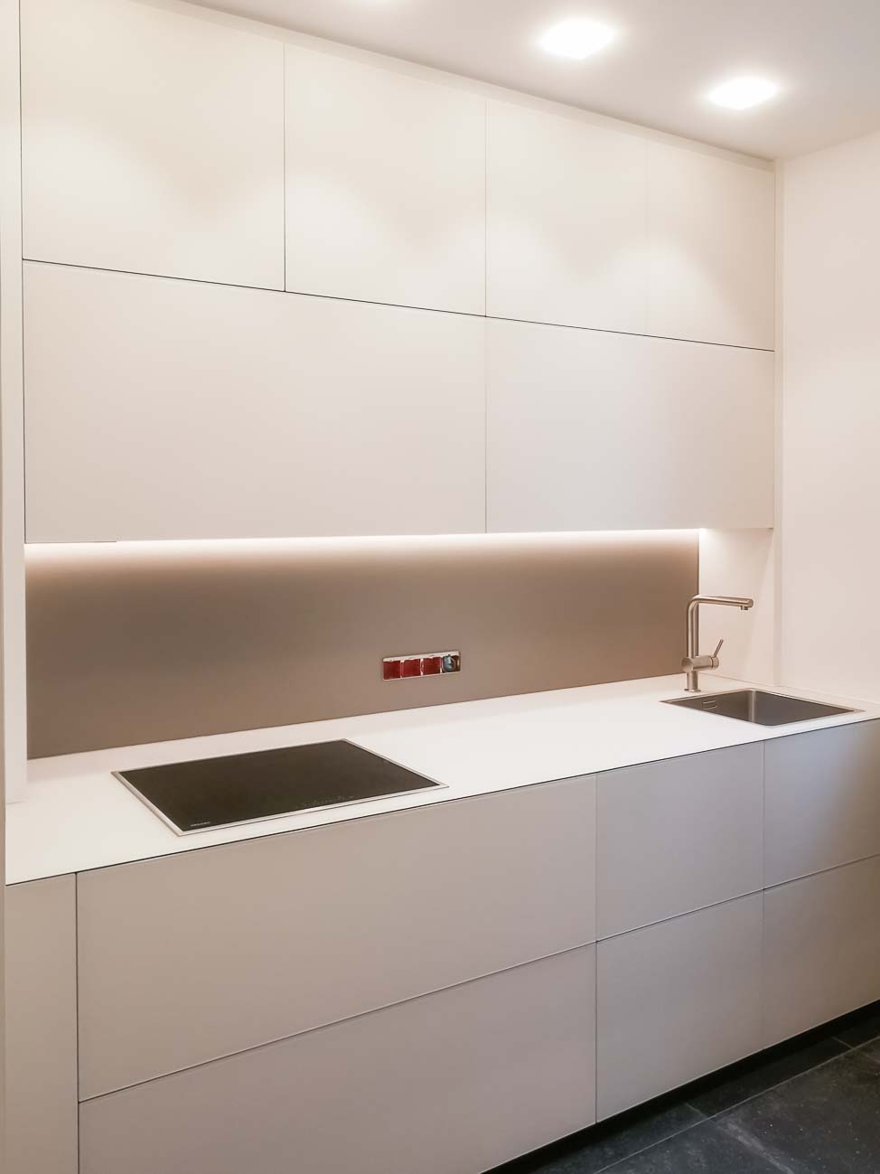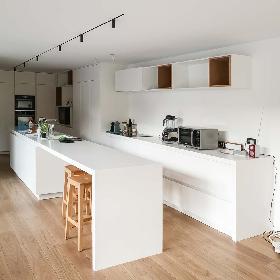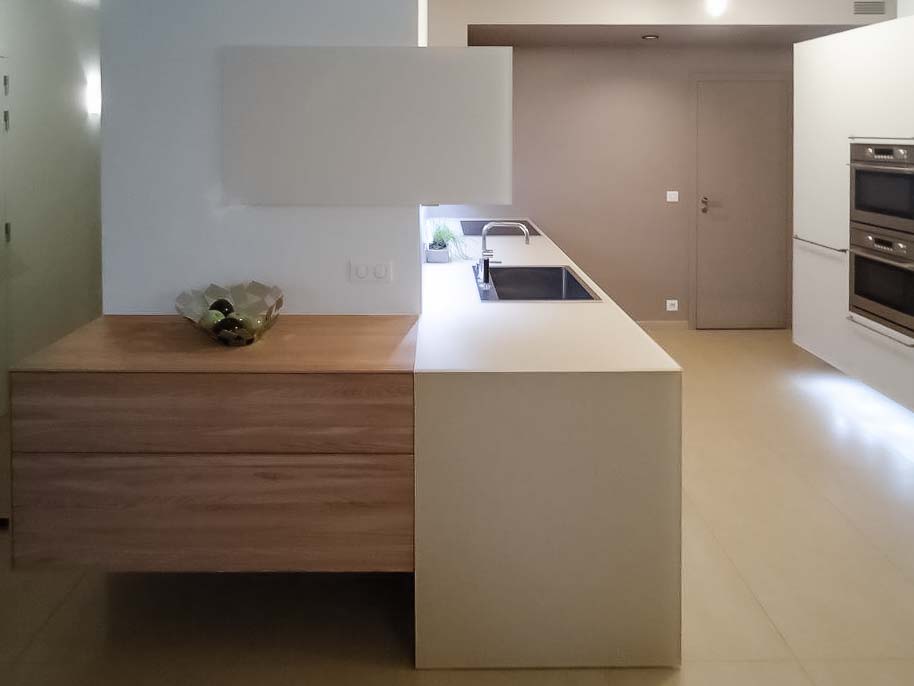 • Cuisine design minimaliste blanche laqué mat, plan de travail en Corian blanc bords épais avec meubles personnalisés :