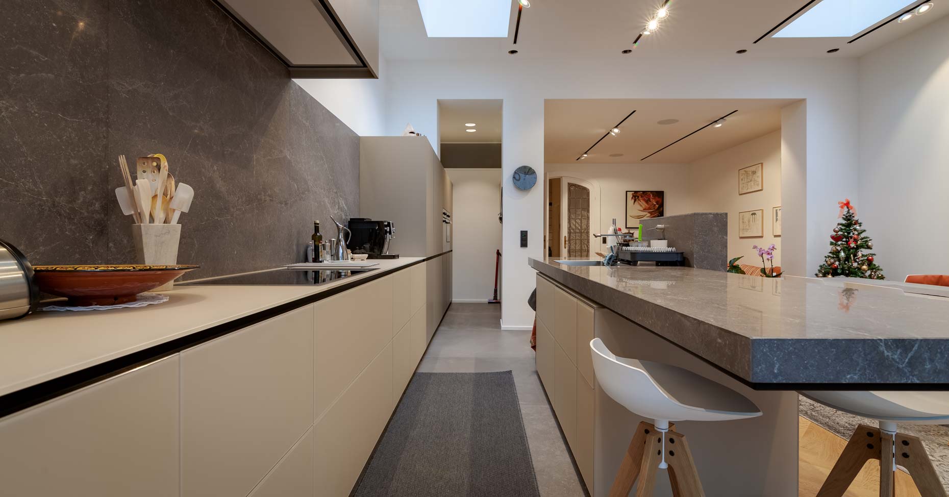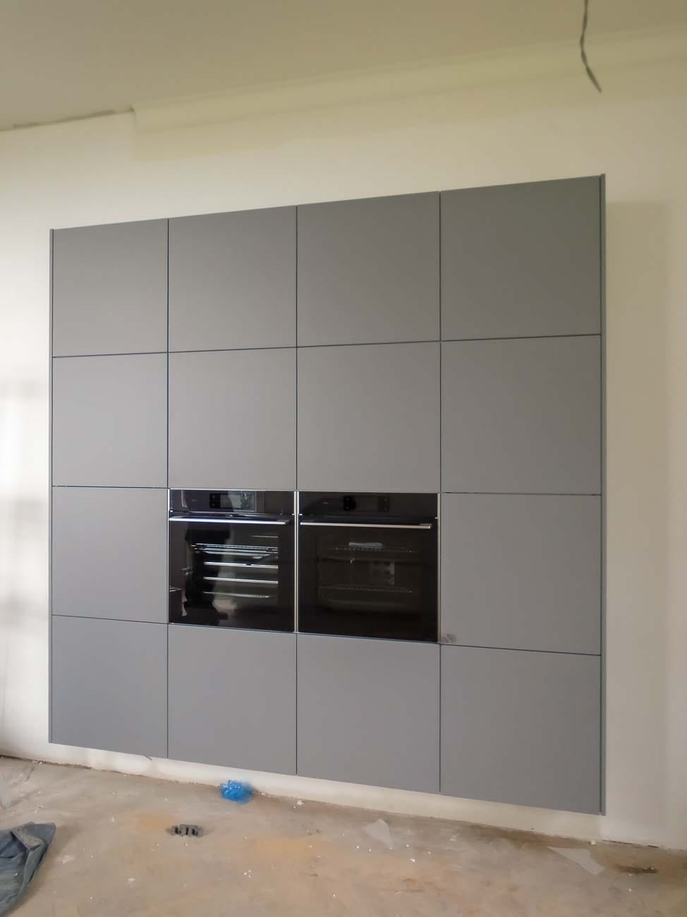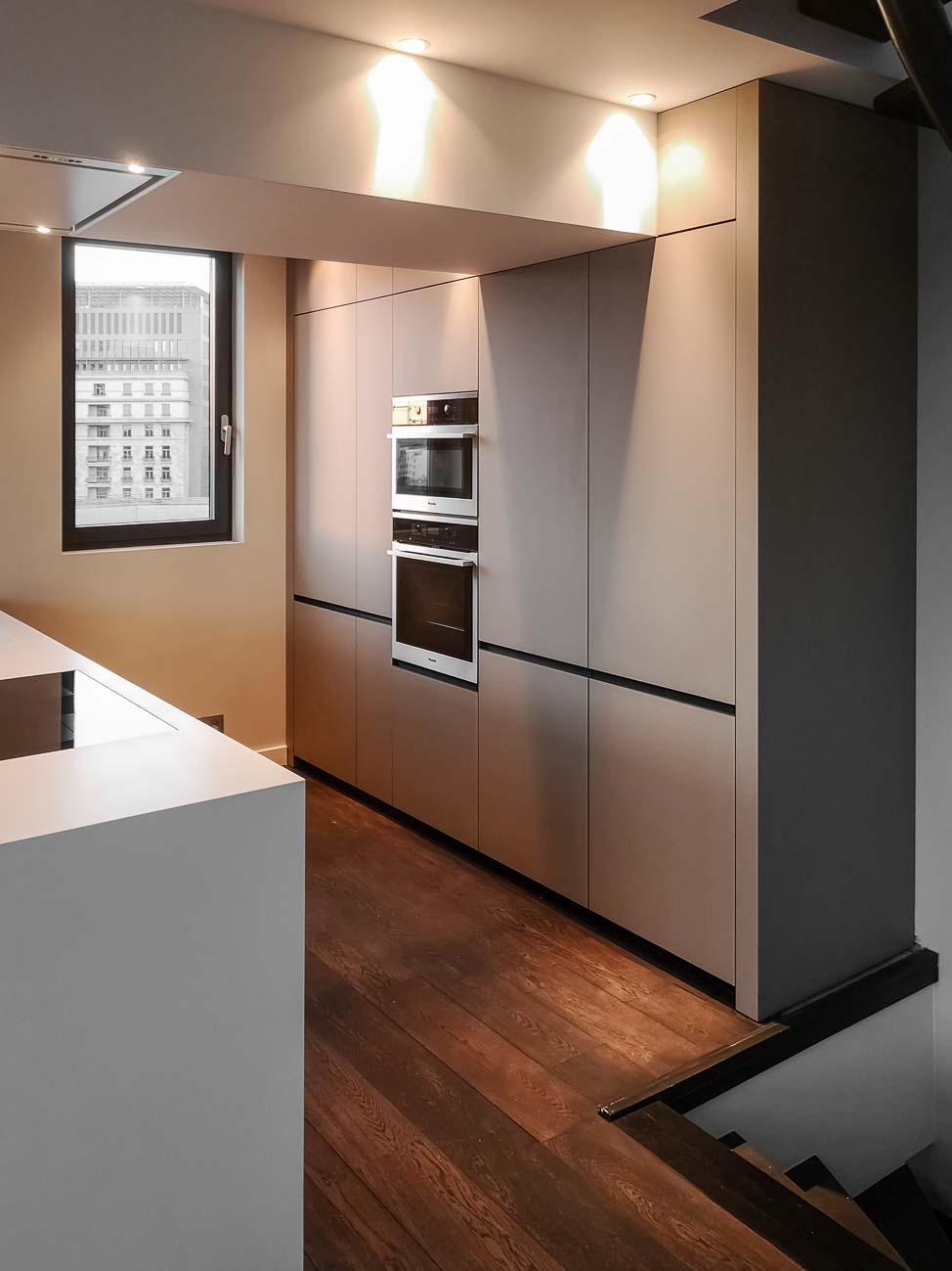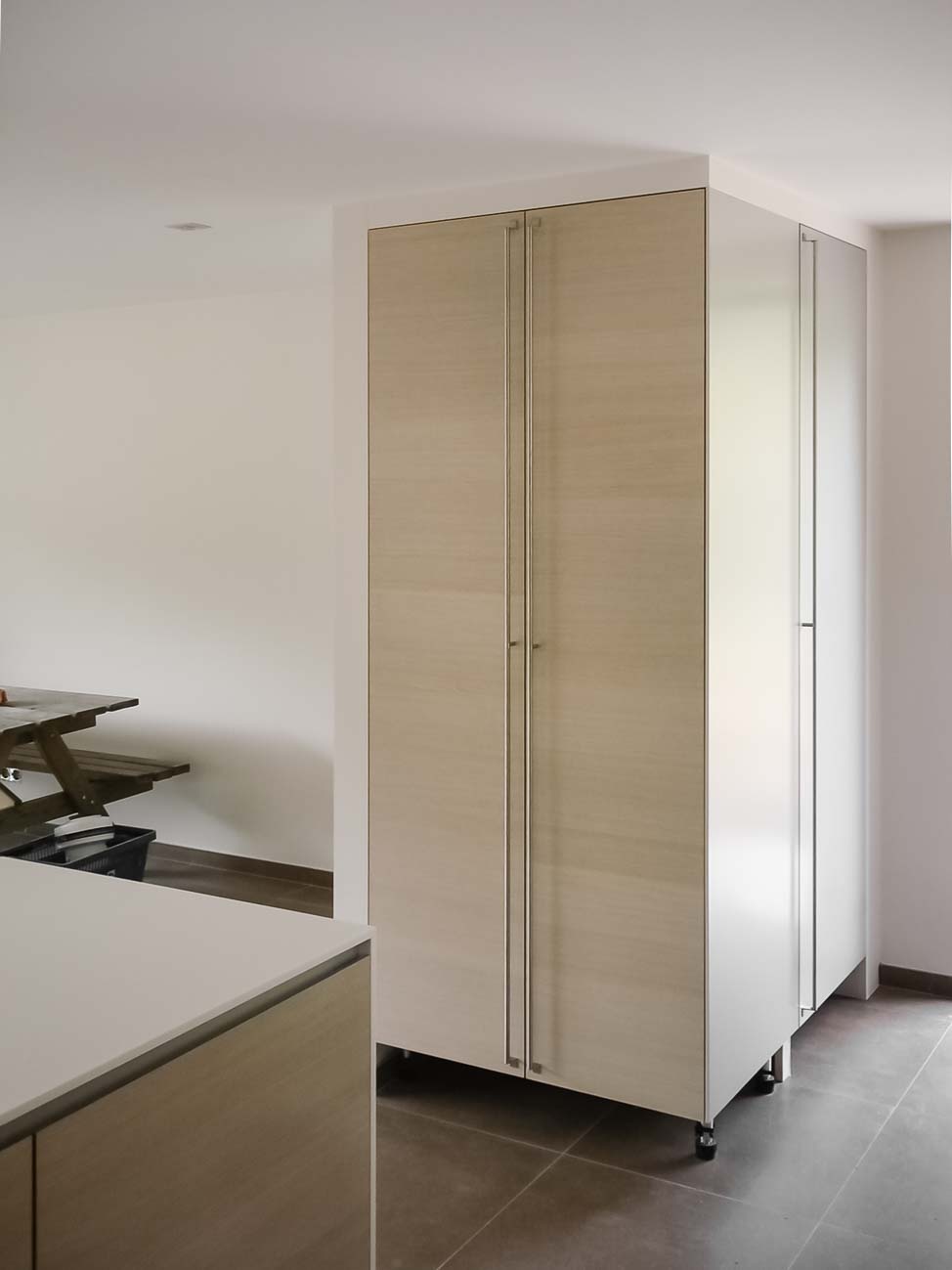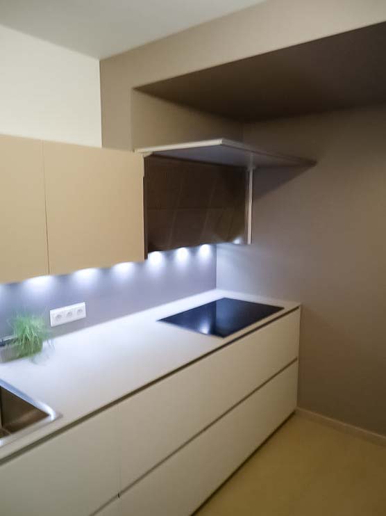 • Cuisine en bois et gris beige avec long mur entièrement meublé de rangements sur mesure avec portes invisibles donnant accès aux autres pièces :