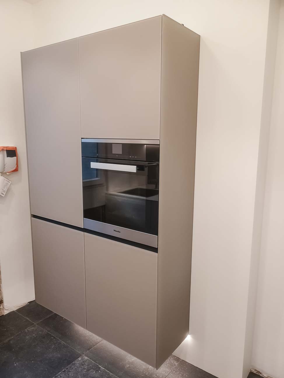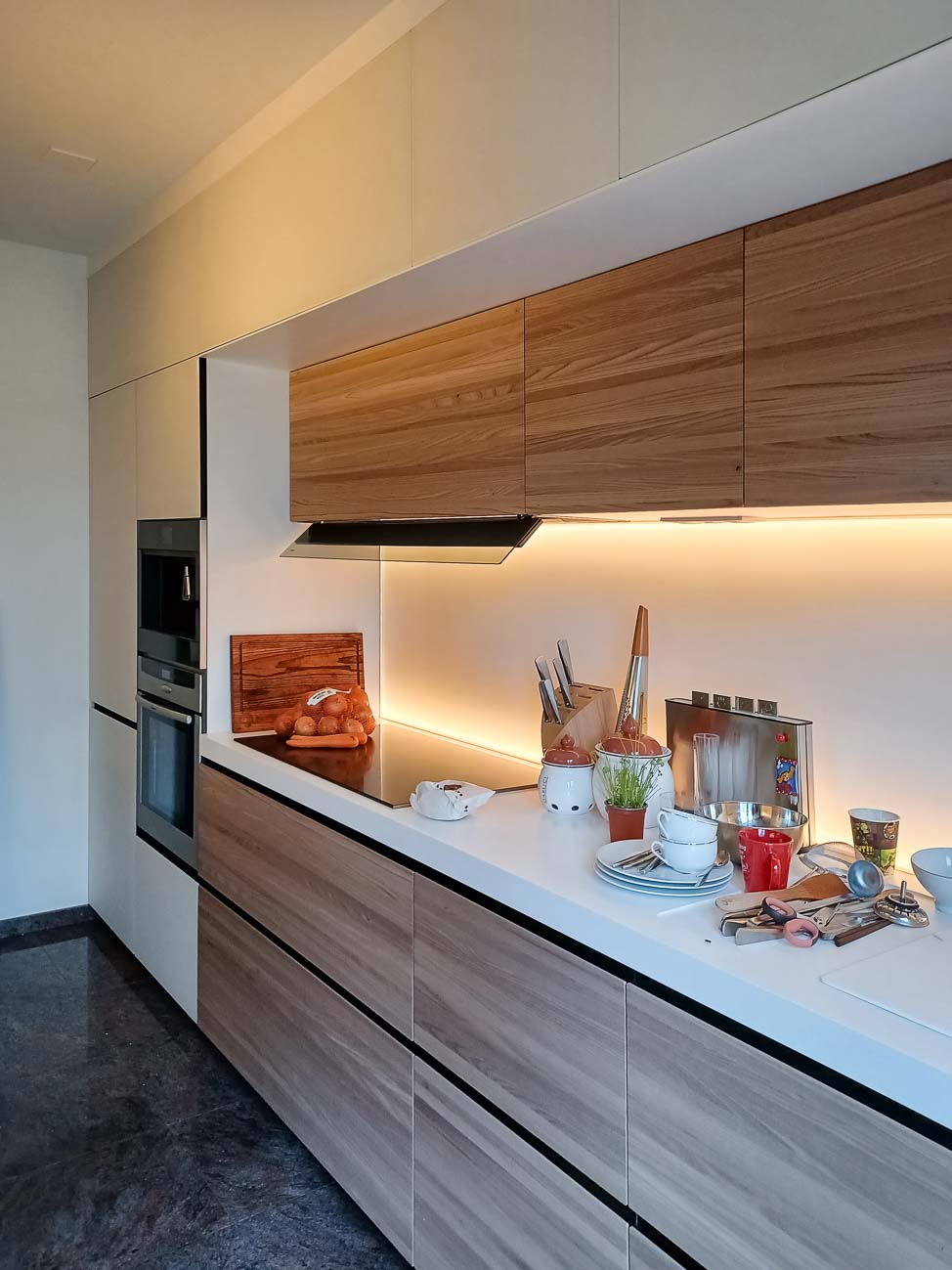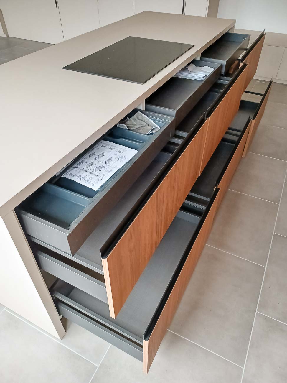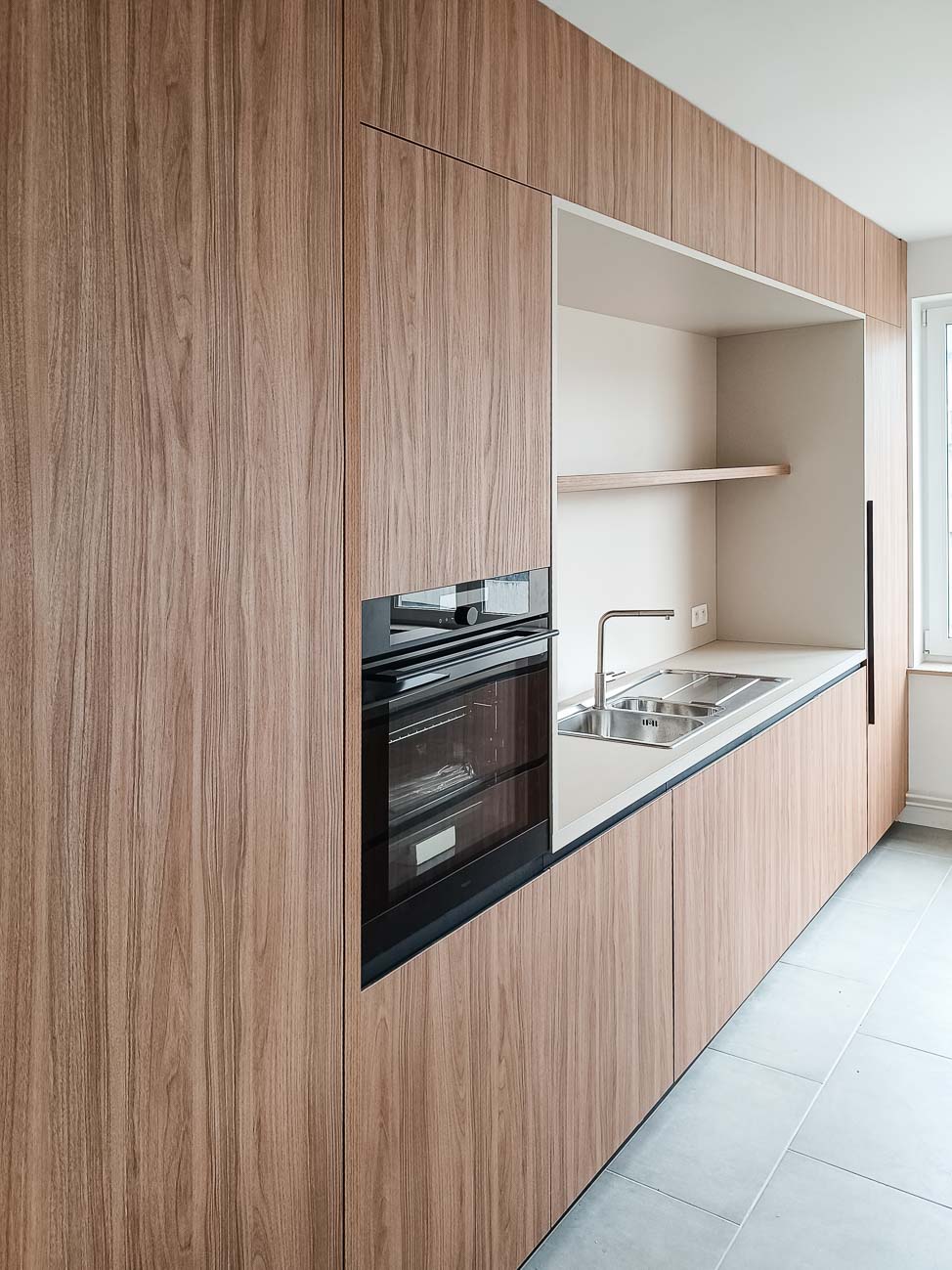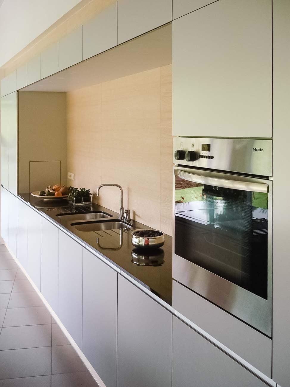 • Cuisine en bois et gris beige avec long mur entièrement meublé de rangements sur mesure avec portes invisibles donnant accès aux autres pièces :