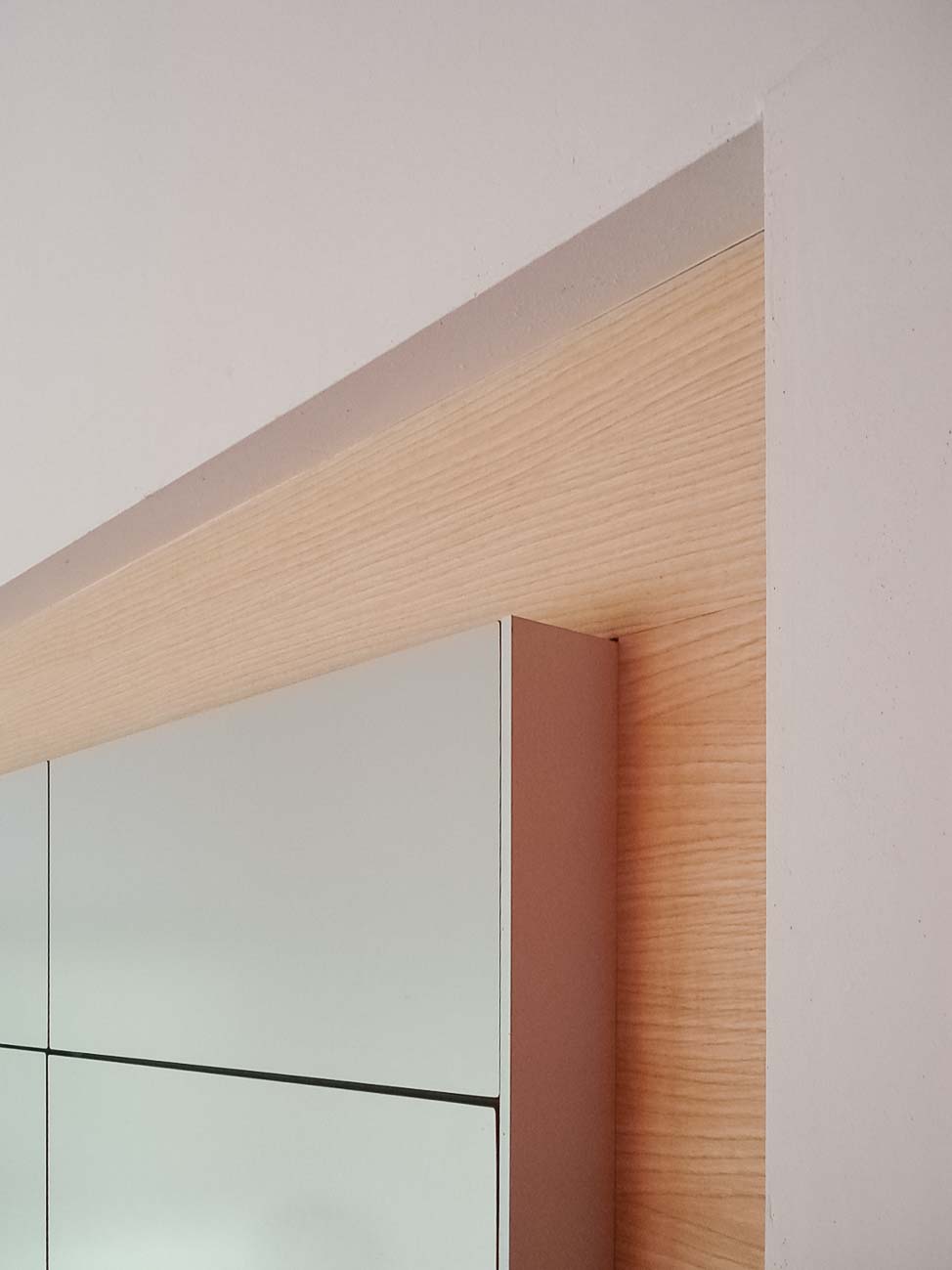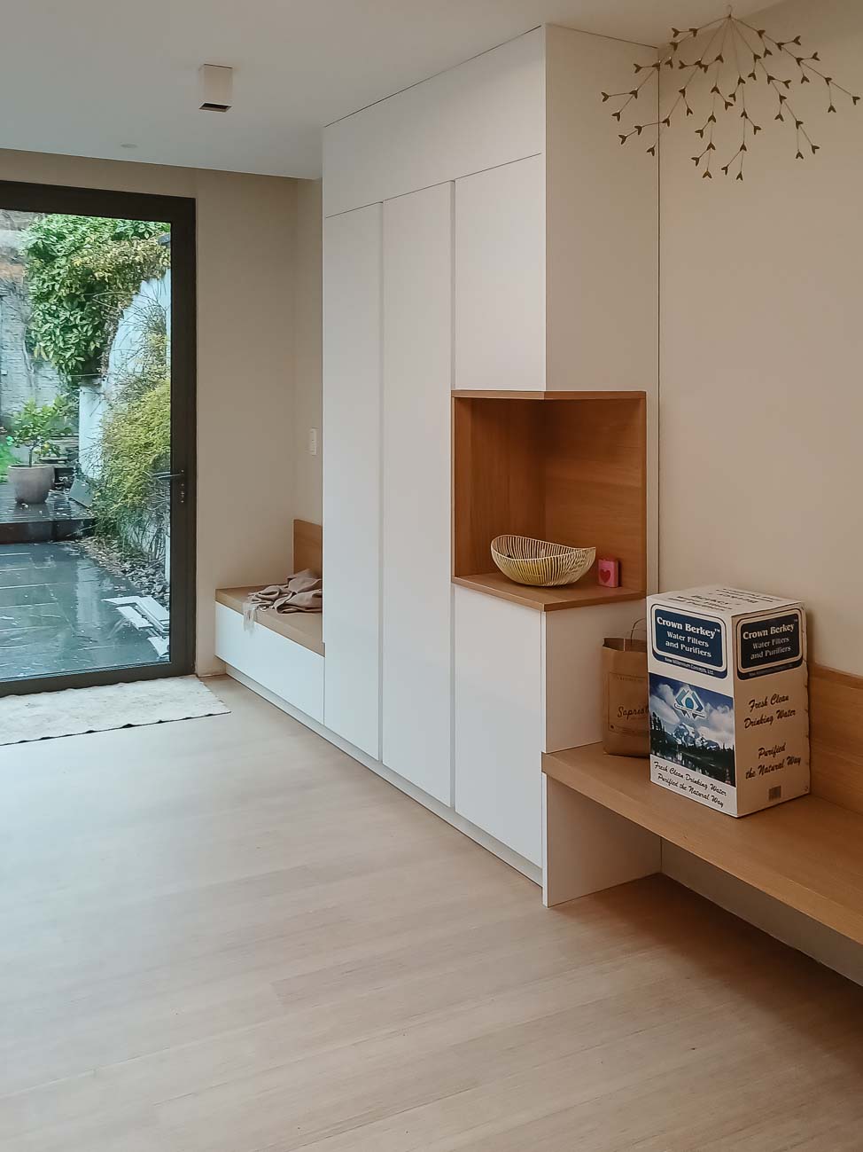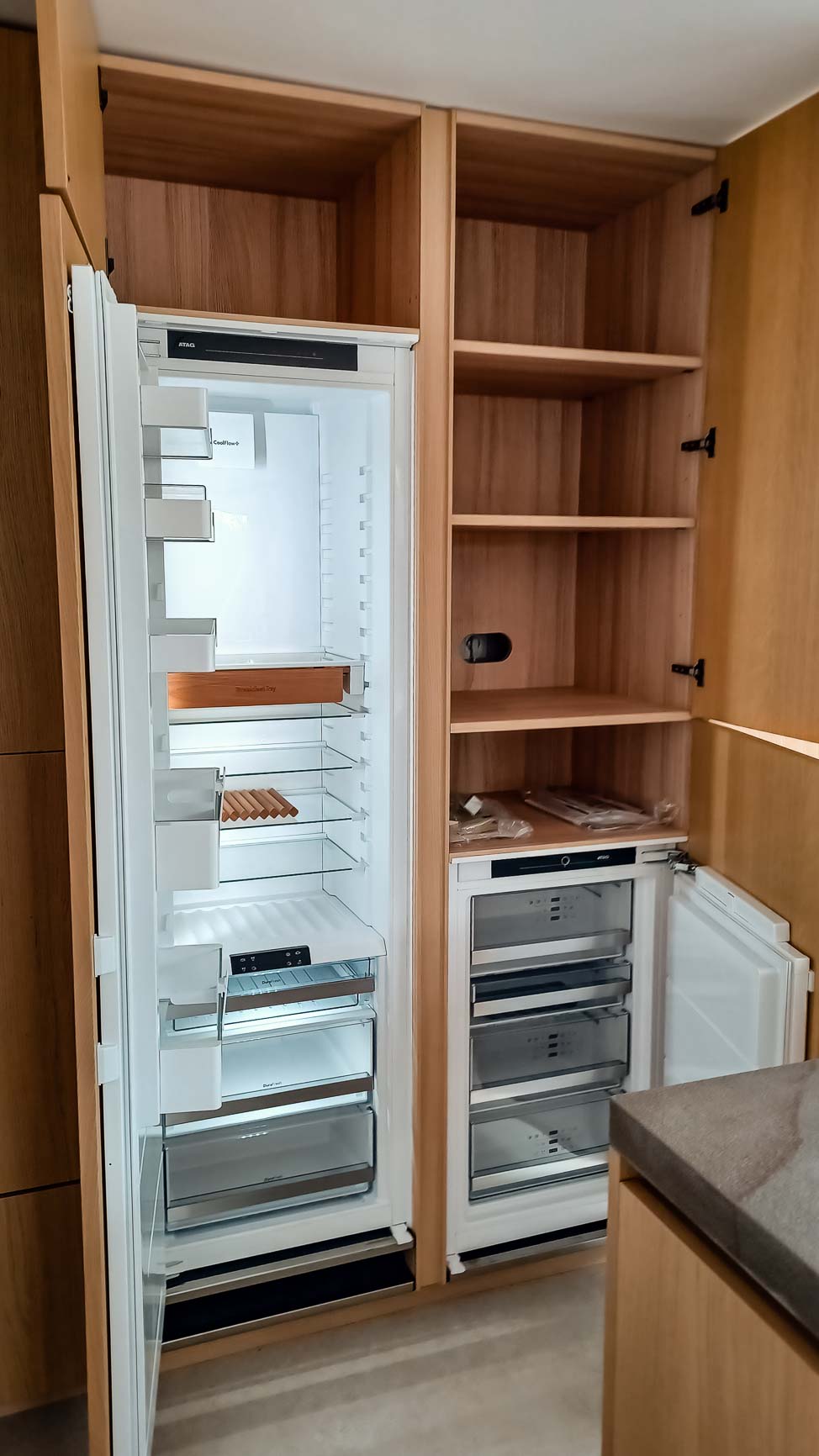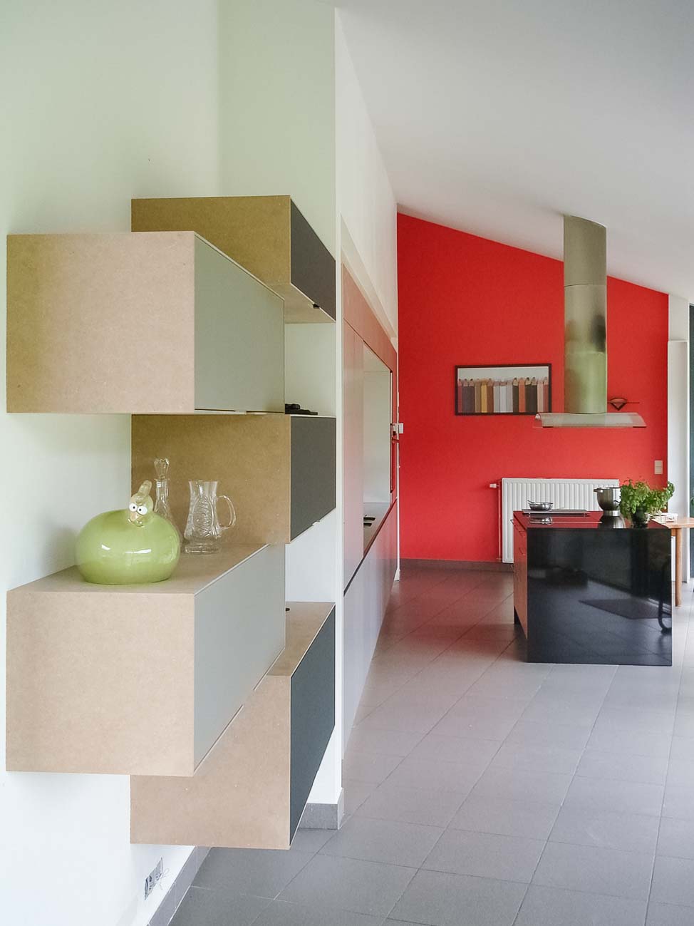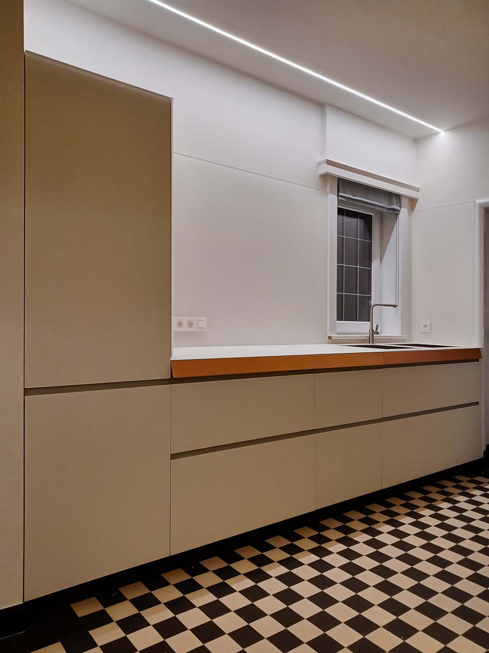 • Cuisine en bois et gris beige avec long mur entièrement meublé de rangements sur mesure avec portes invisibles donnant accès aux autres pièces :
