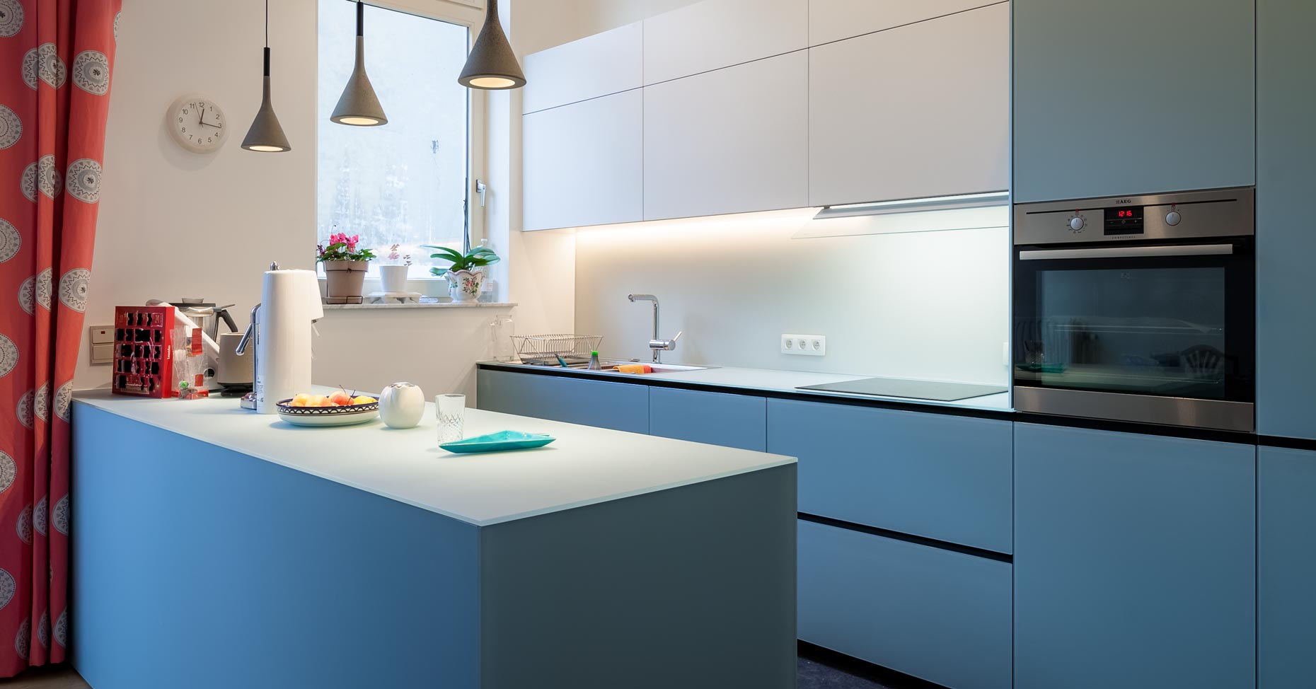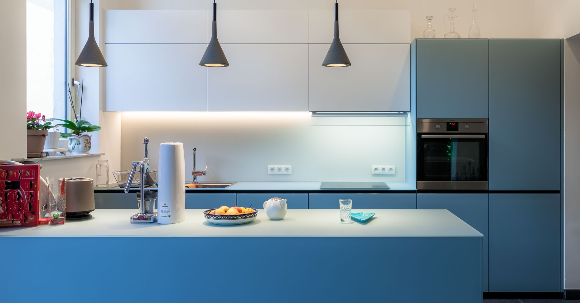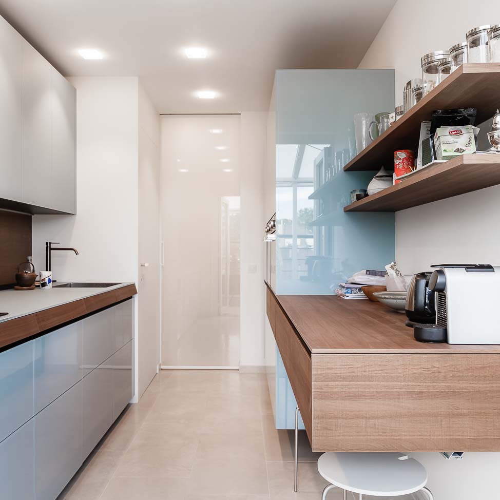 • cuisine blanche sur mesure, meubles bas en verre bleu et plan de travail en Corian :