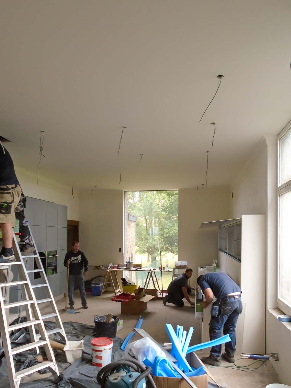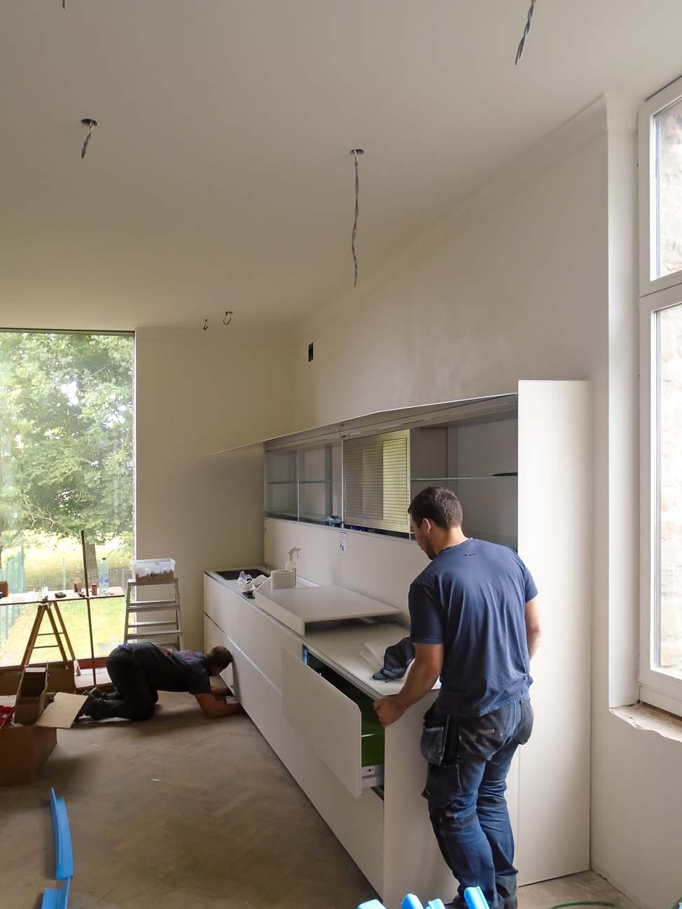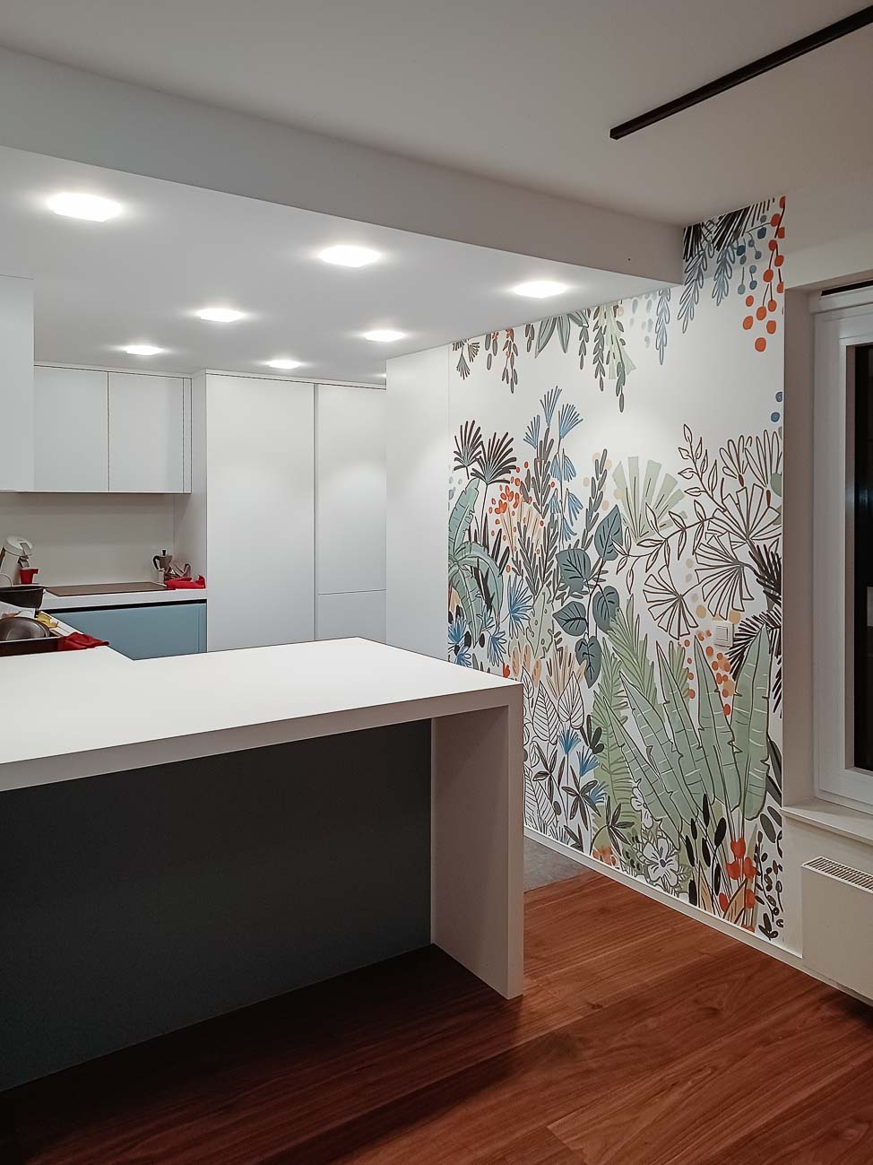 • cuisine blanche sur mesure, meubles bas en verre bleu et plan de travail en Corian :