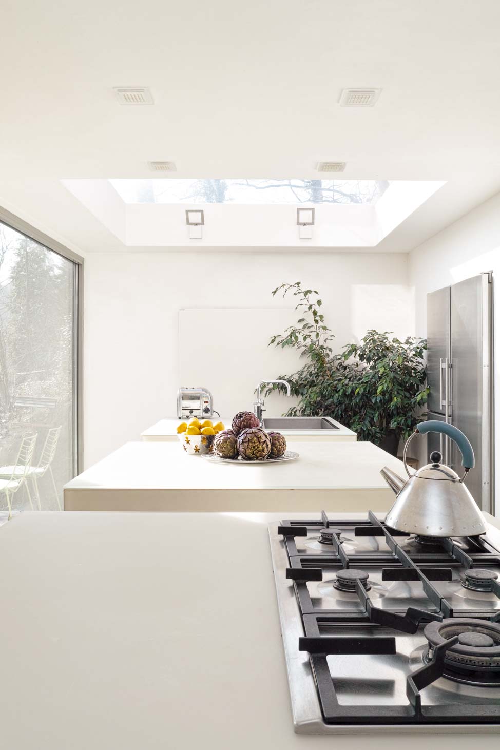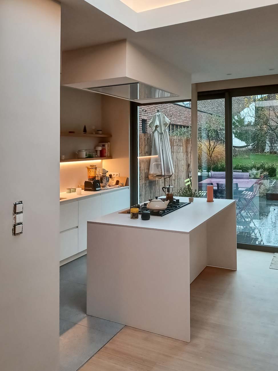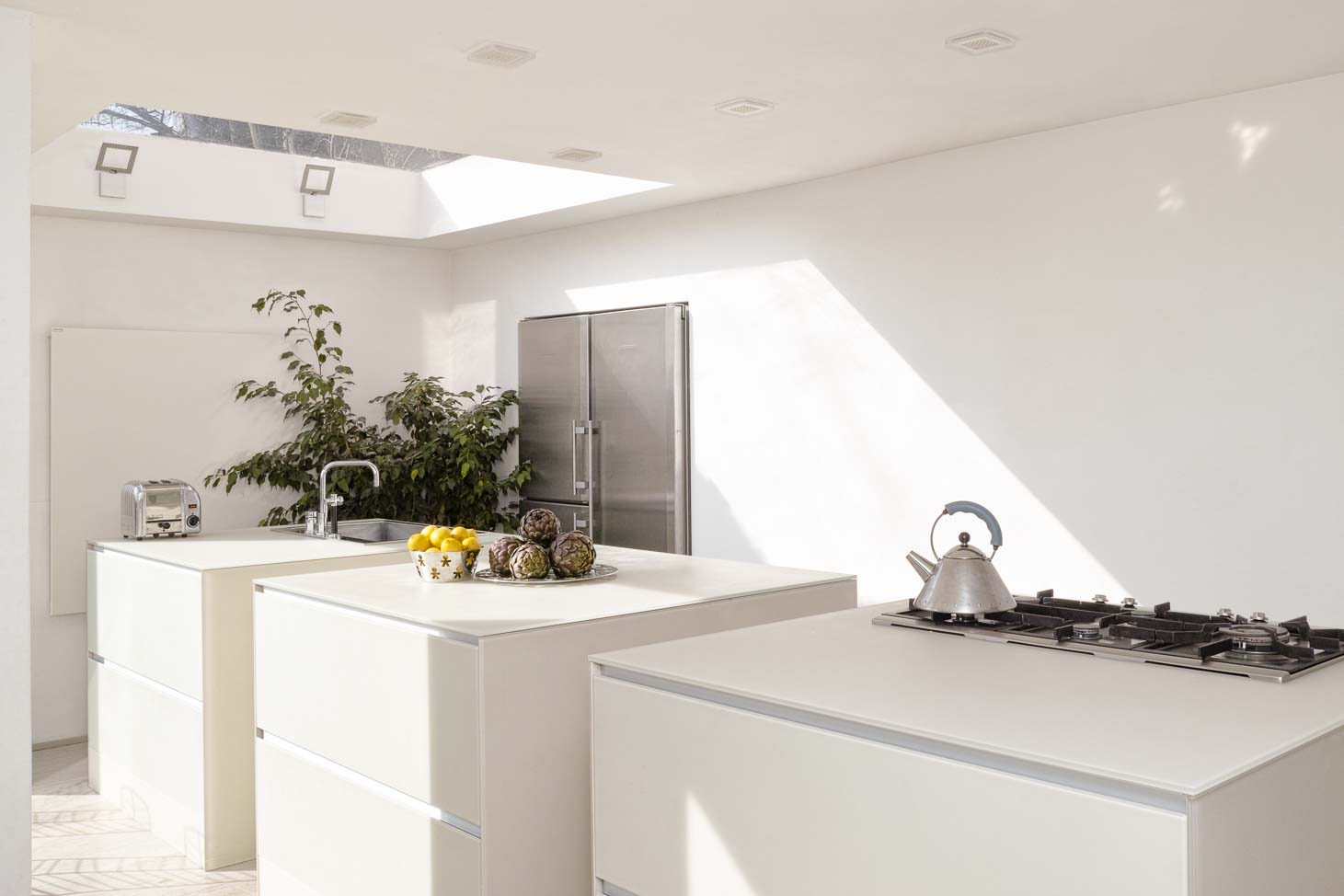 • Cuisine design minimaliste avec trois îlots cubiques en verre avec plan de travail en Corian blanc, composition murale en laqué mat et hotte plafond sur mesure :