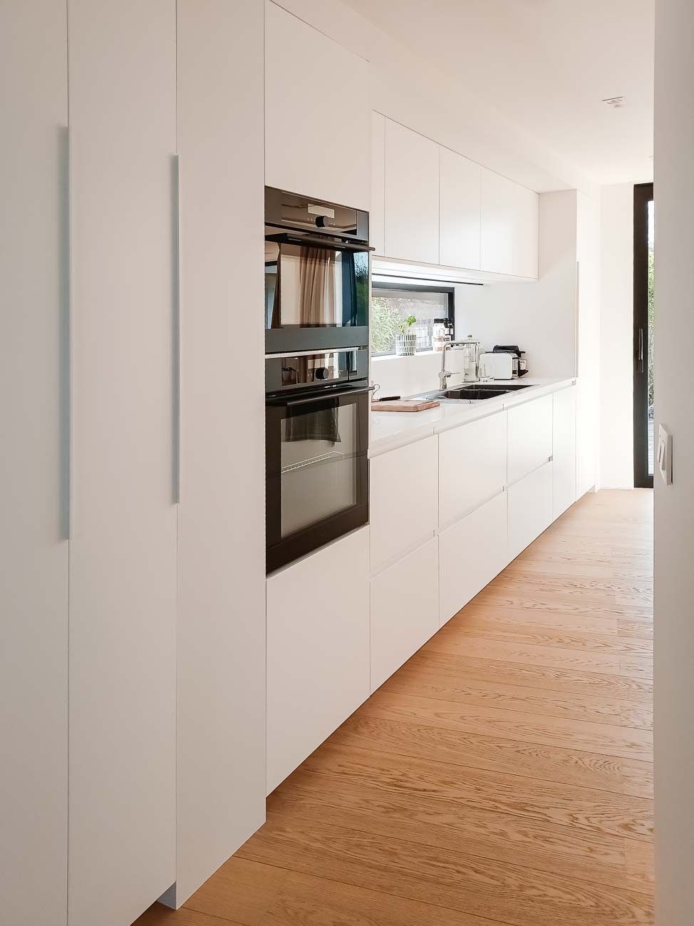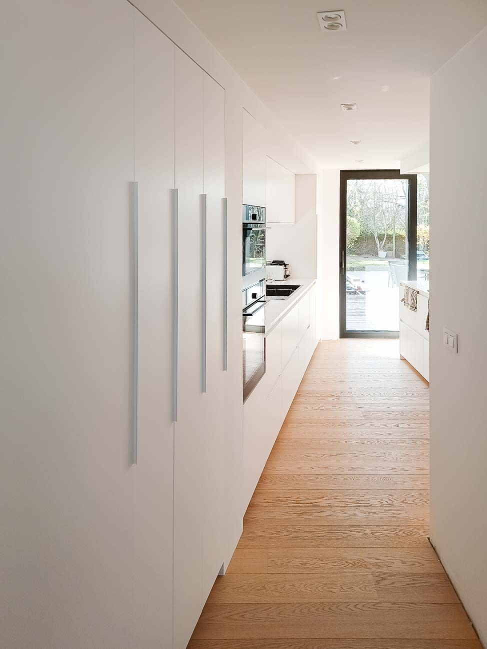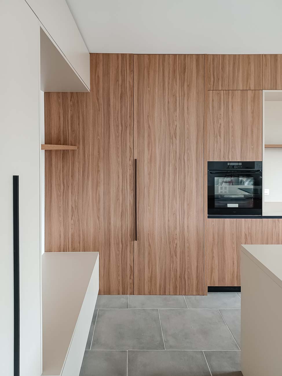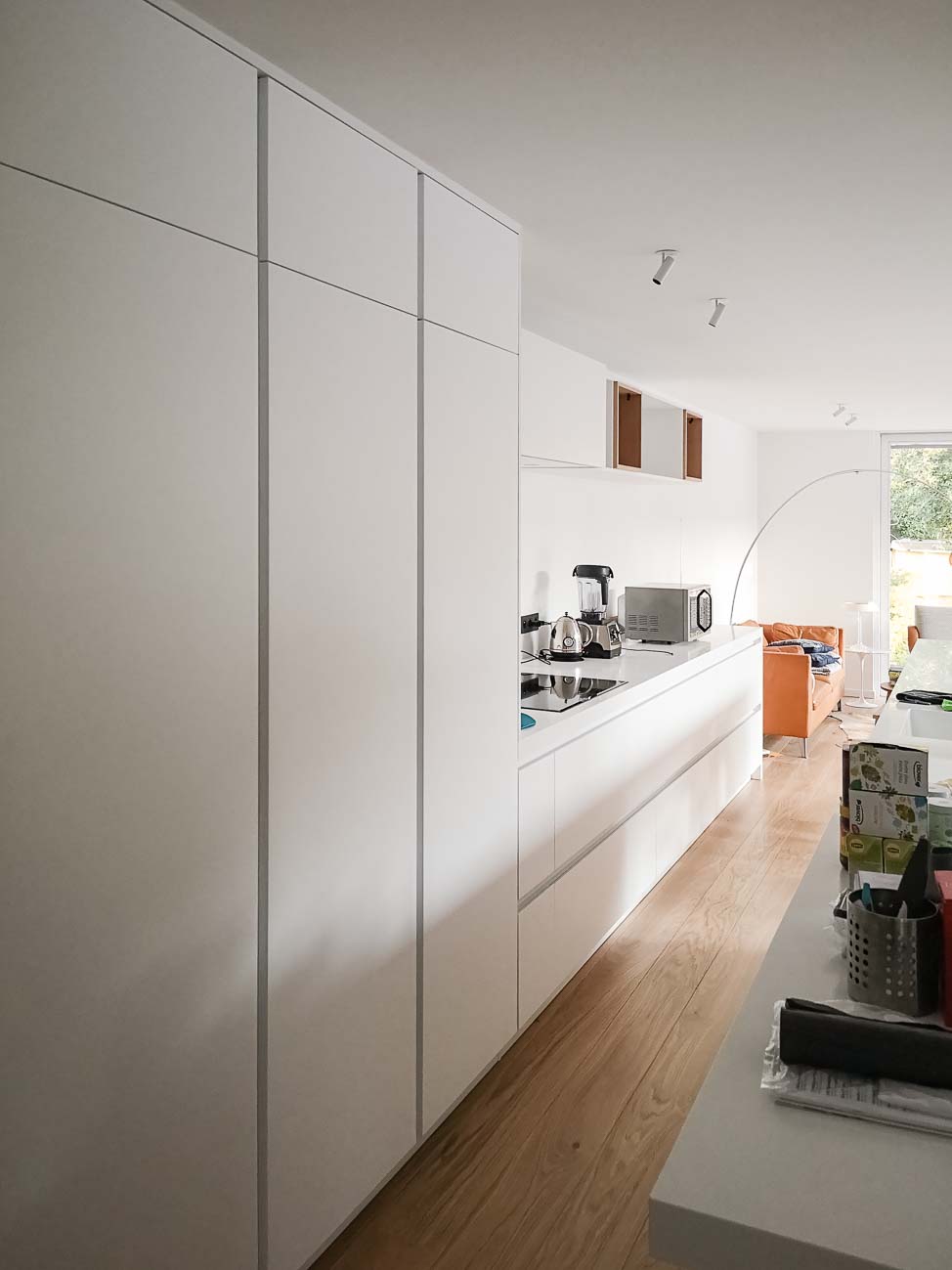 • Cuisine blanche minimaliste, meubles bas laqué mat blanc et colonne en plaqué Chêne. Plan de travail et crédence en céramique :