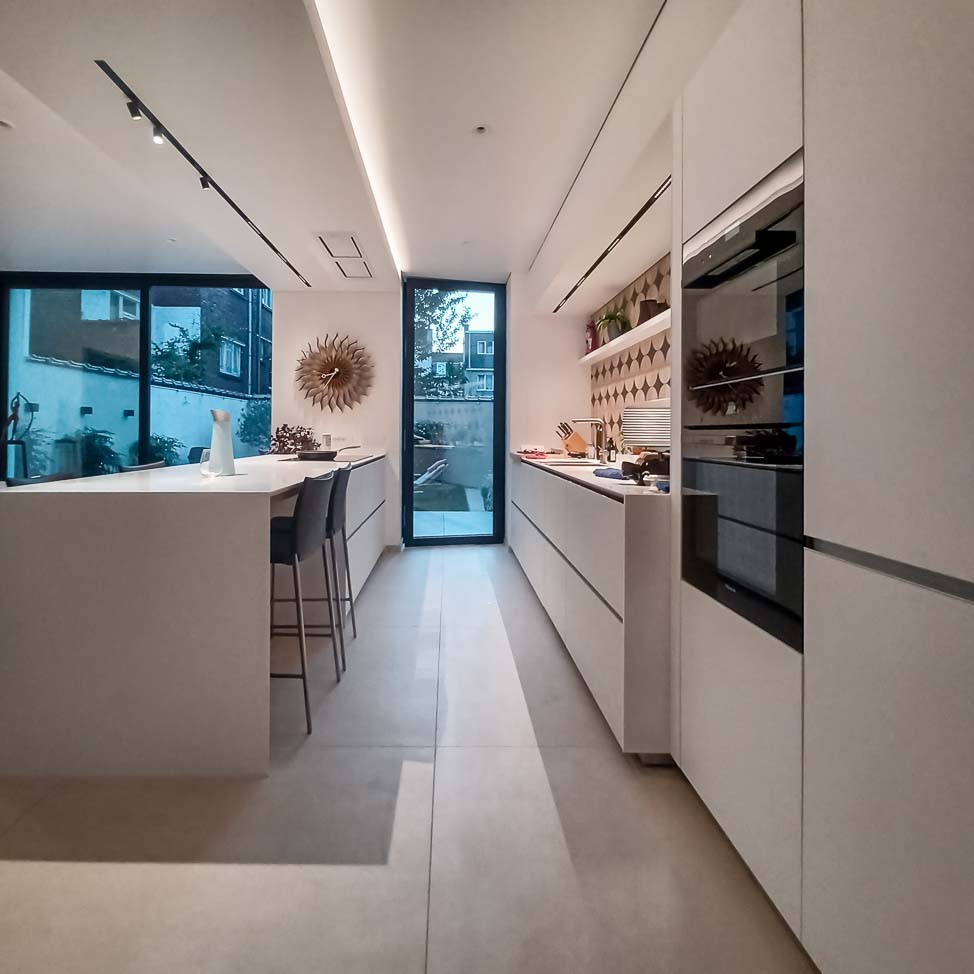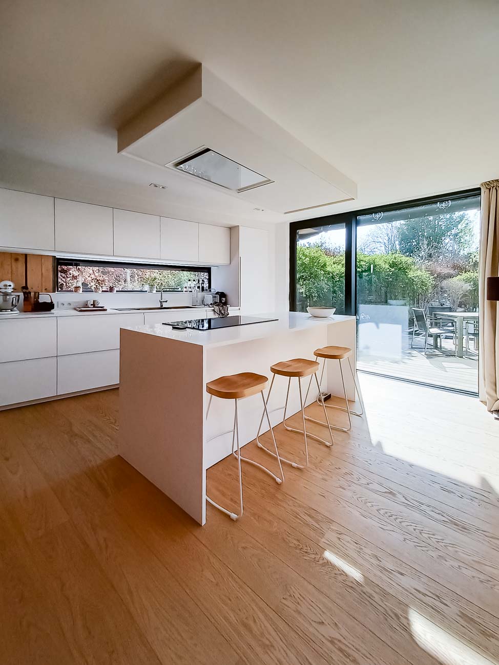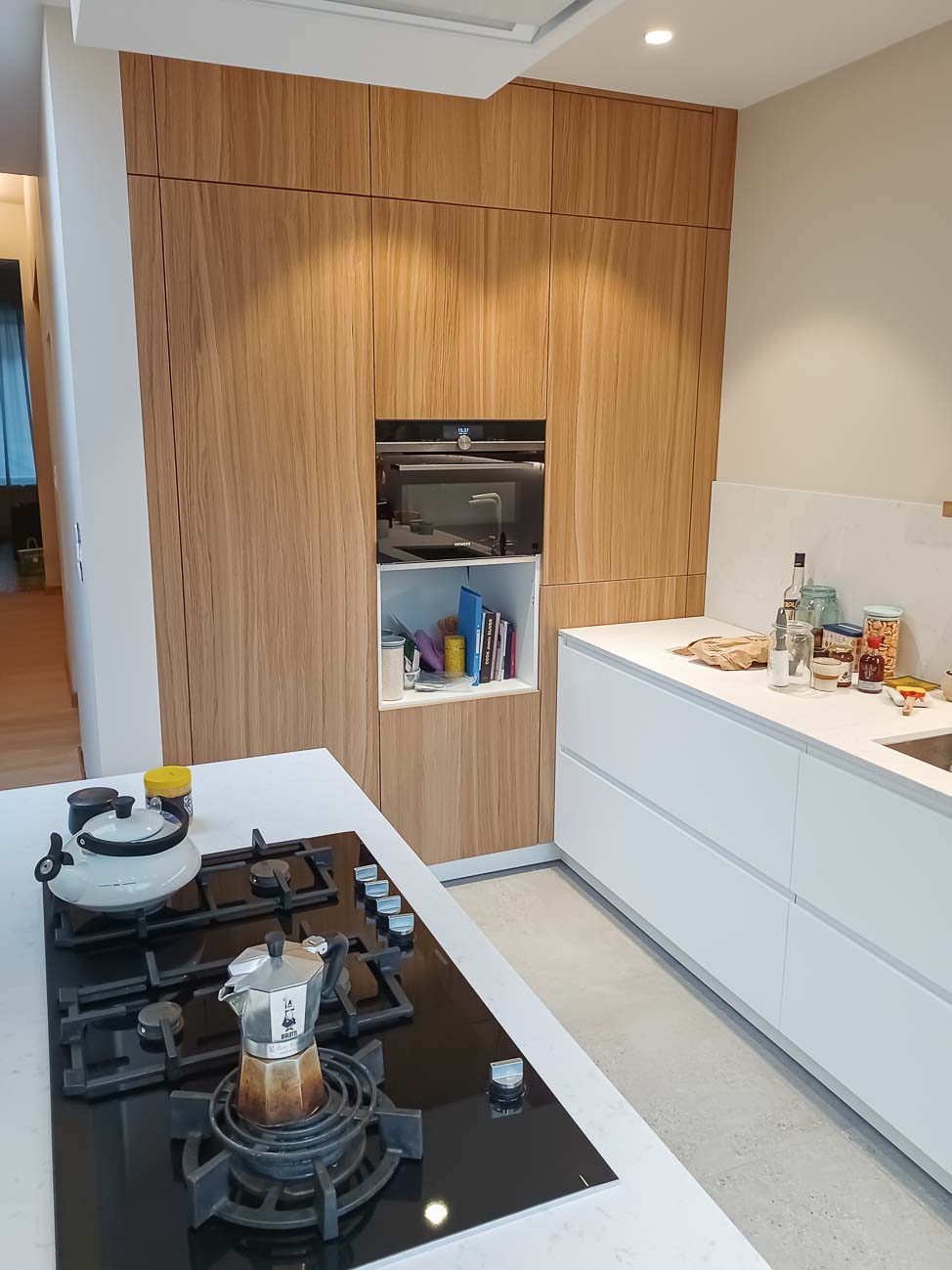 • Cuisine blanche minimaliste, meubles bas laqué mat blanc et colonne en plaqué Chêne. Plan de travail et crédence en céramique :