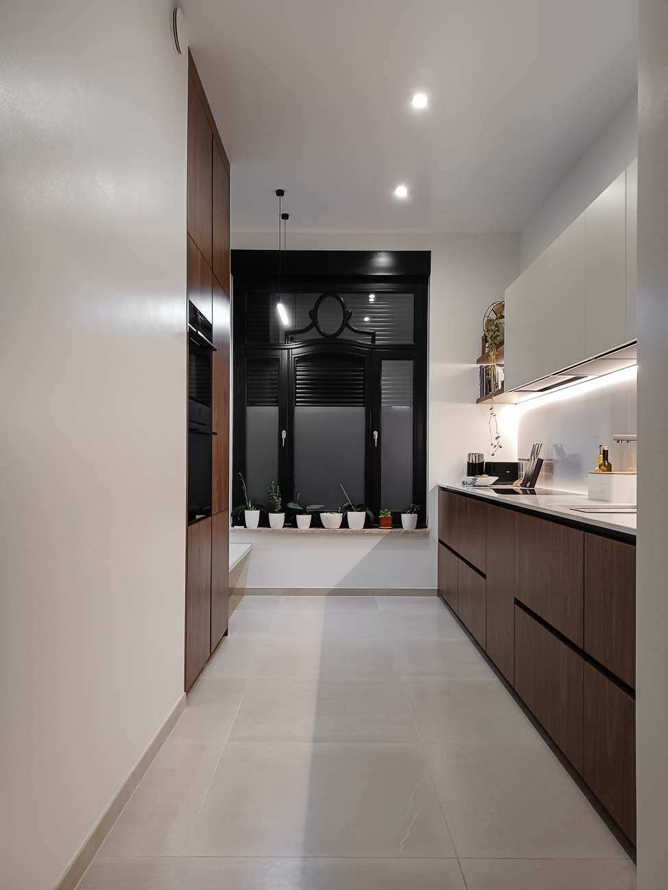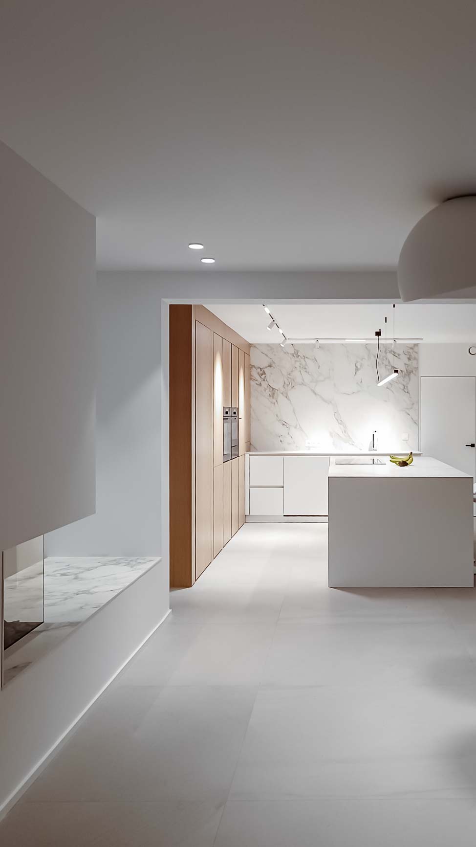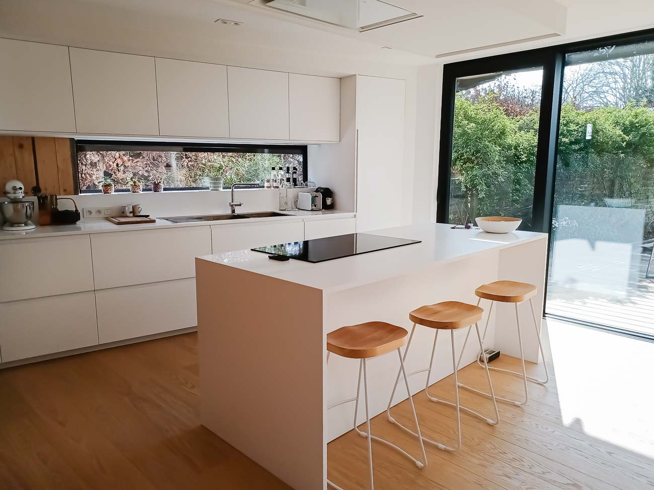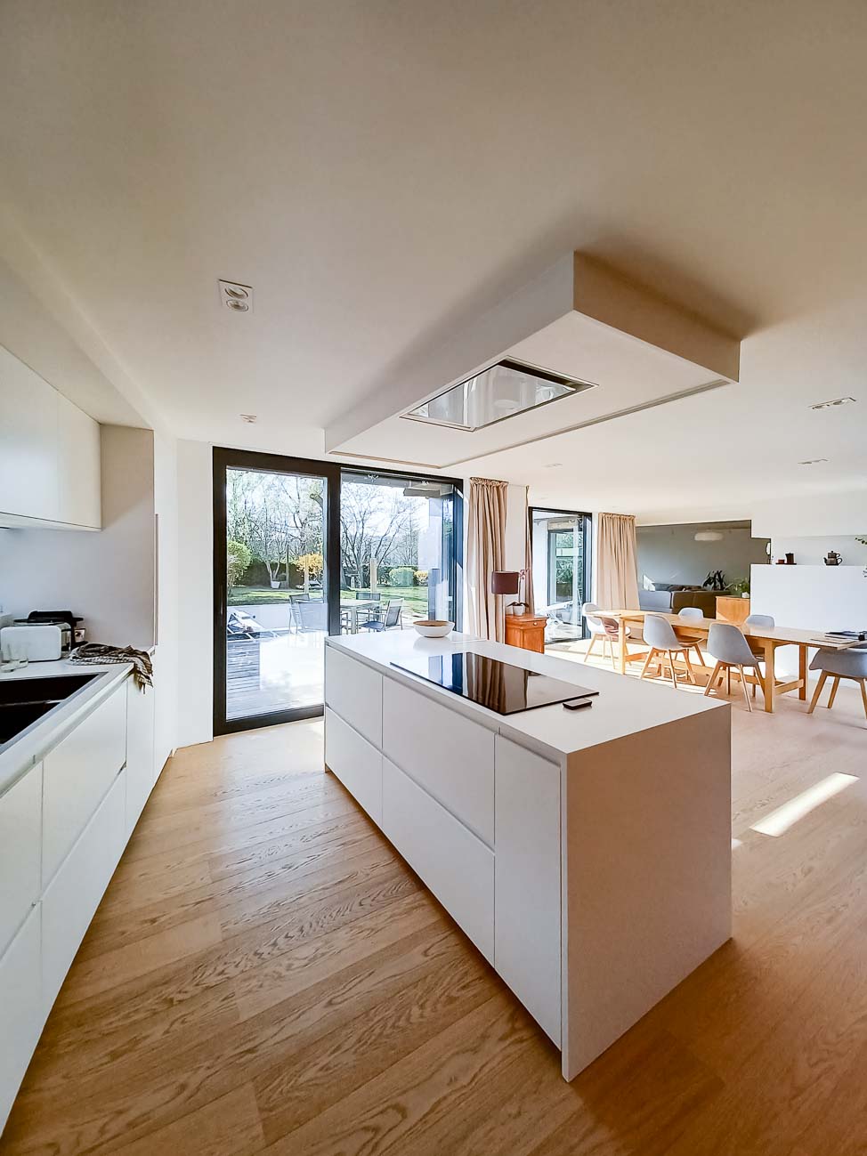 • Cuisine blanche minimaliste, meubles bas laqué mat blanc et colonne en plaqué Chêne. Plan de travail et crédence en céramique :