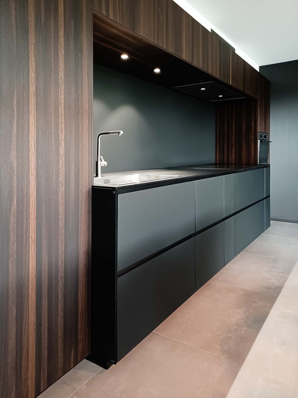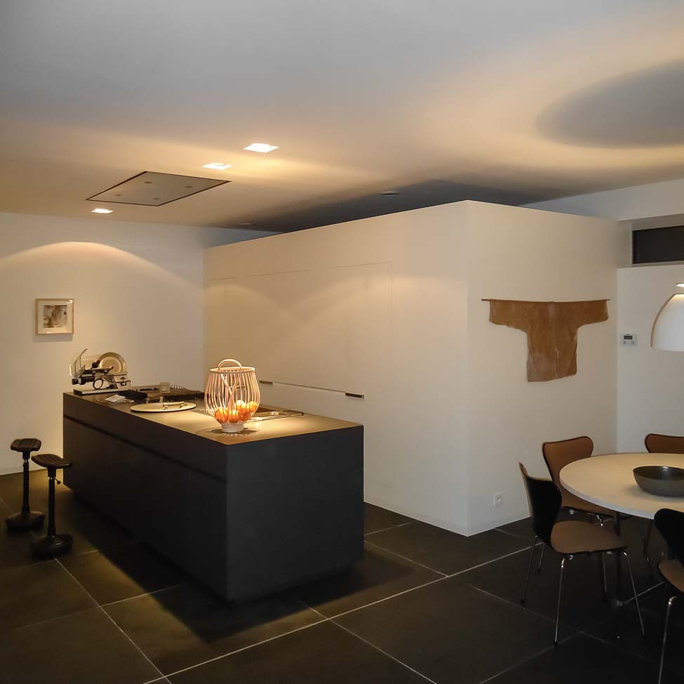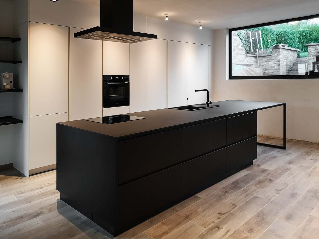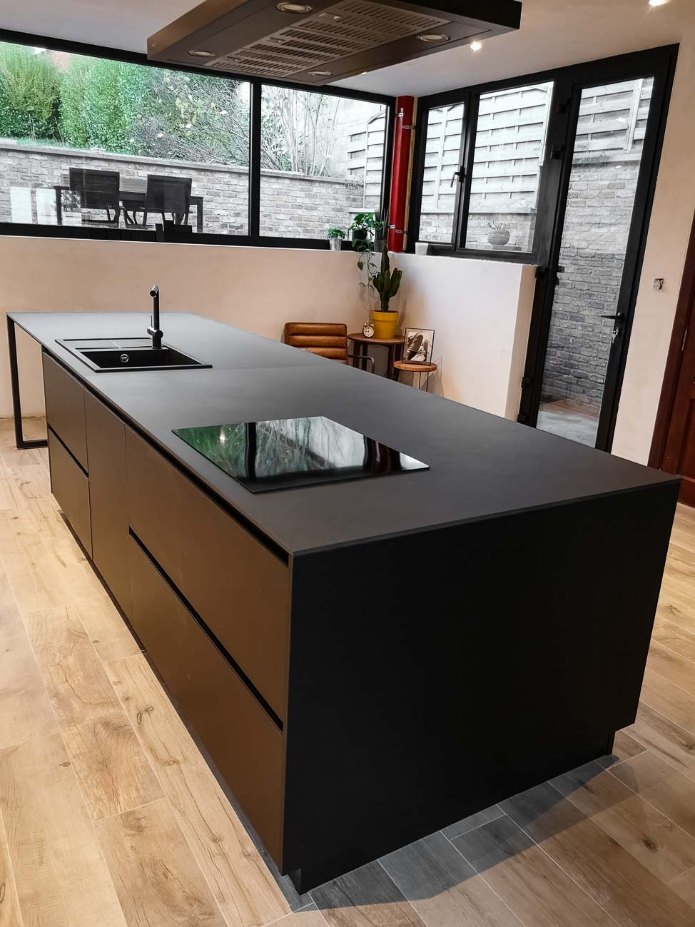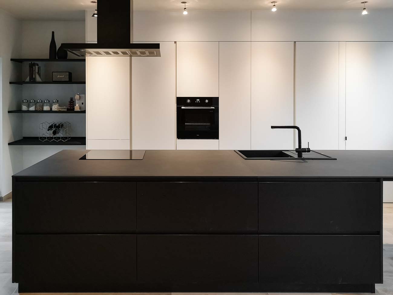 • Cuisine sobre avec îlot noir et meuble caché dans un mur avec arrière cuisines et électro invisible sur mesure :