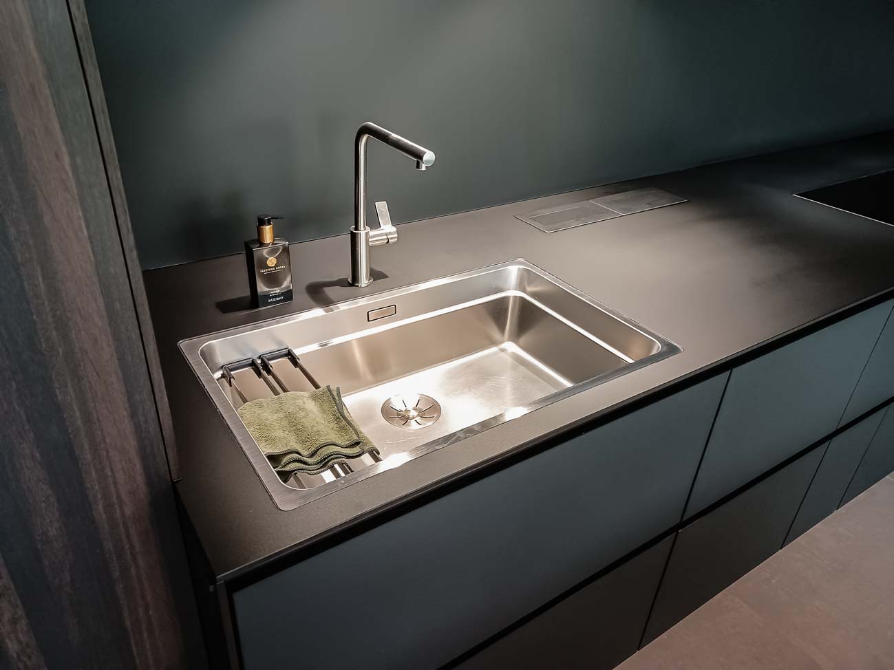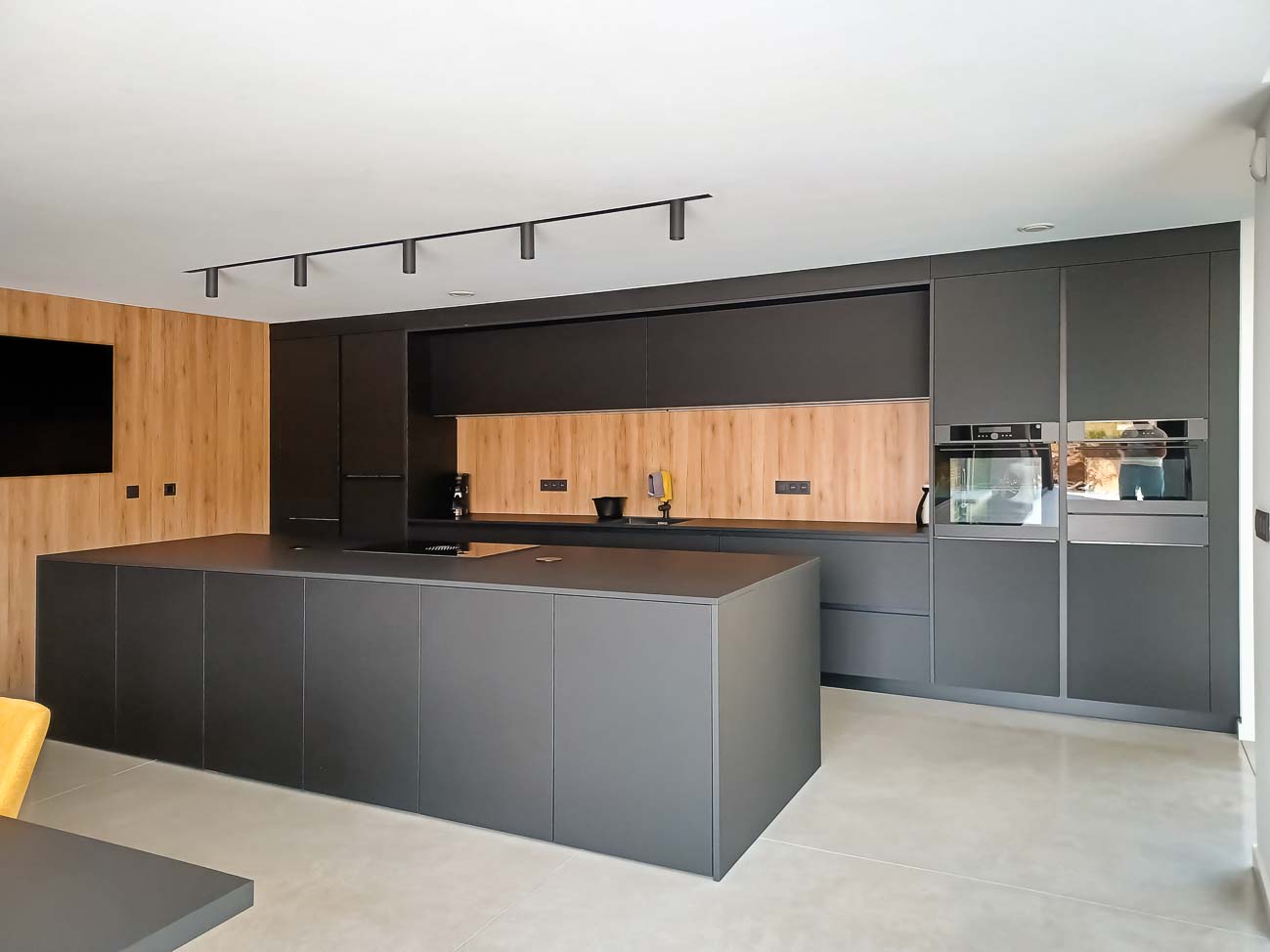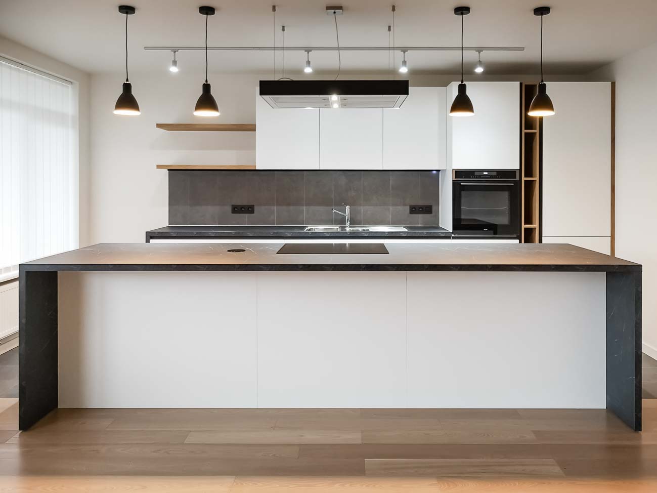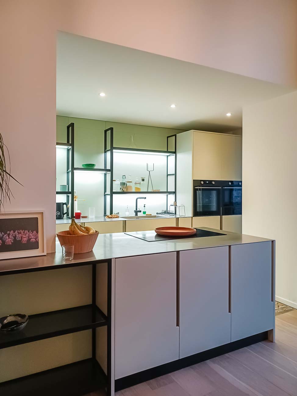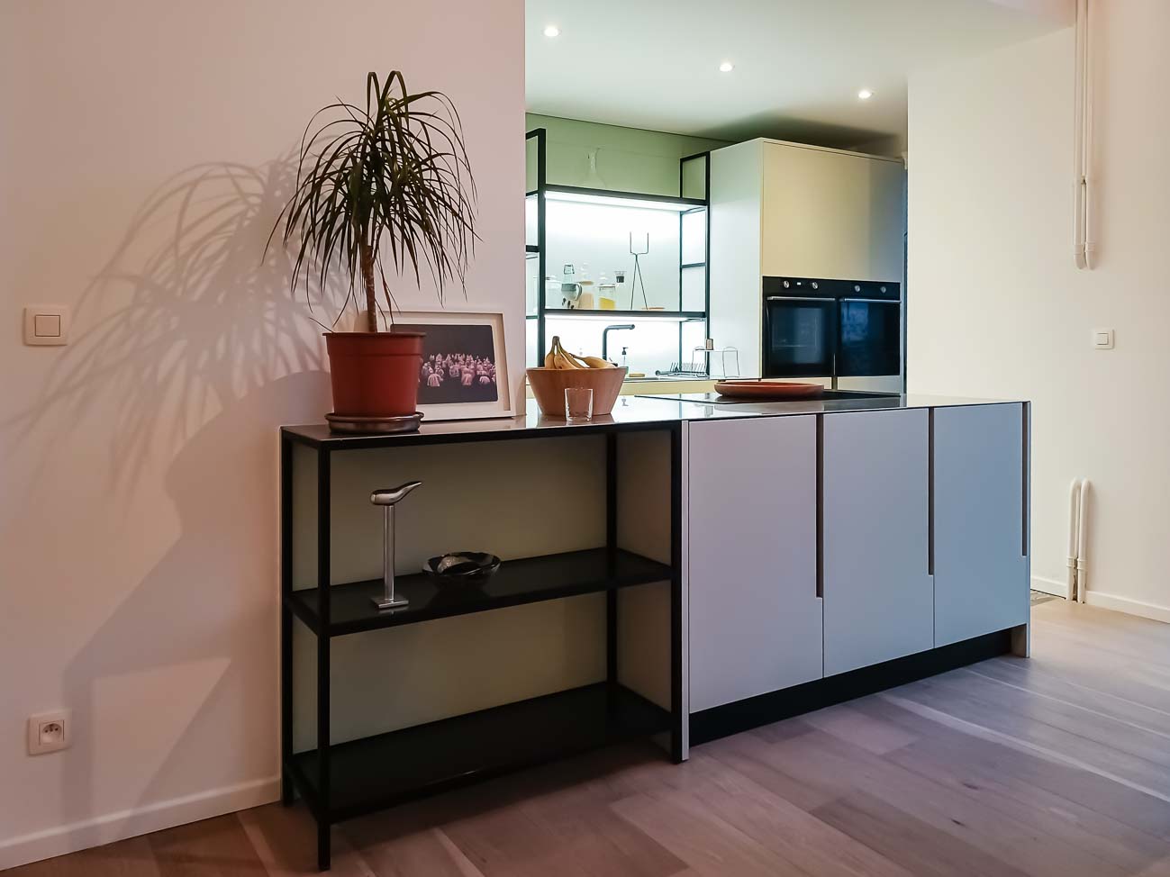 • Cuisine sobre avec îlot noir et meuble caché dans un mur avec arrière cuisines et électro invisible sur mesure :