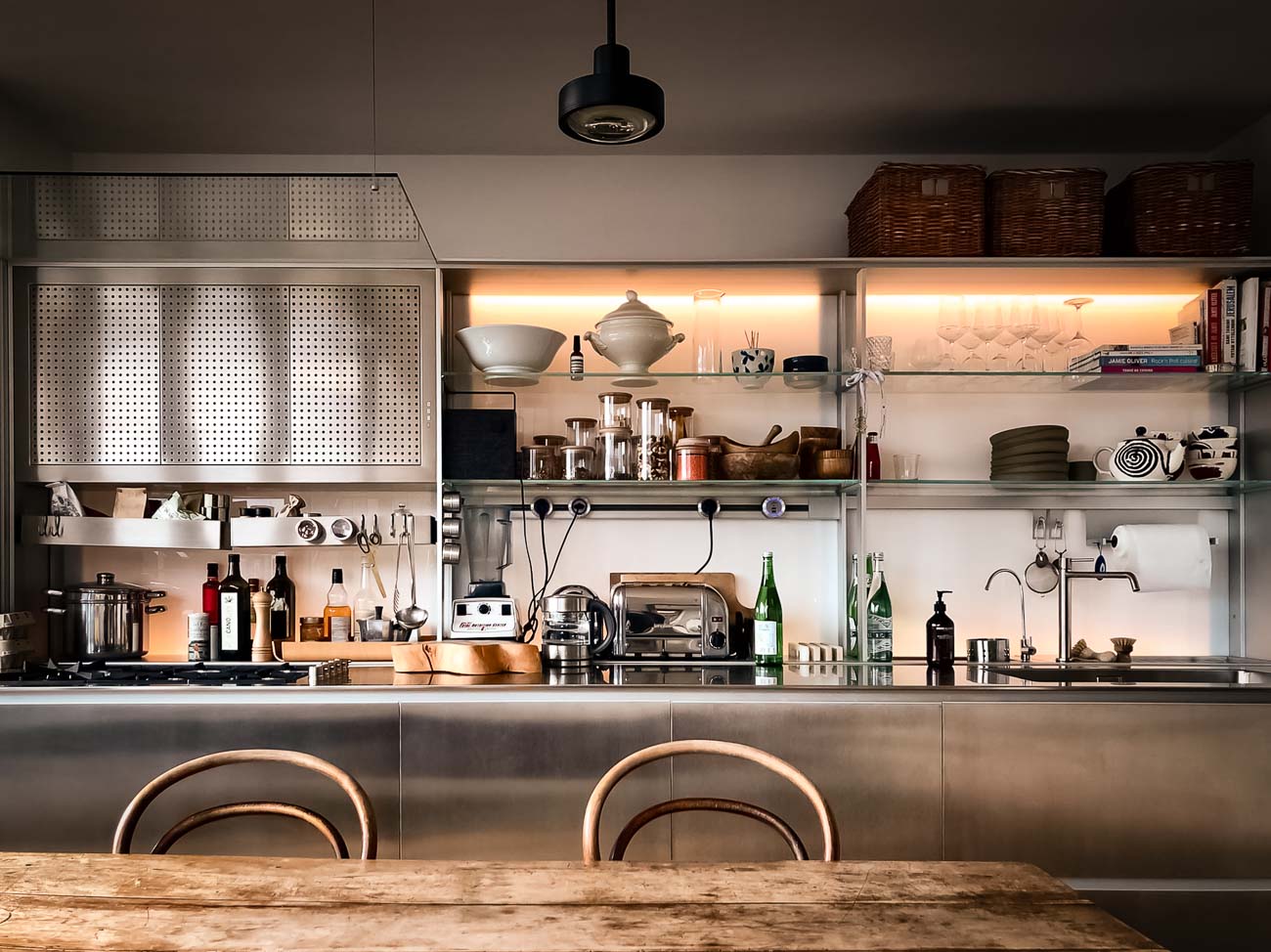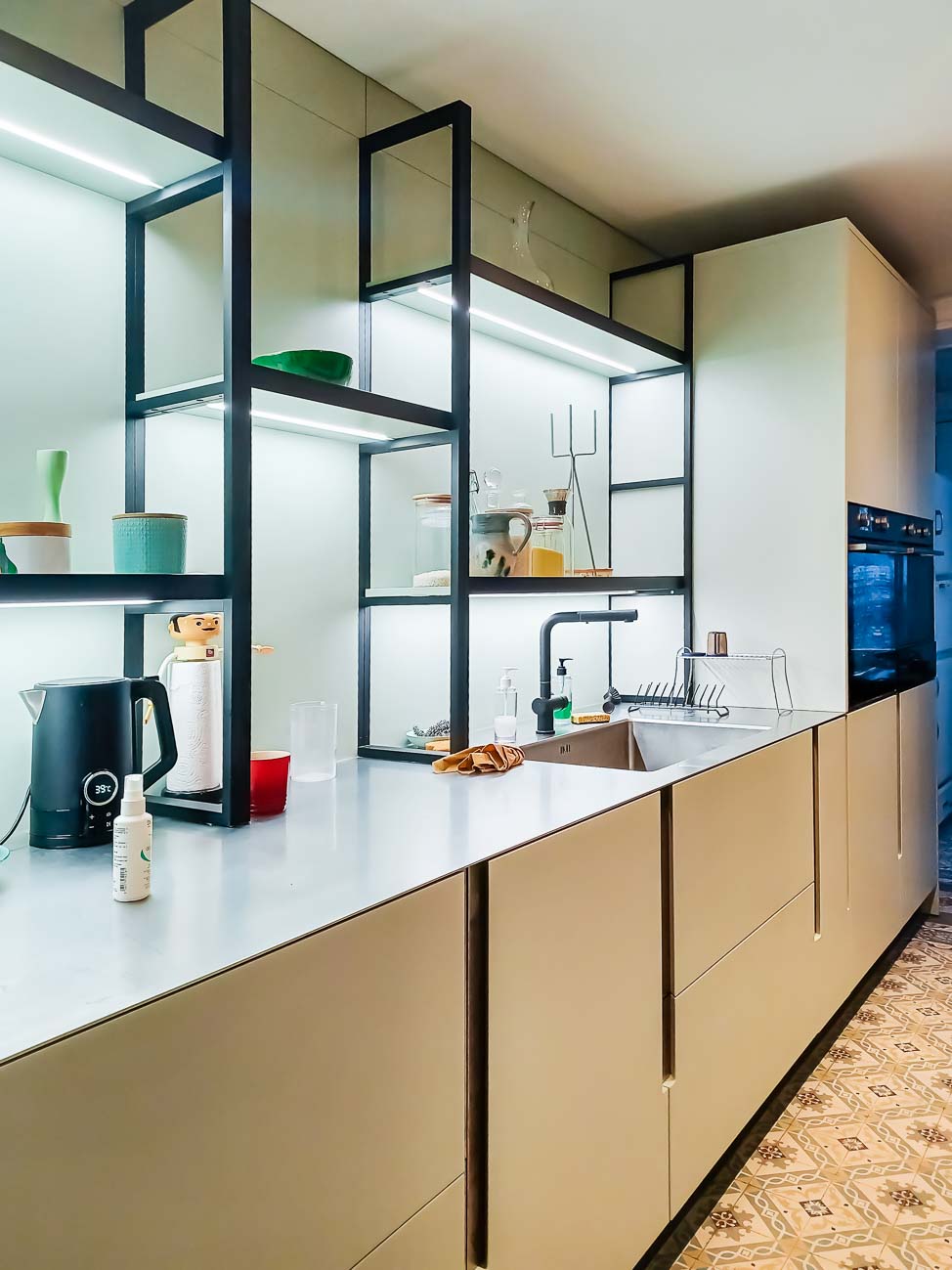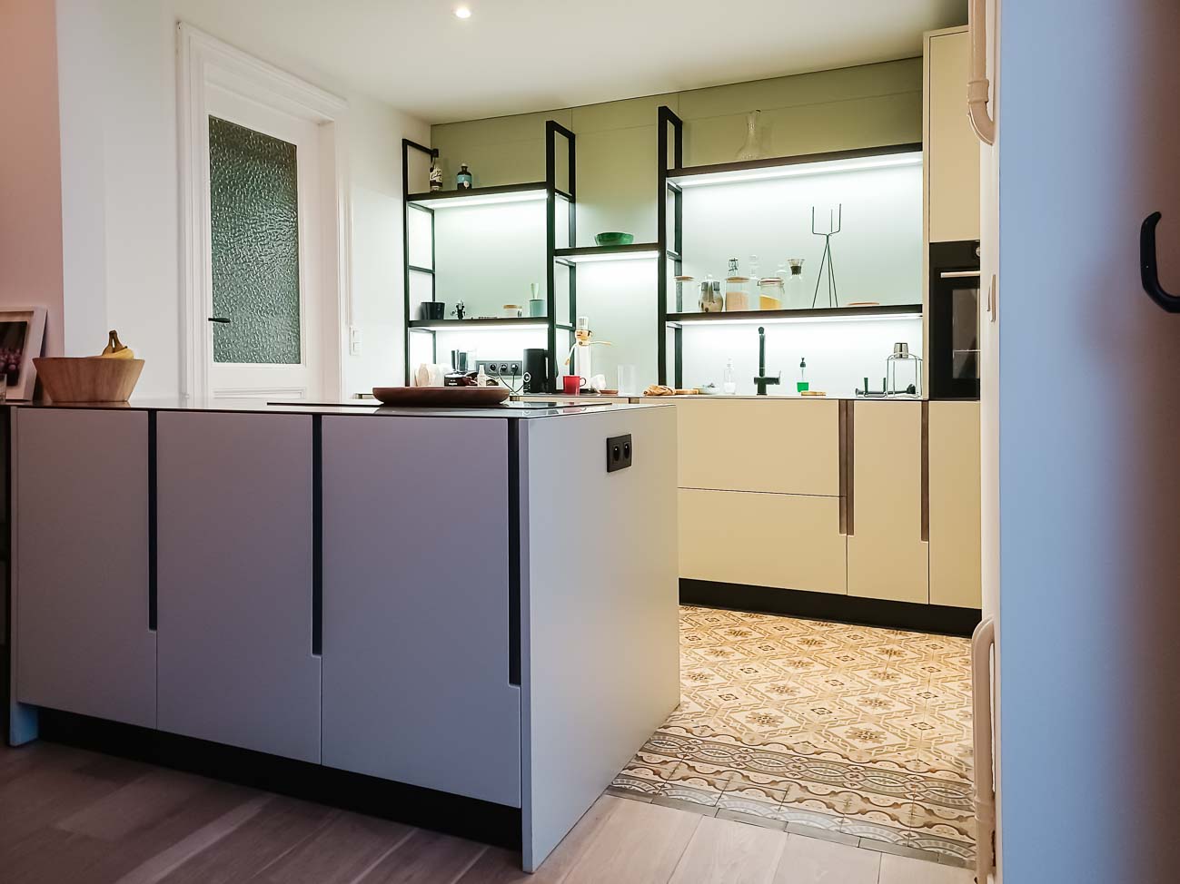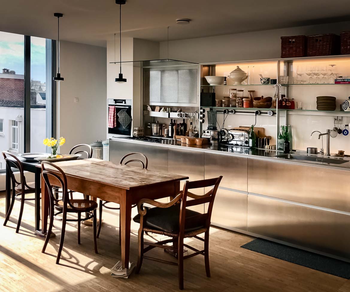 • Cuisine laqué mat vert pastel lumineuse et étagères structurées, plan de travail en acier inoxydable :
