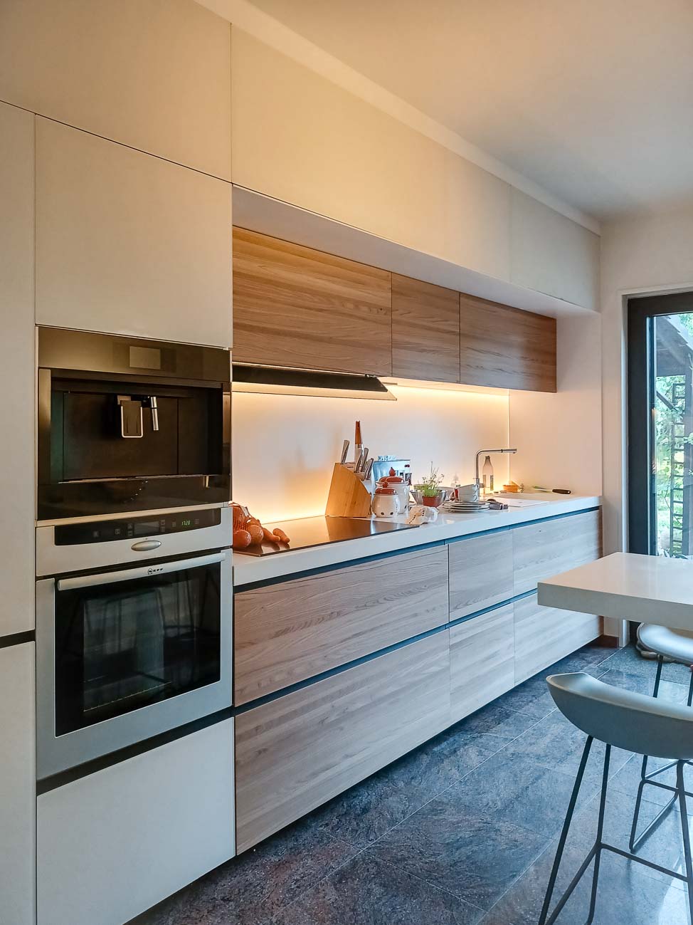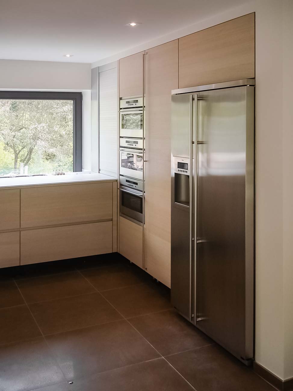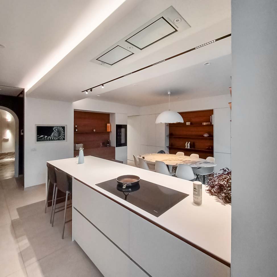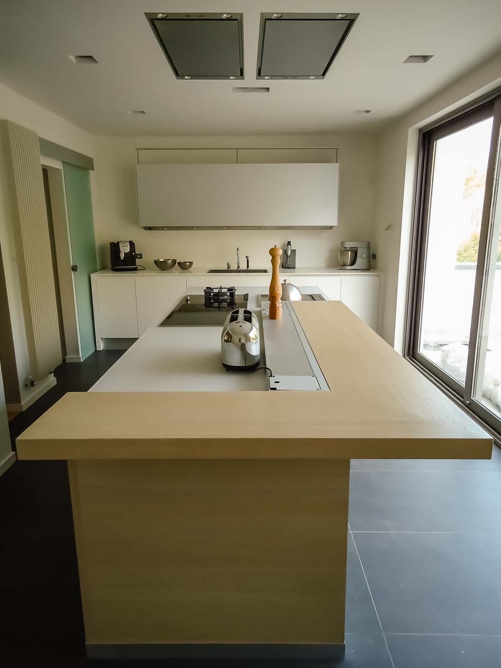 • Cuisine entièrement équipée avec îlot monolithe en Corian blanc et portes en plaqué chêne et aluminium :