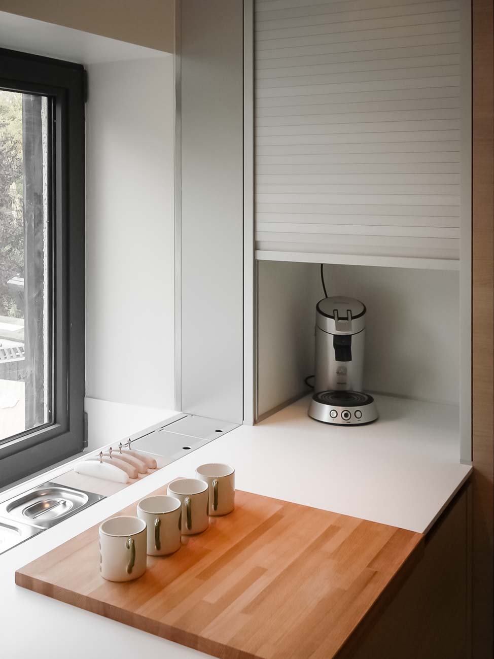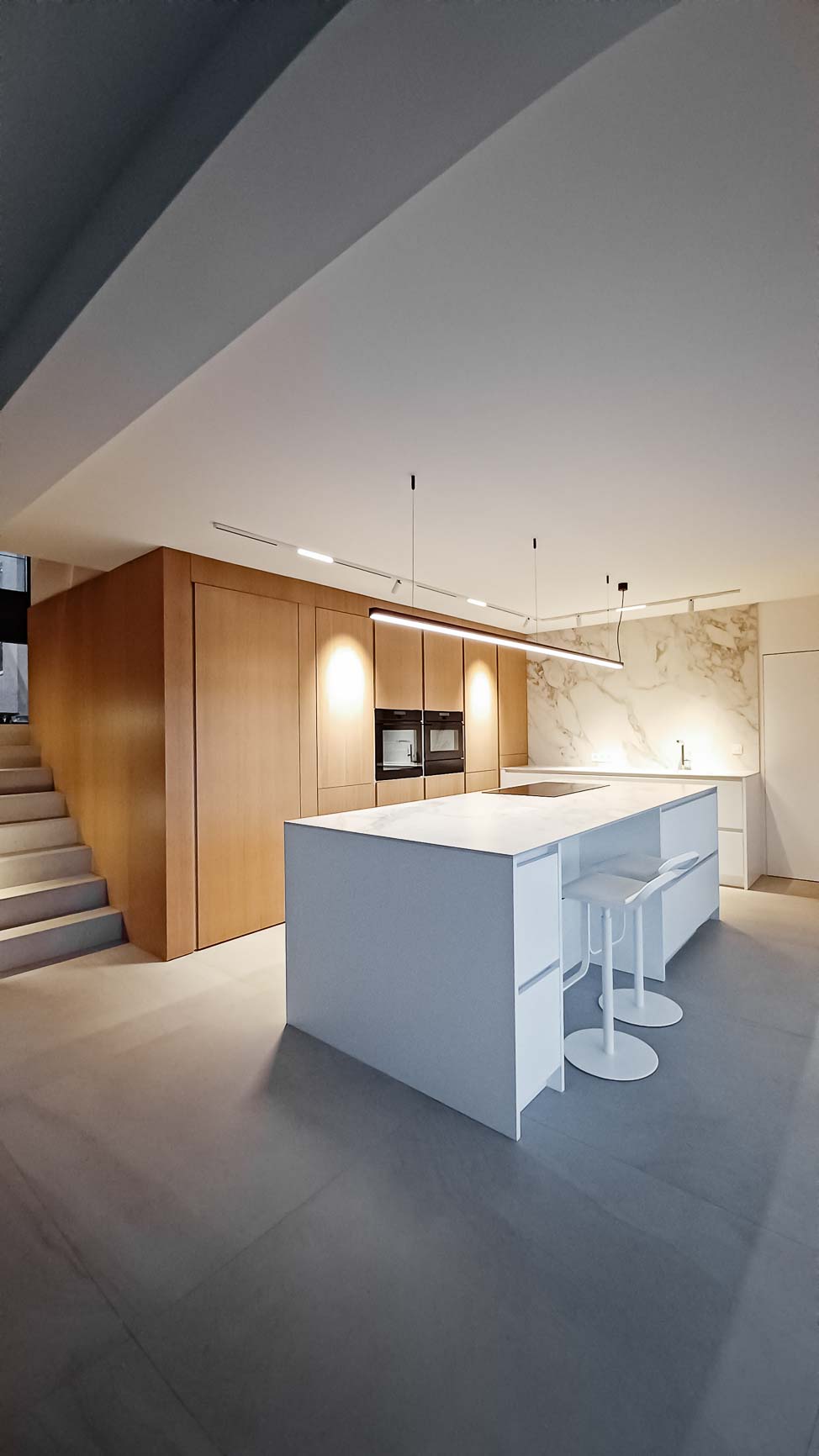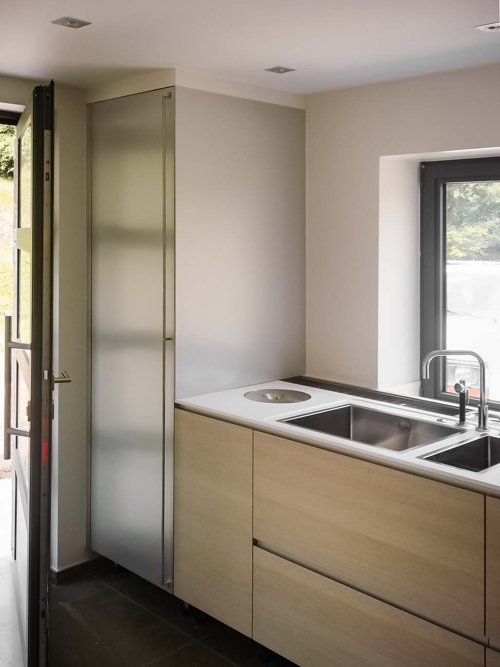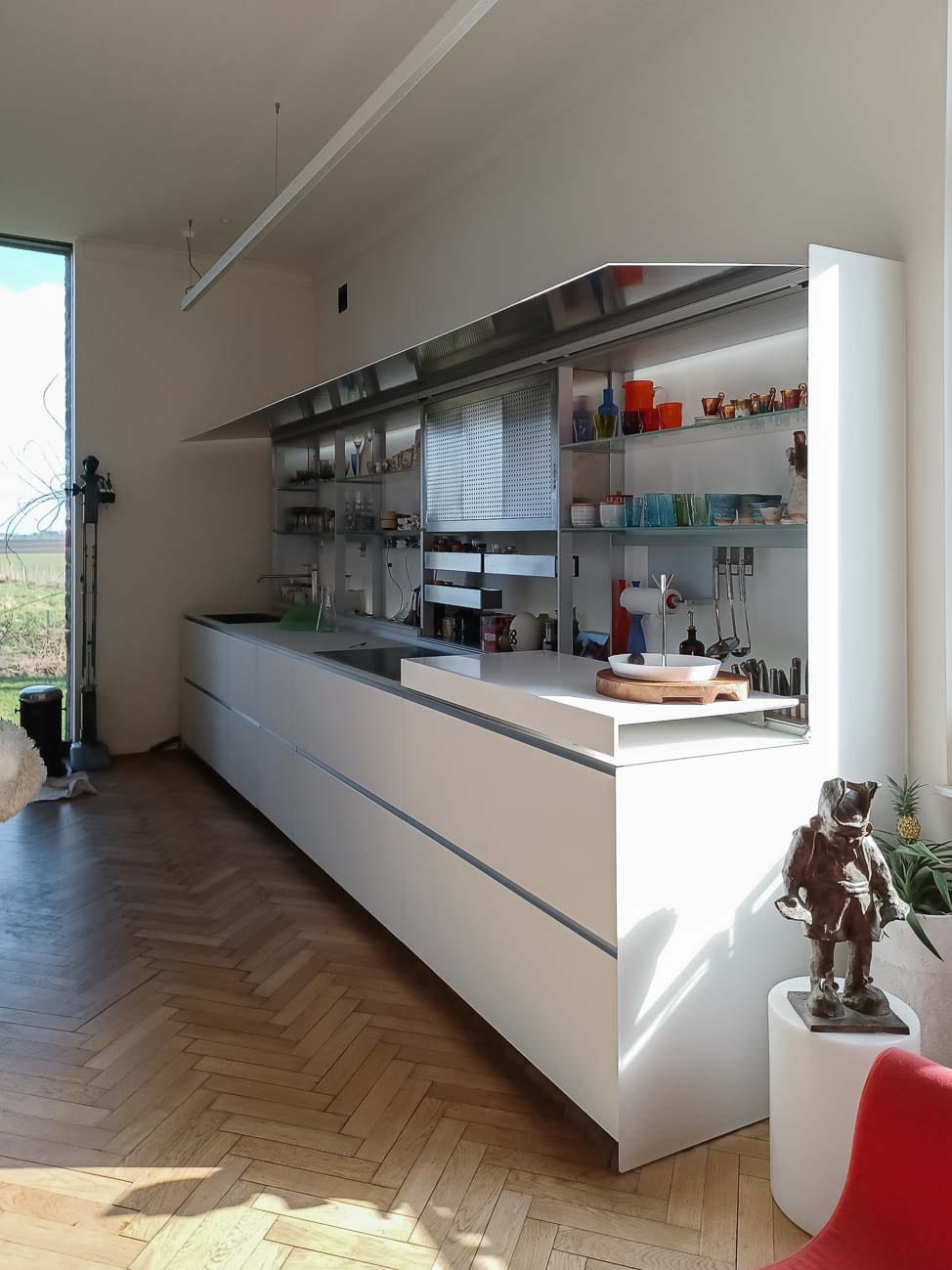 • Cuisine entièrement équipée avec îlot monolithe en Corian blanc et portes en plaqué chêne et aluminium :