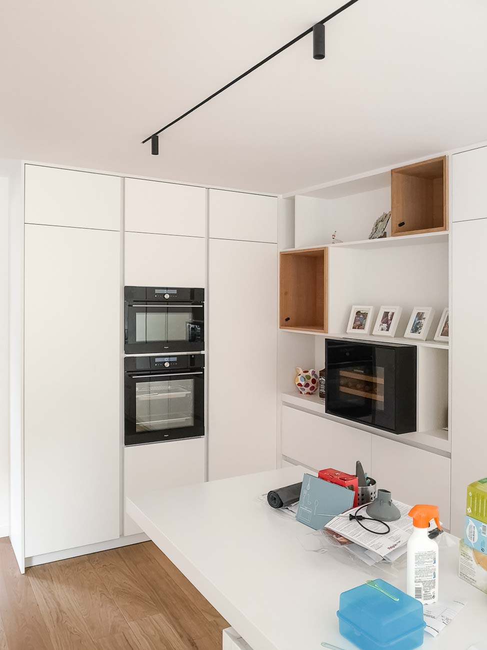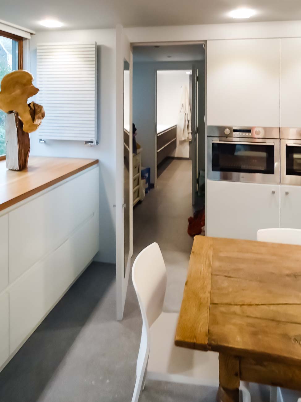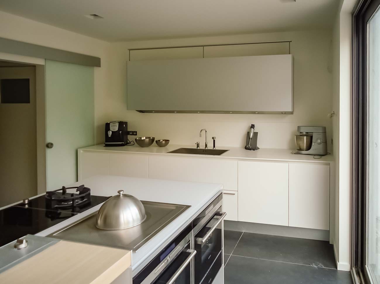 • Cuisine blanche, verre blanc mat, plan de travail en bois massif et colonnes en laqués gris mat avec porte dissimulée, accès buanderie :