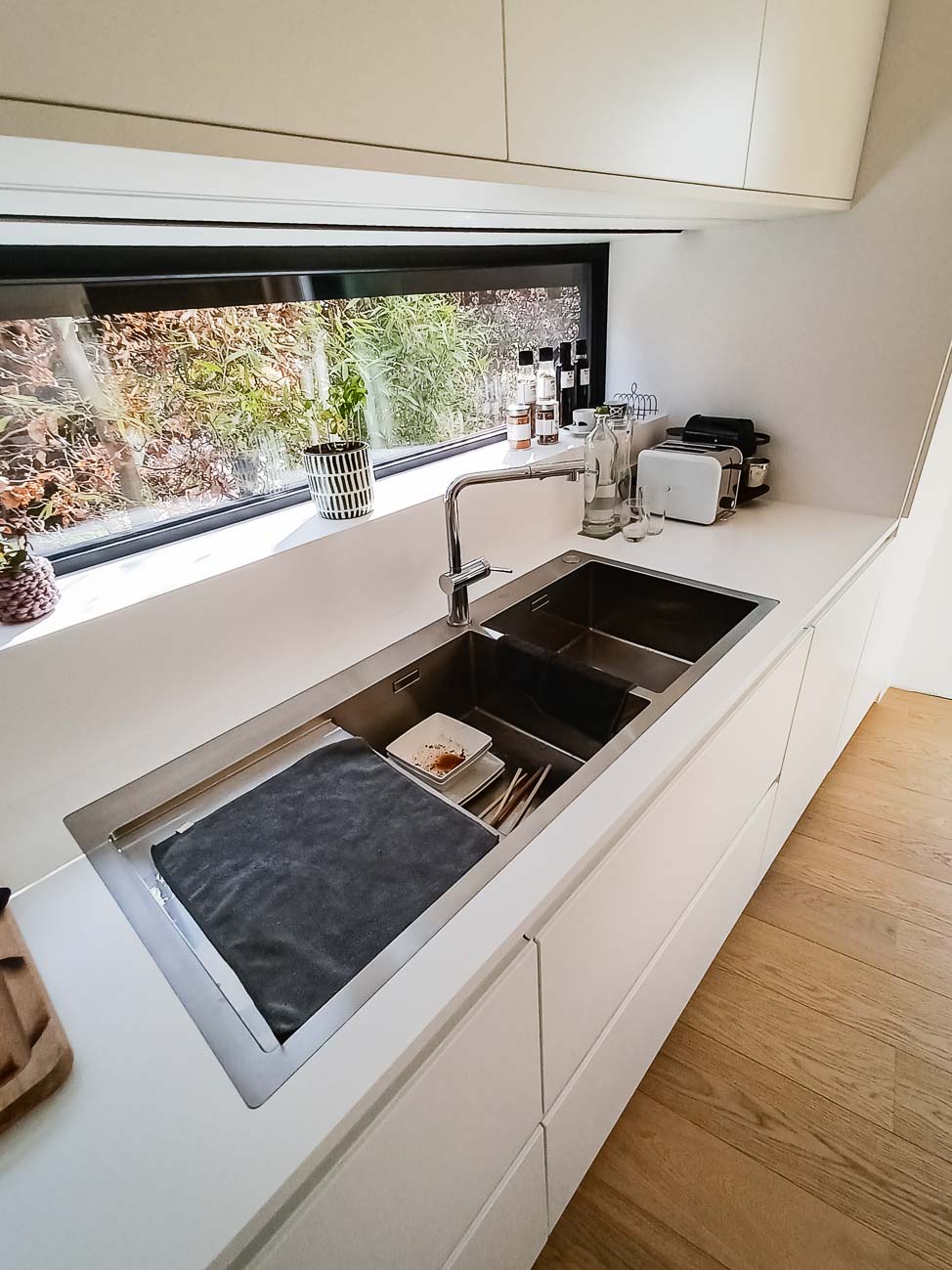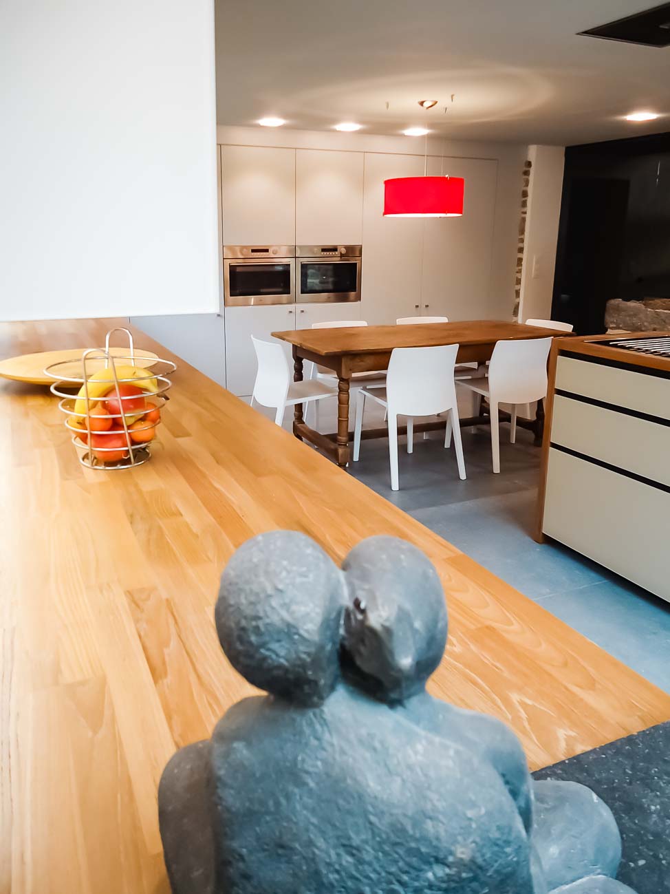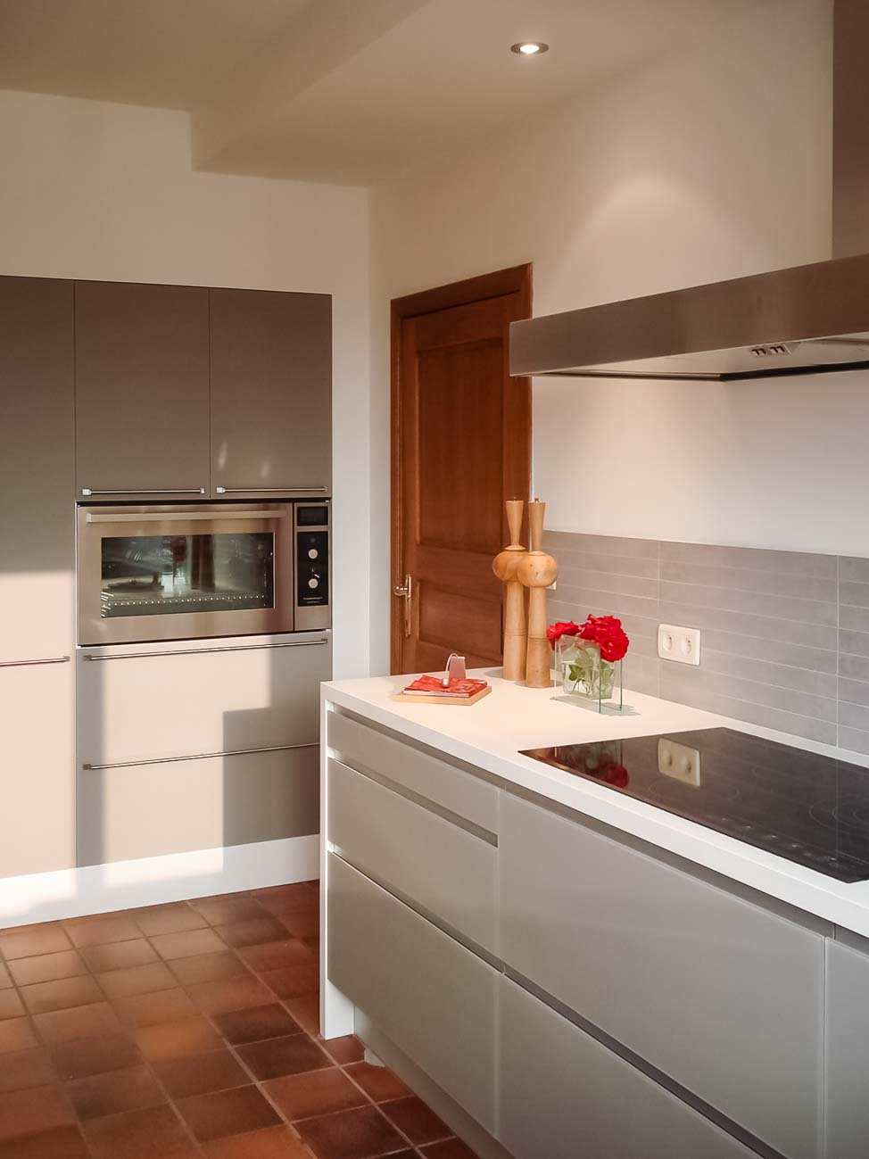 • Cuisine blanche, verre blanc mat, plan de travail en bois massif et colonnes en laqués gris mat avec porte dissimulée, accès buanderie :