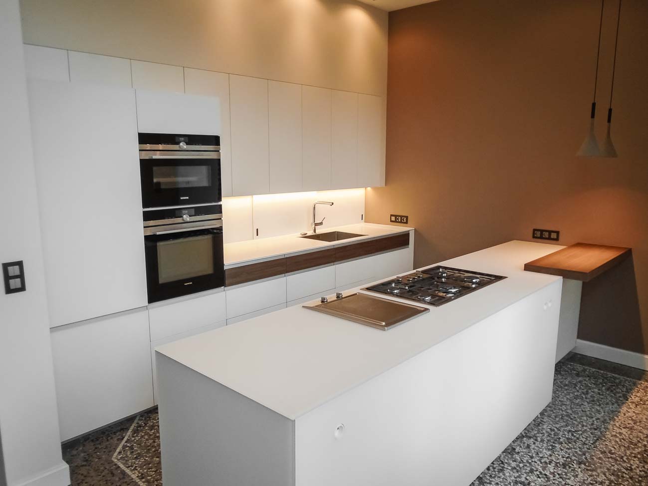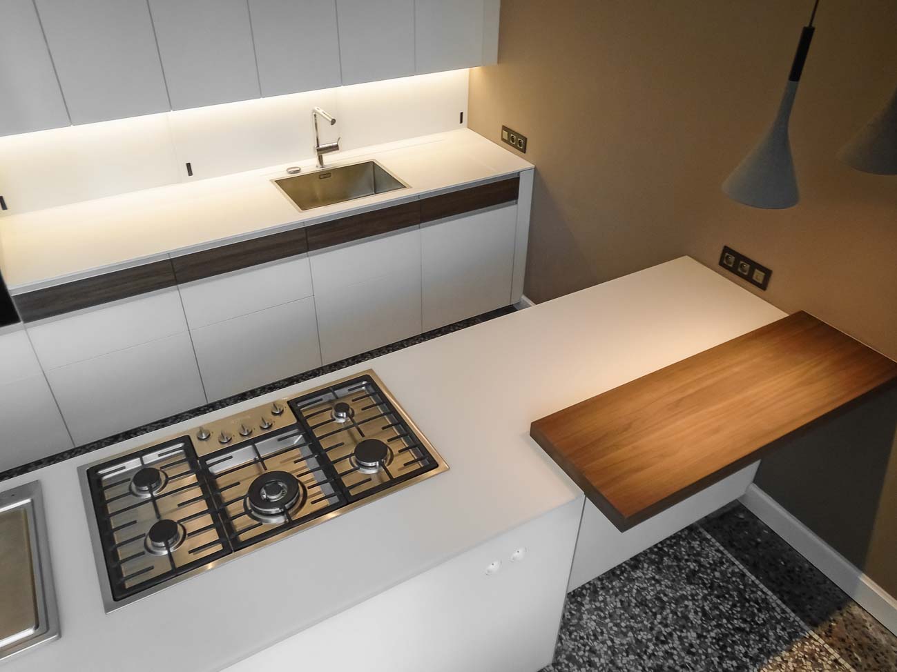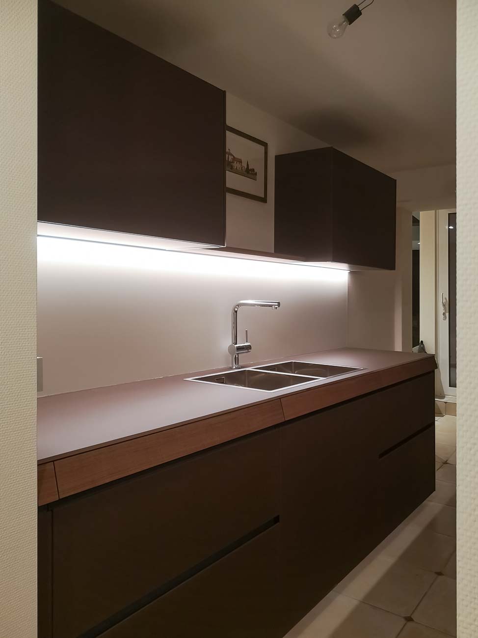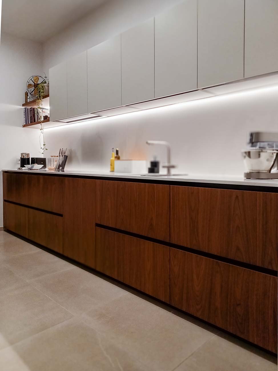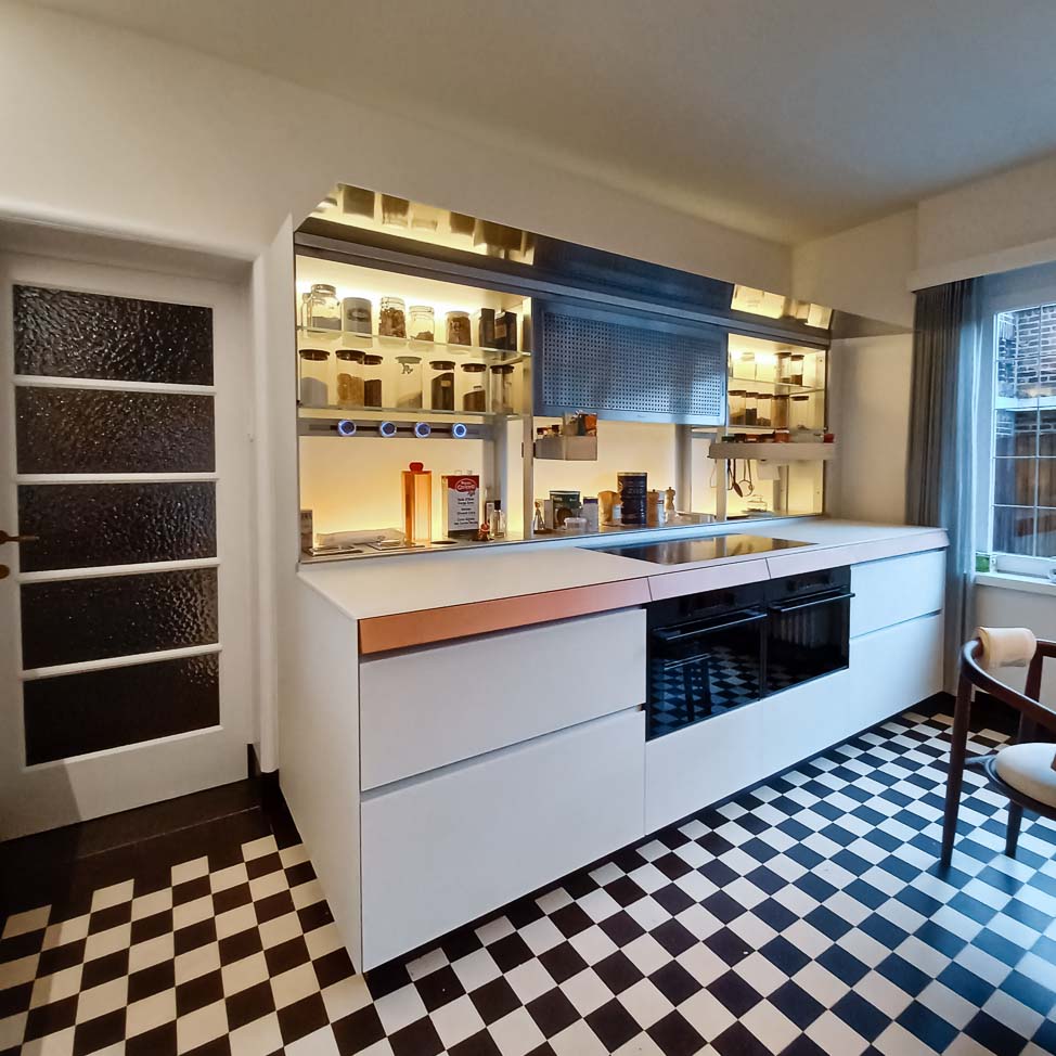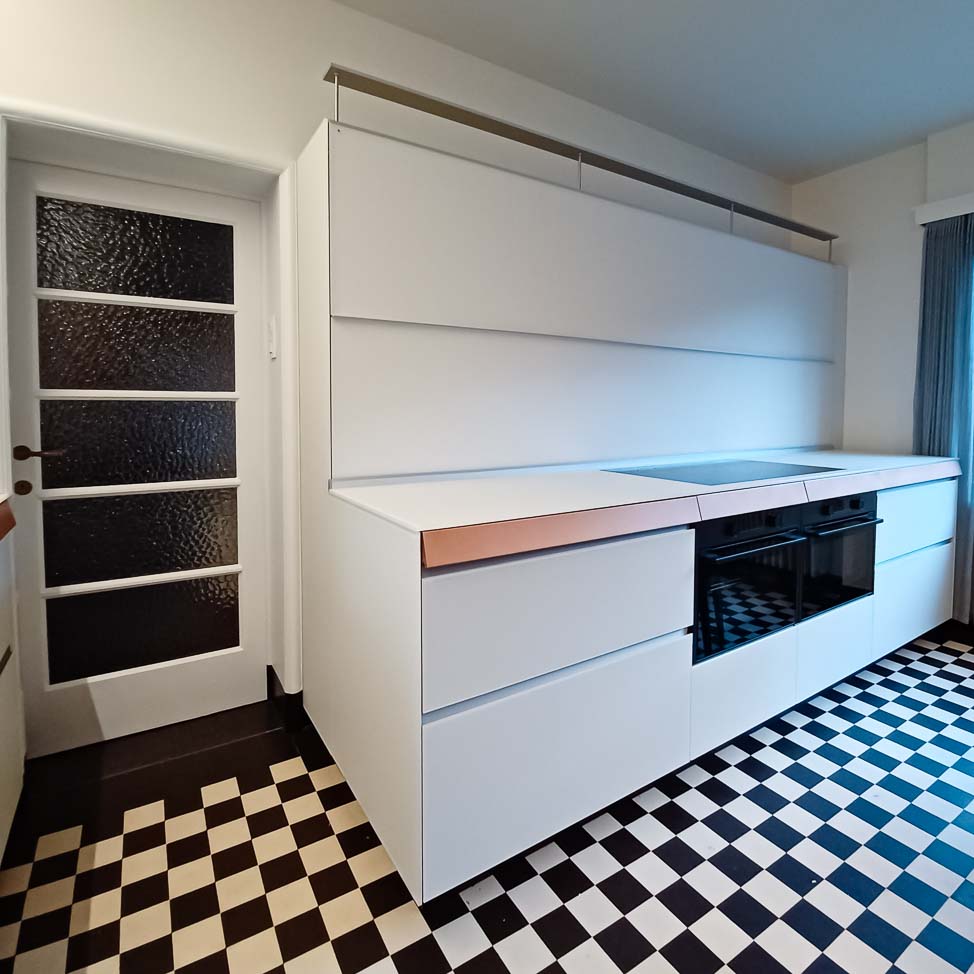 • Cuisine en verre blanc mat, faces de tiroirs en cuivre, meuble suspendu en plaquage noyer, éclairage LED et système de fermeture caché :