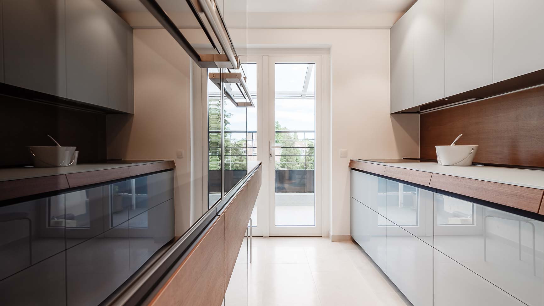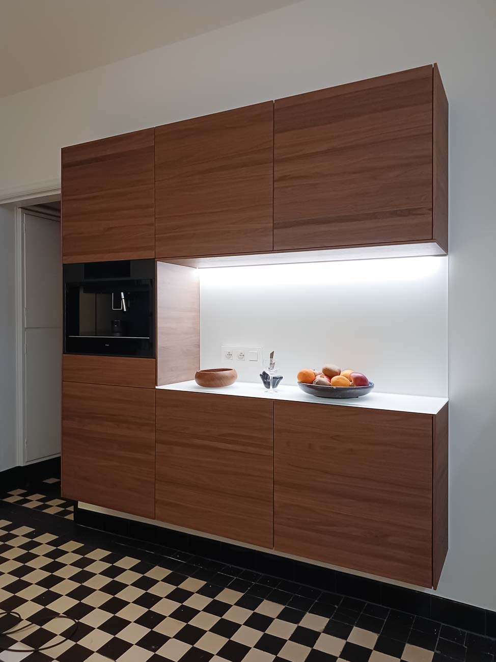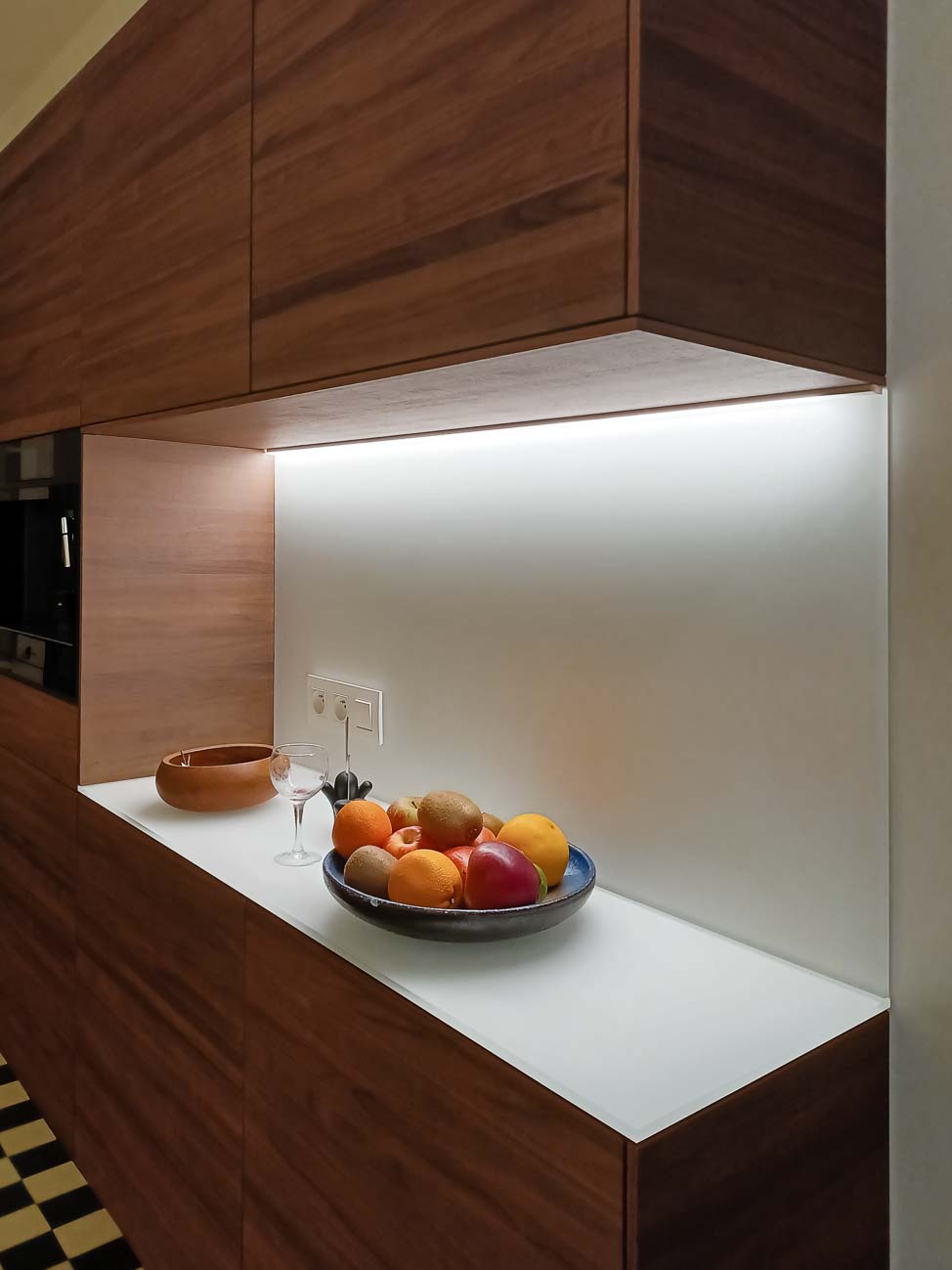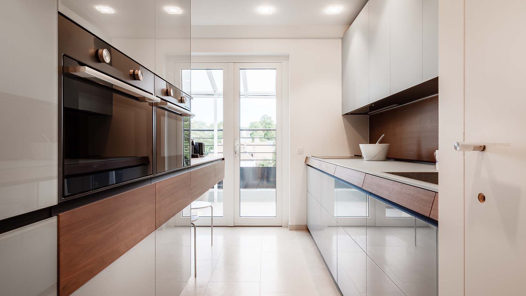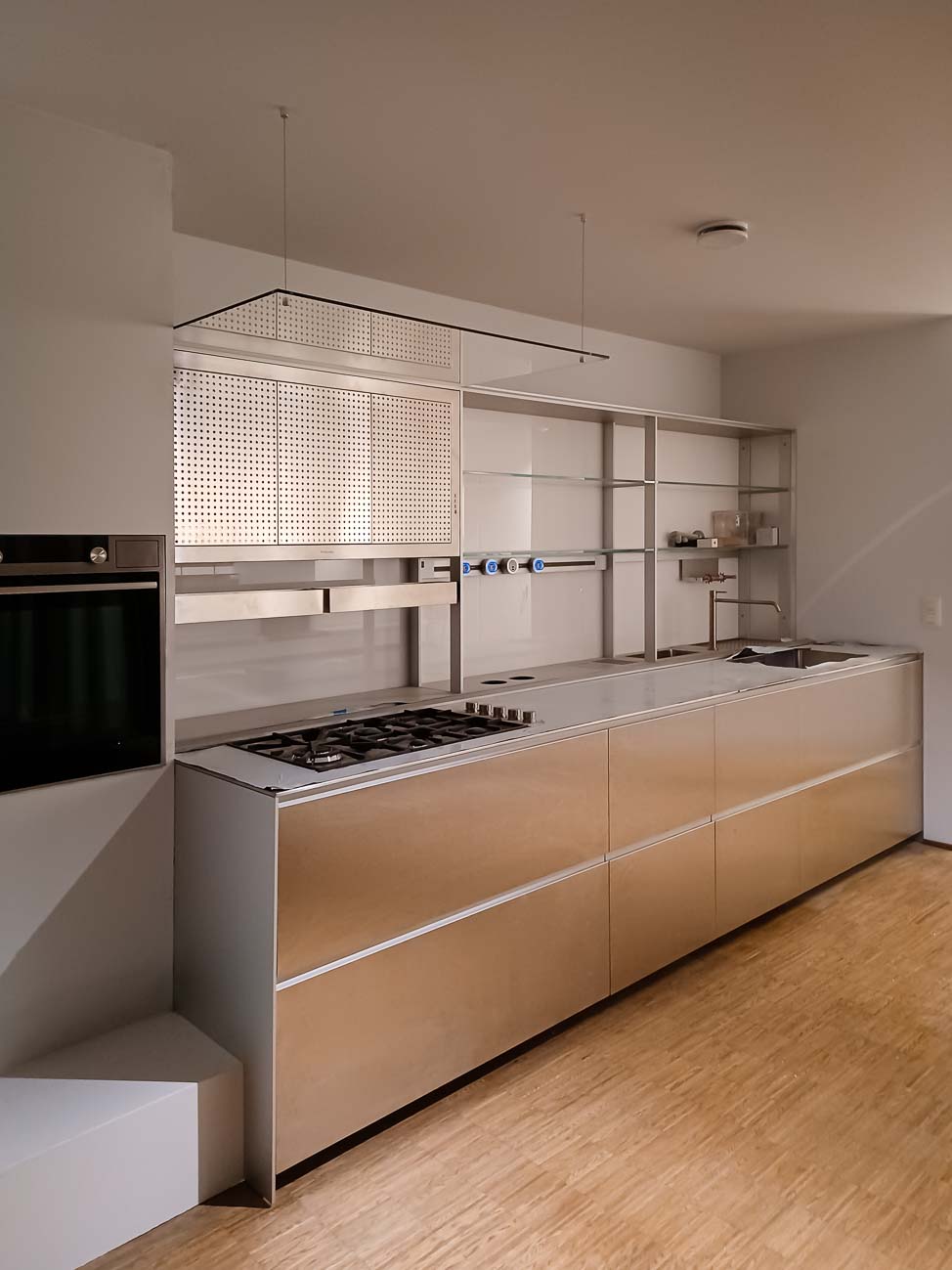 • Cuisine en verre blanc mat, faces de tiroirs en cuivre, meuble suspendu en plaquage noyer, éclairage LED et système de fermeture caché :