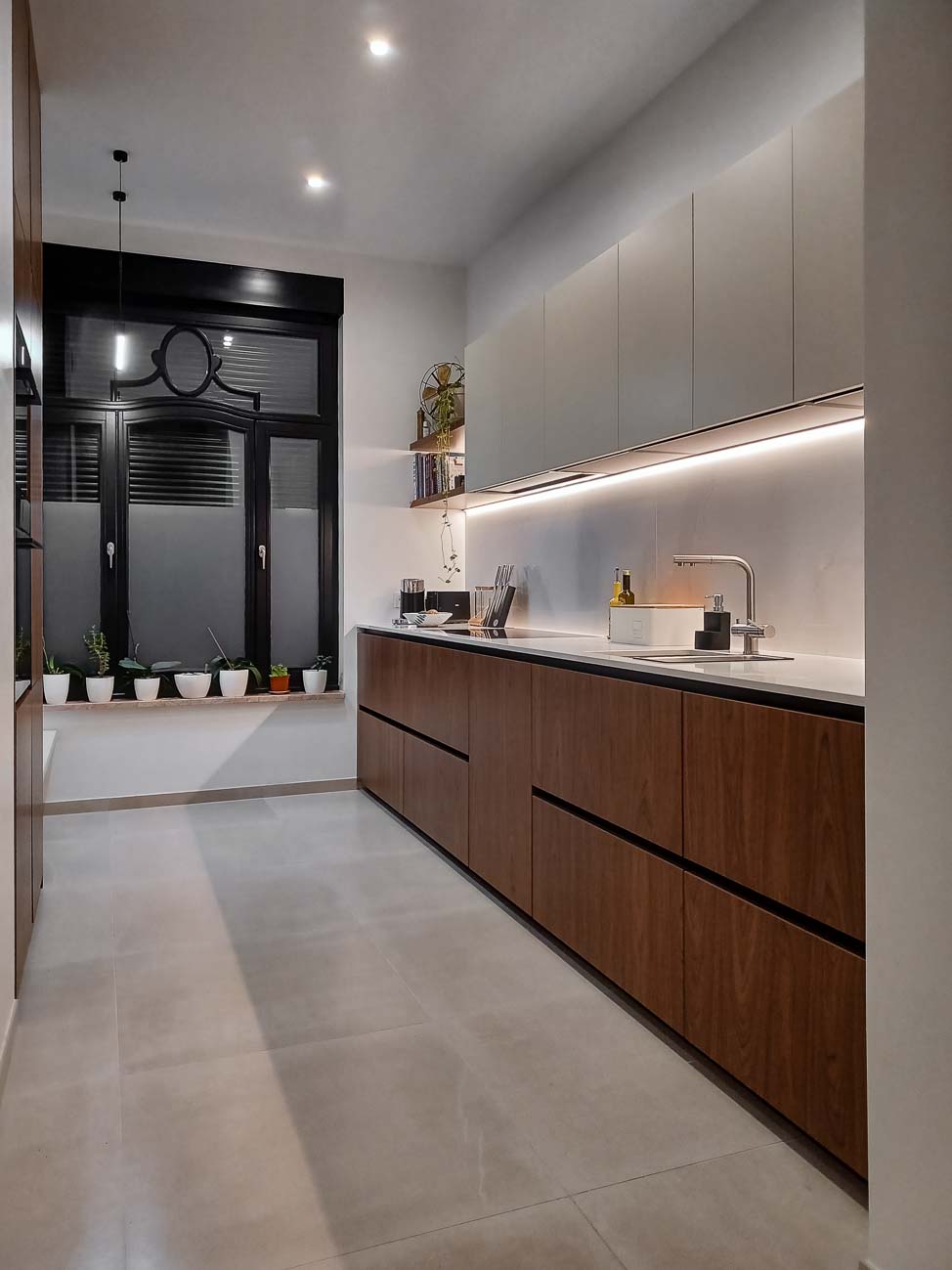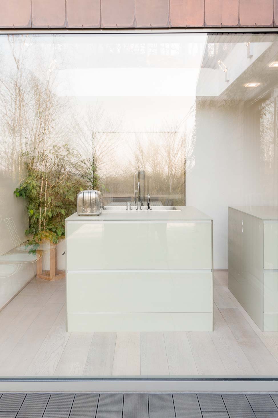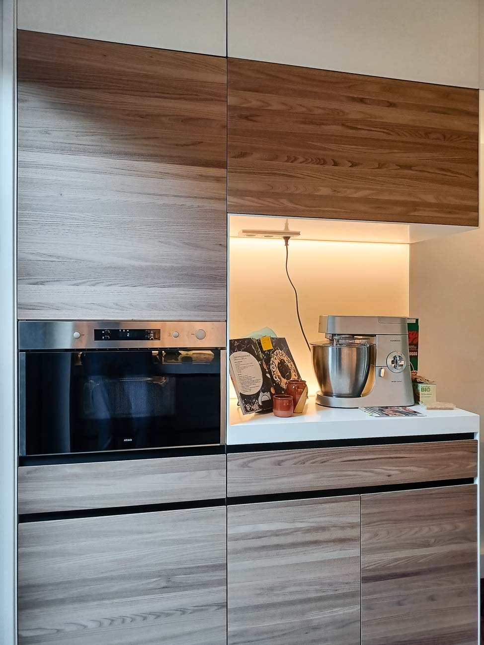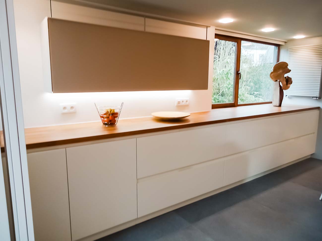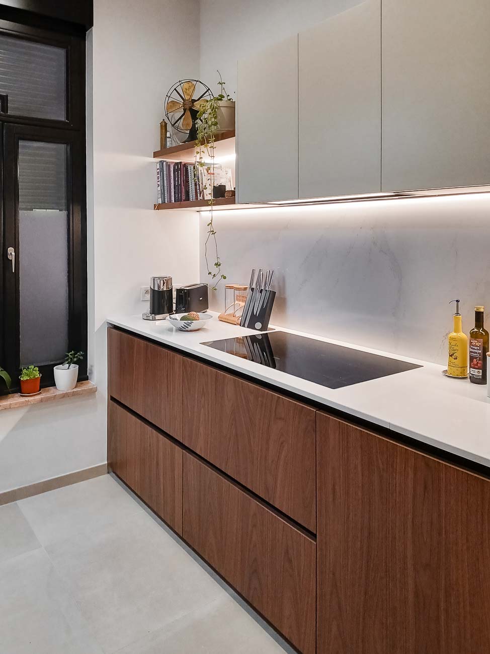 • Cuisine en verre blanc mat, faces de tiroirs en cuivre, meuble suspendu en plaquage noyer, éclairage LED et système de fermeture caché :
