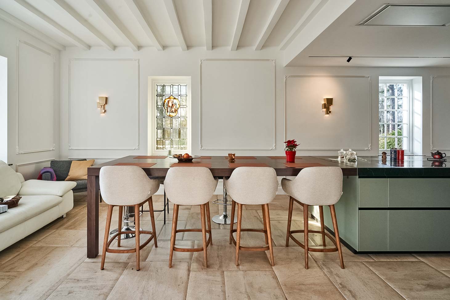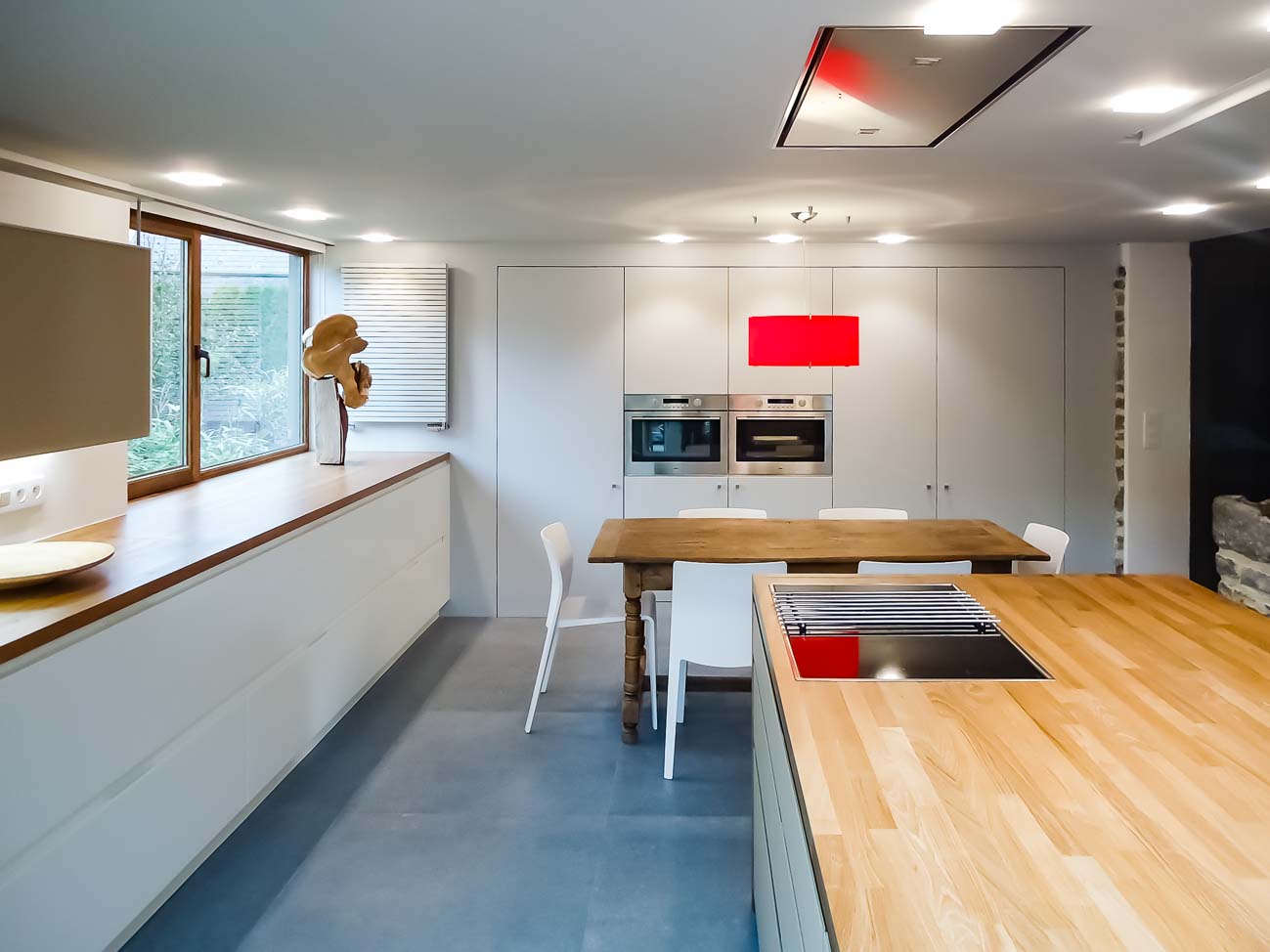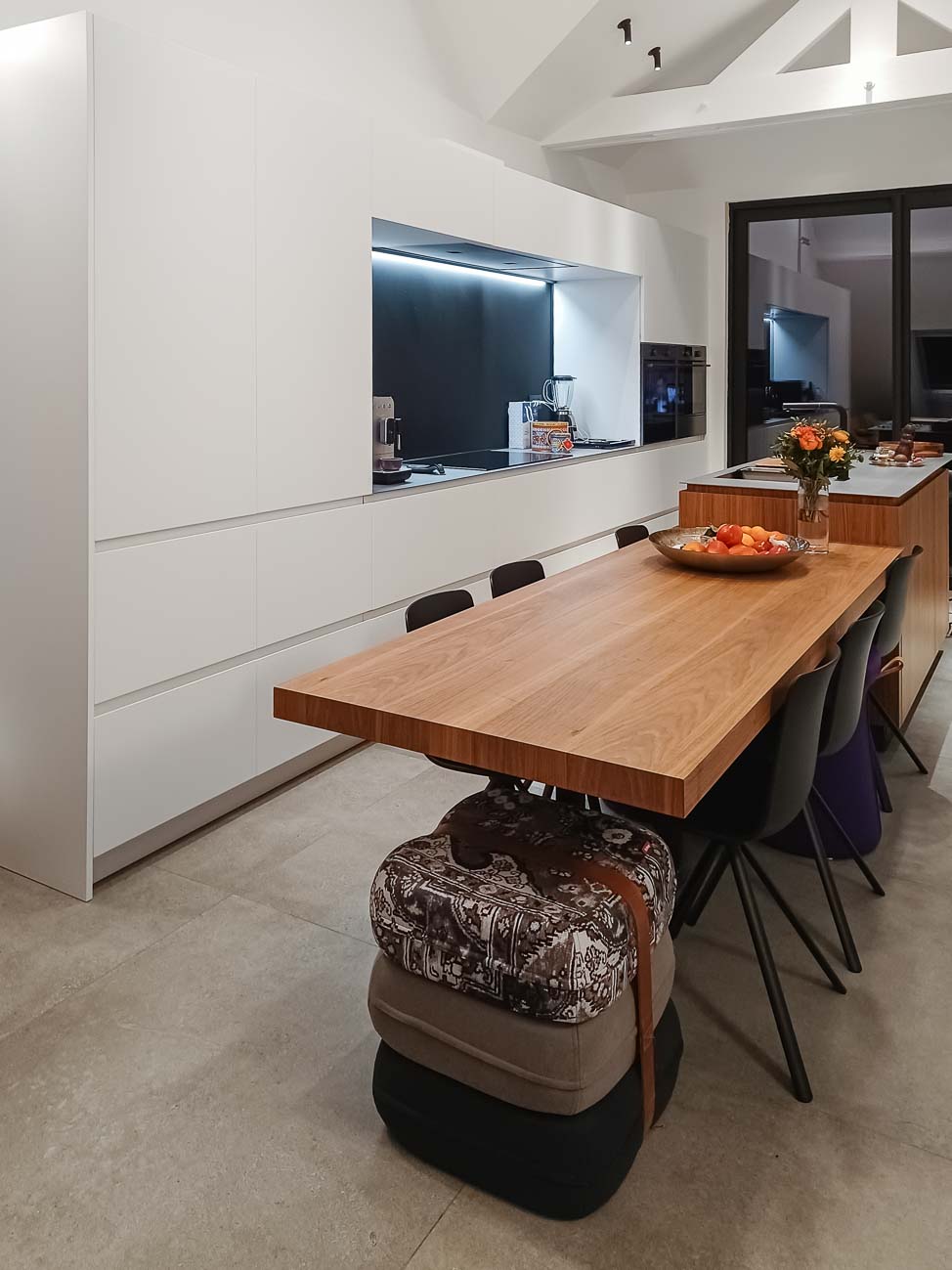 • Cuisine laqué mat blanc avec table en plaqué noyer et plans de travail en acier inoxydable :