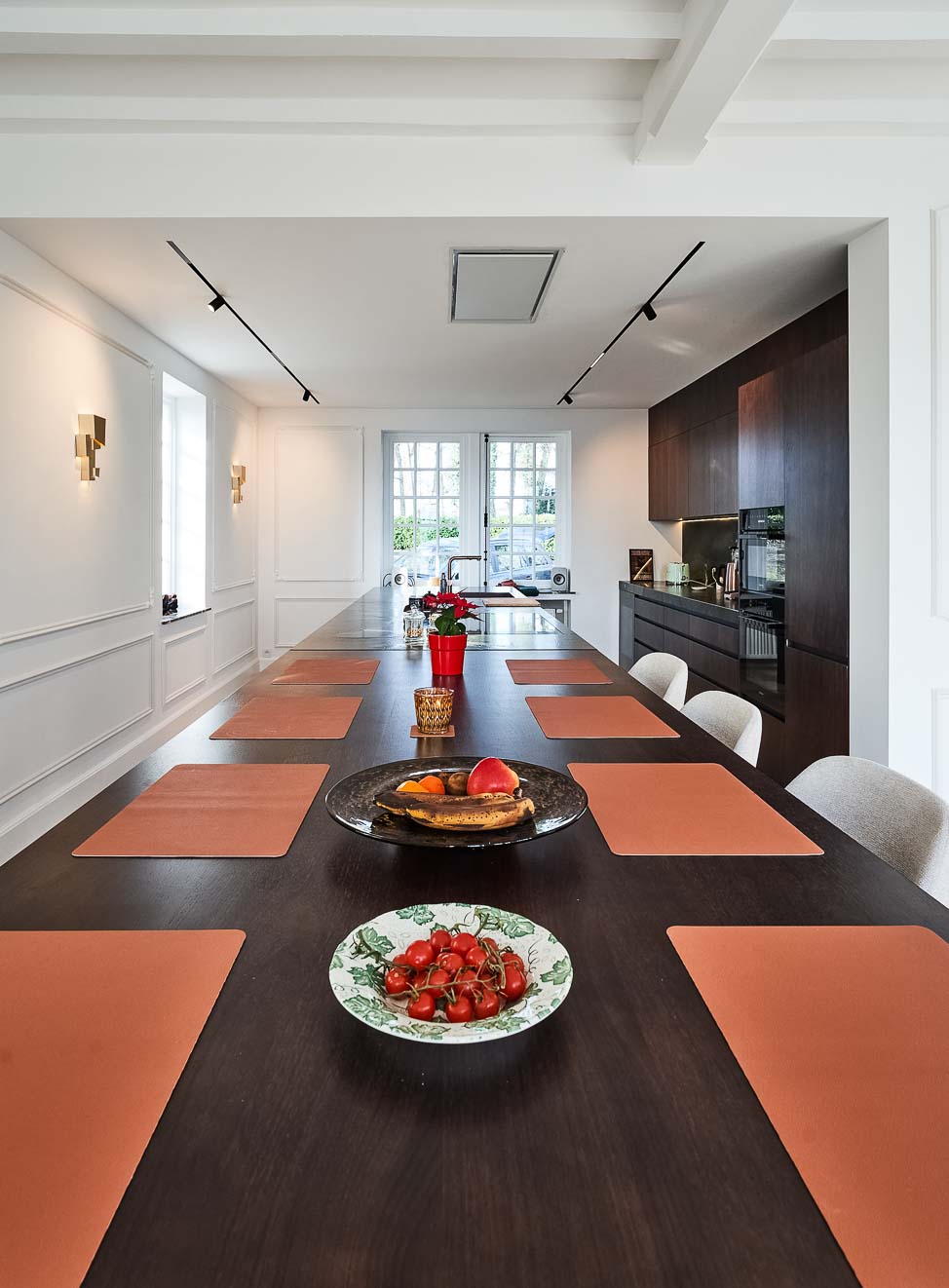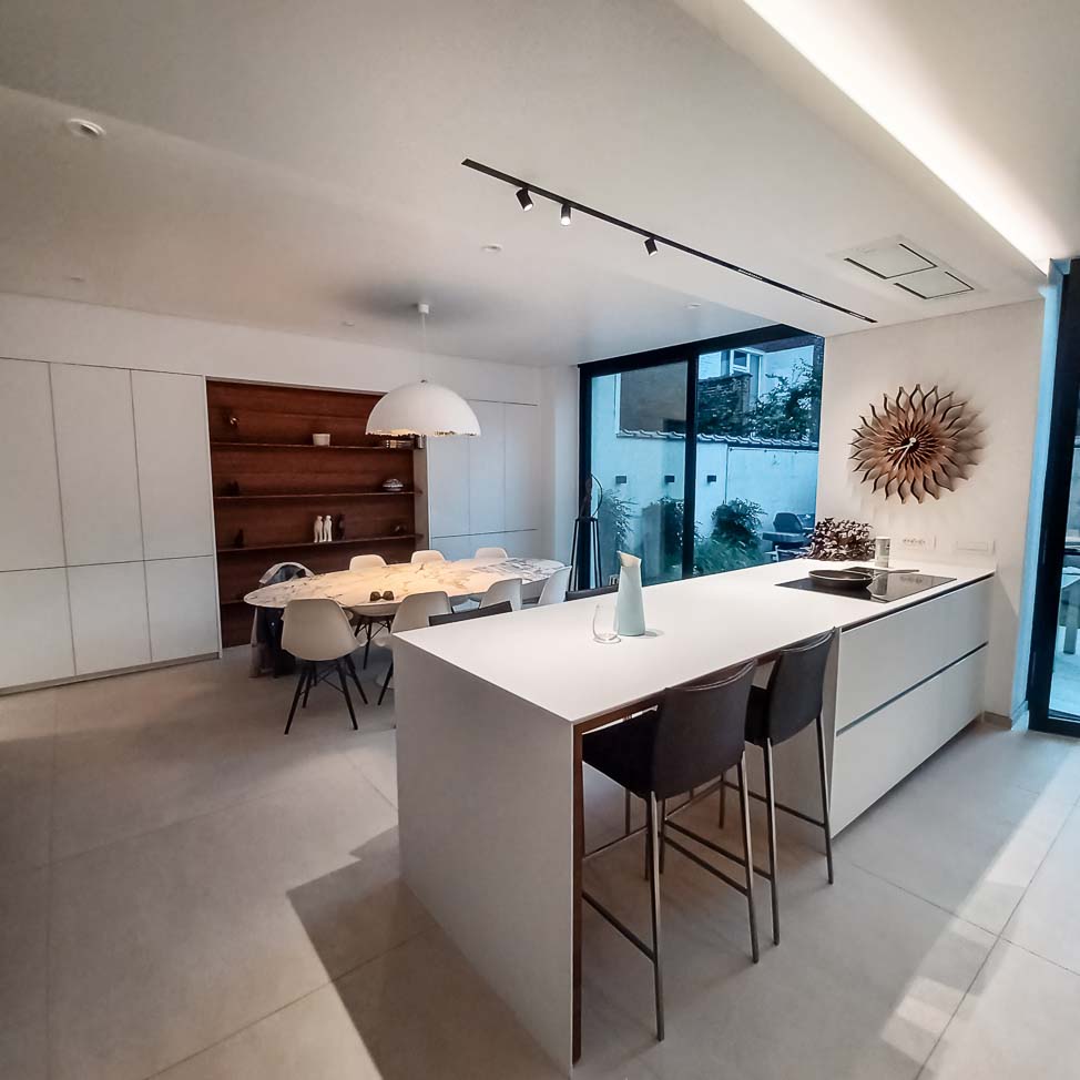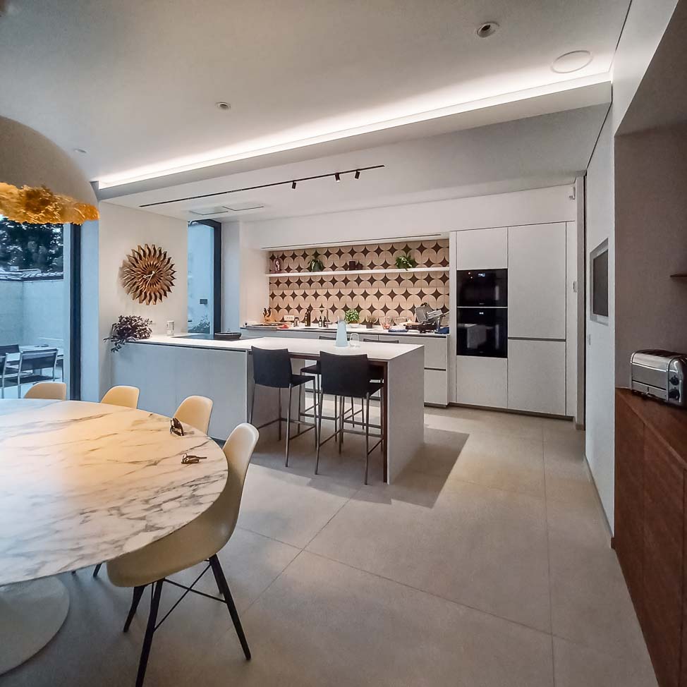 • Aménagement complet : luminaire artisanal, îlot de cuisine en verre, coin petit déjeuner en plaqué noyer, meuble de salle à manger en laqué mat :