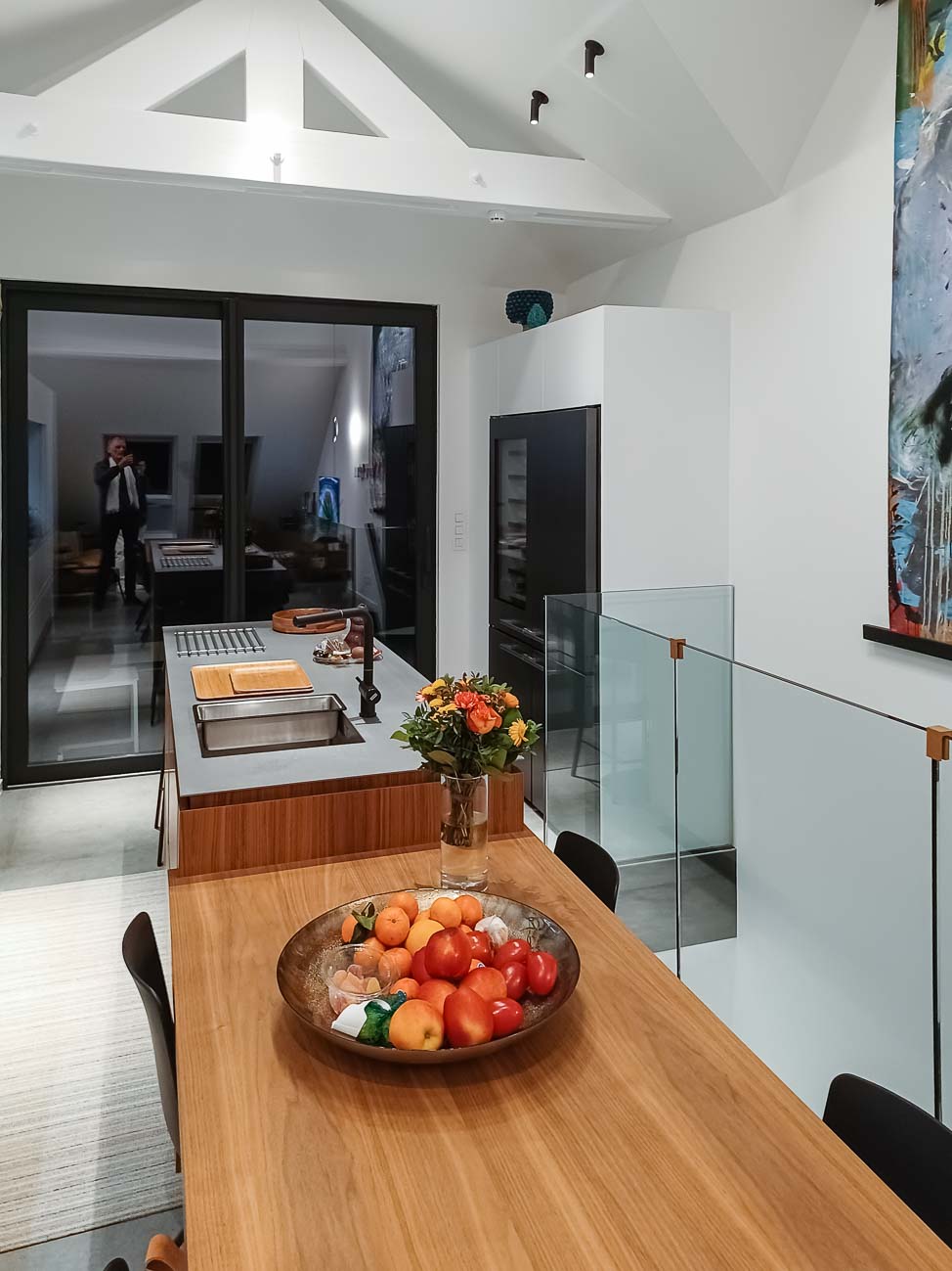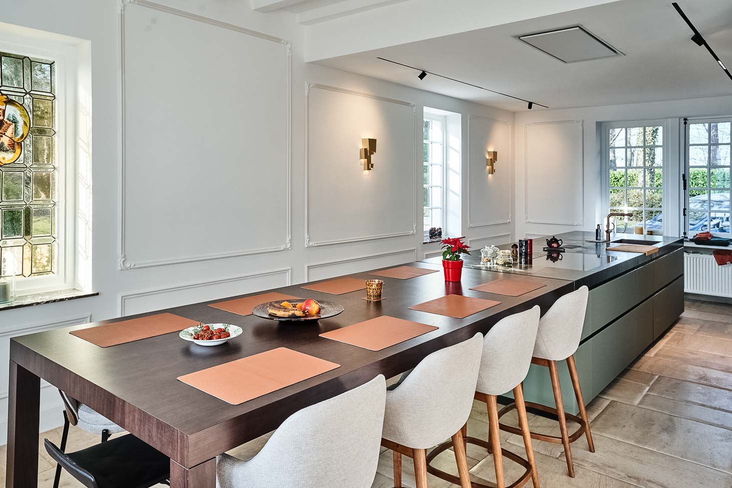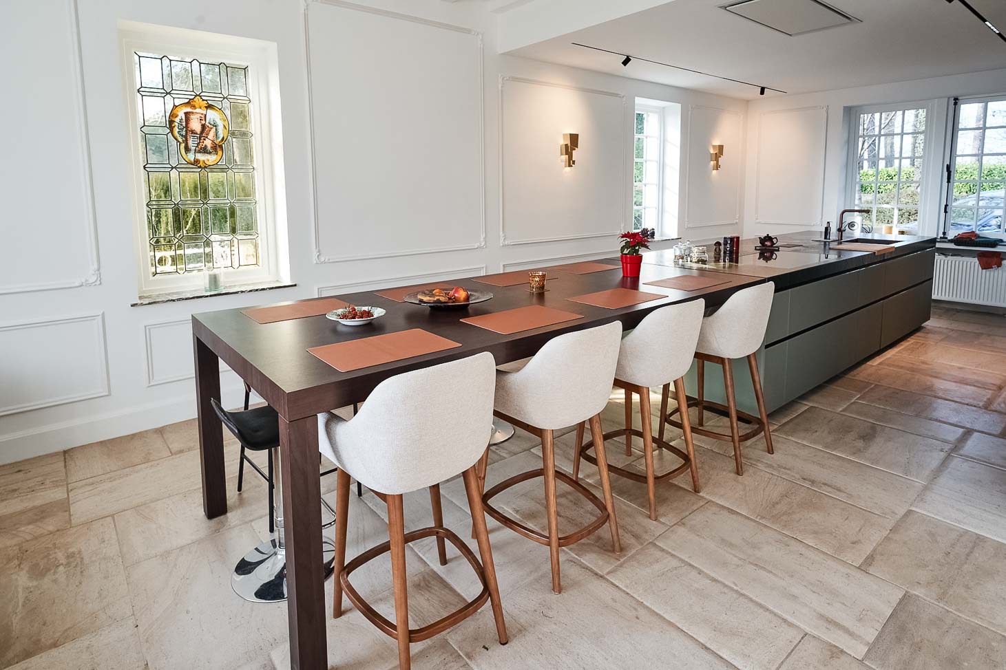 • Aménagement complet : luminaire artisanal, îlot de cuisine en verre, coin petit déjeuner en plaqué noyer, meuble de salle à manger en laqué mat :