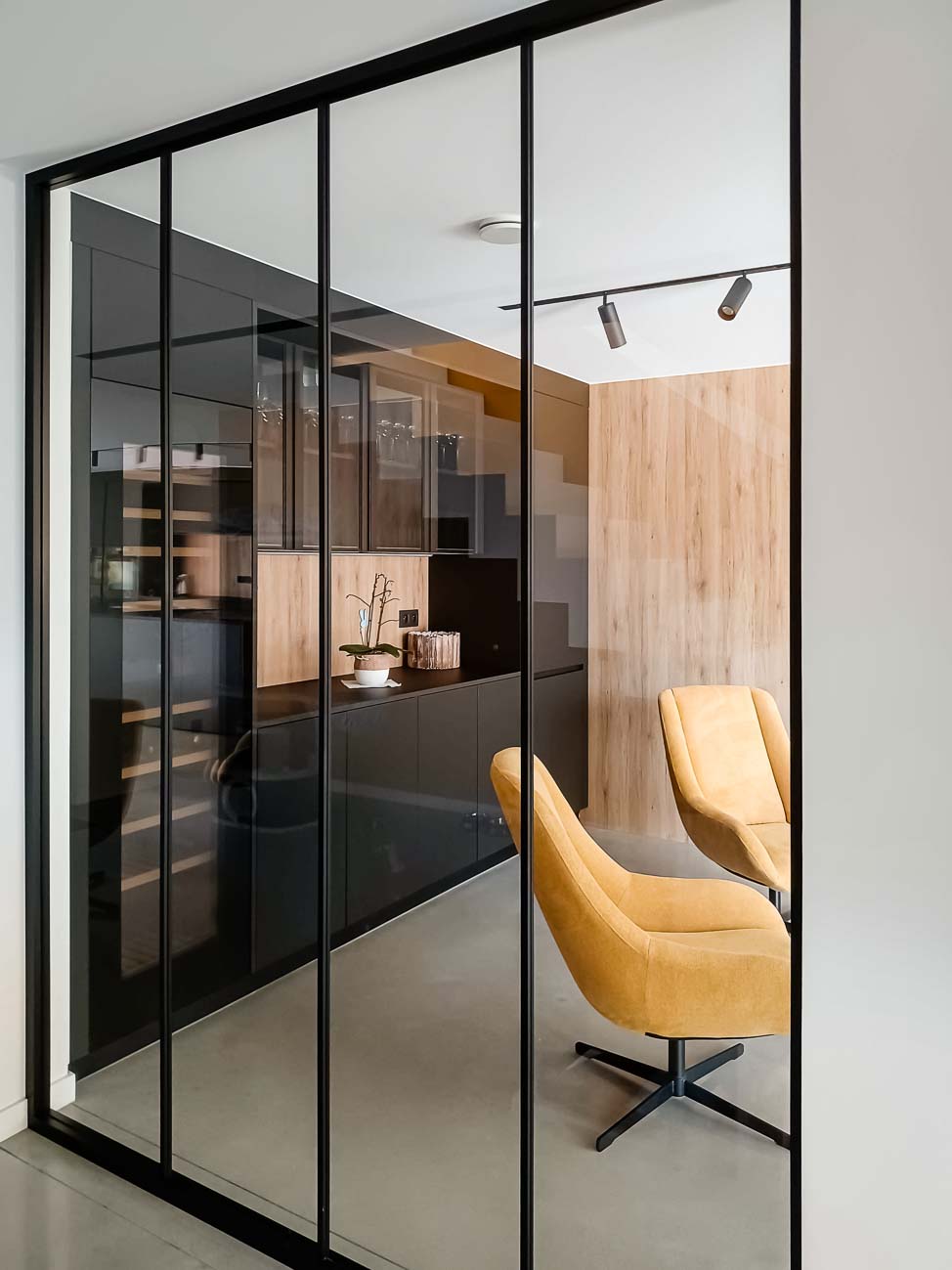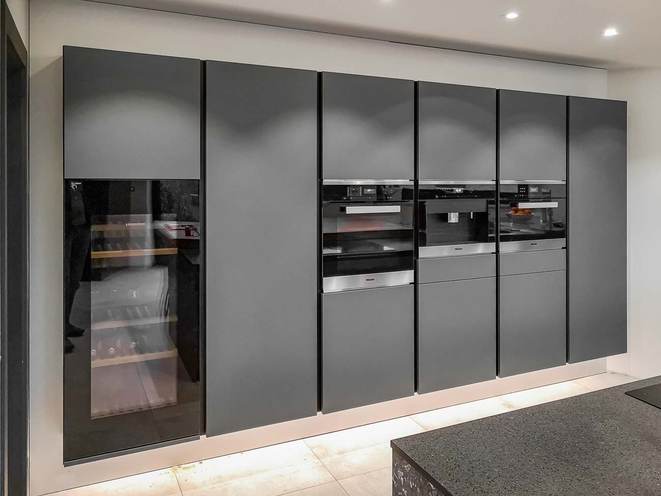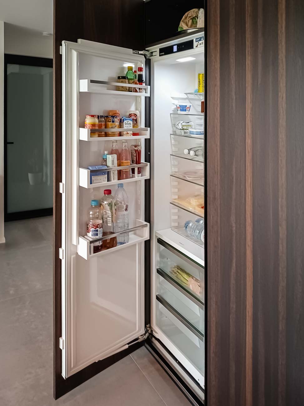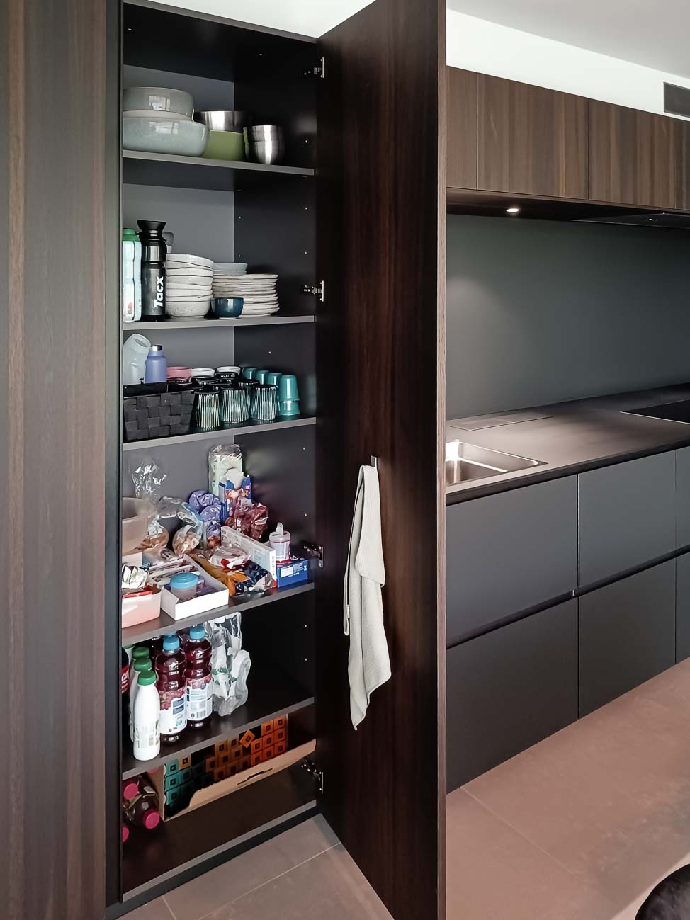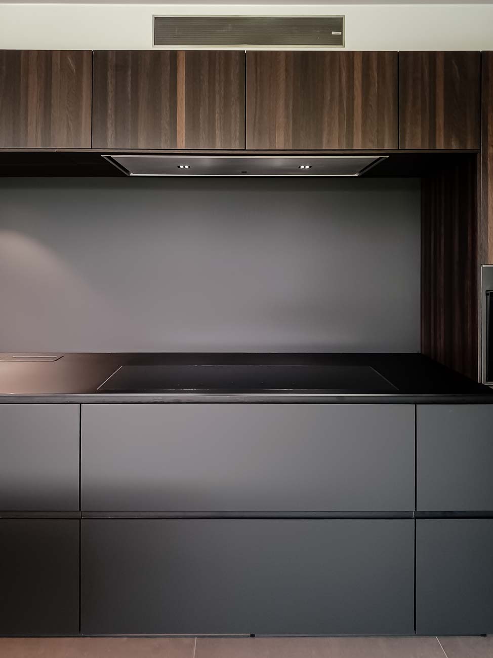 • Cuisine intégralement noire, en verre mat et plan de travail en pierre naturelle. Colonnes à portes rentrantes :