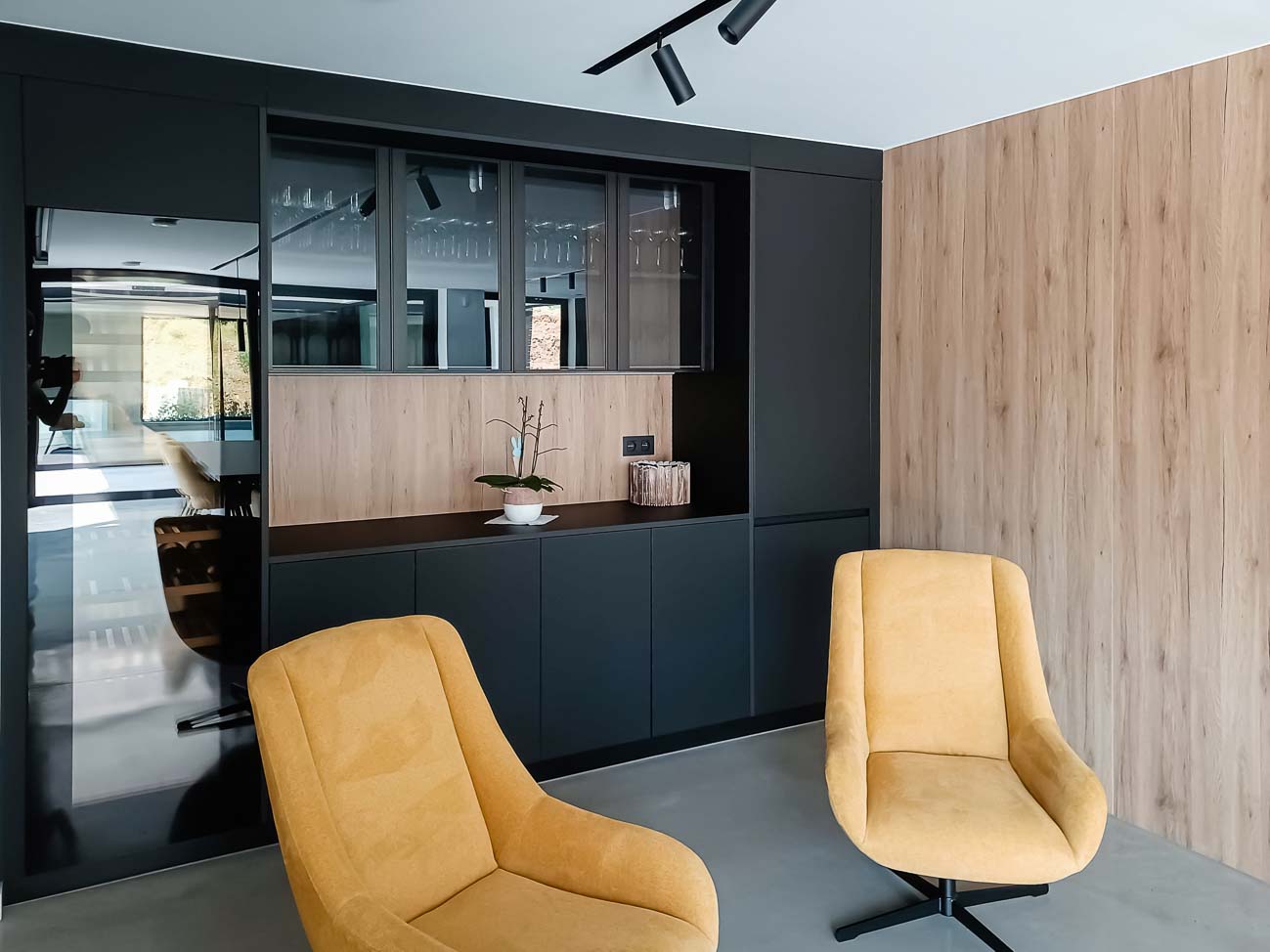 • Cuisine américaine noire, bois, et coin cave à vins :