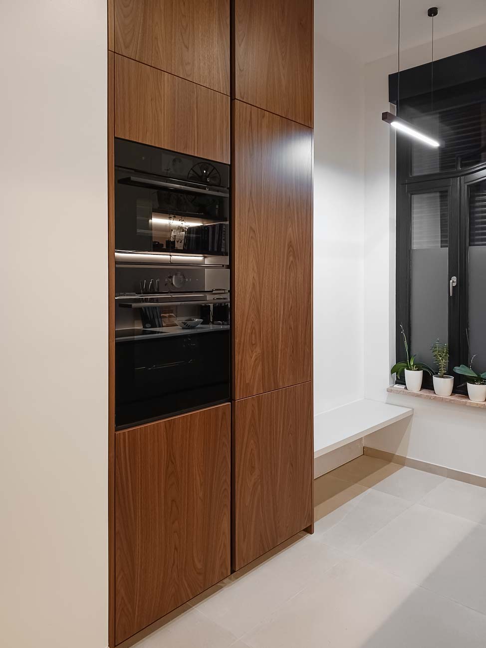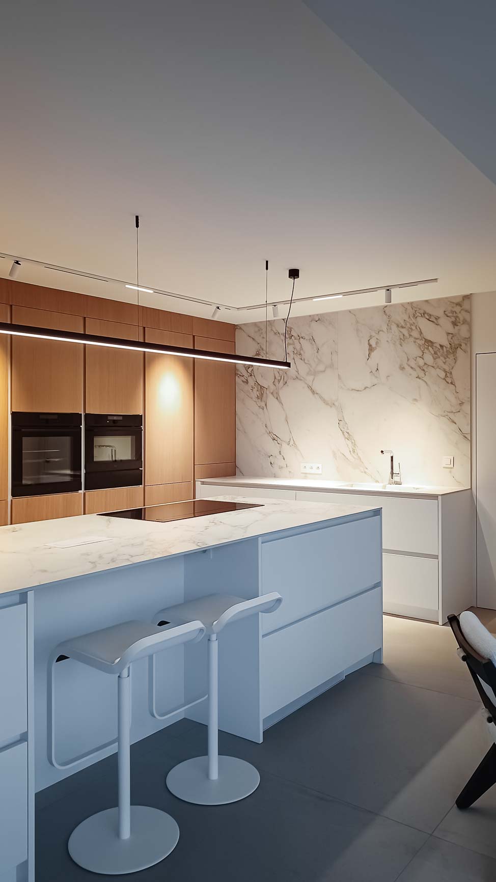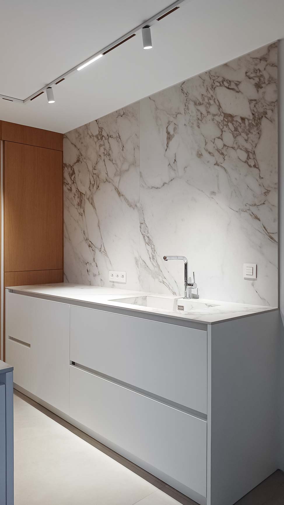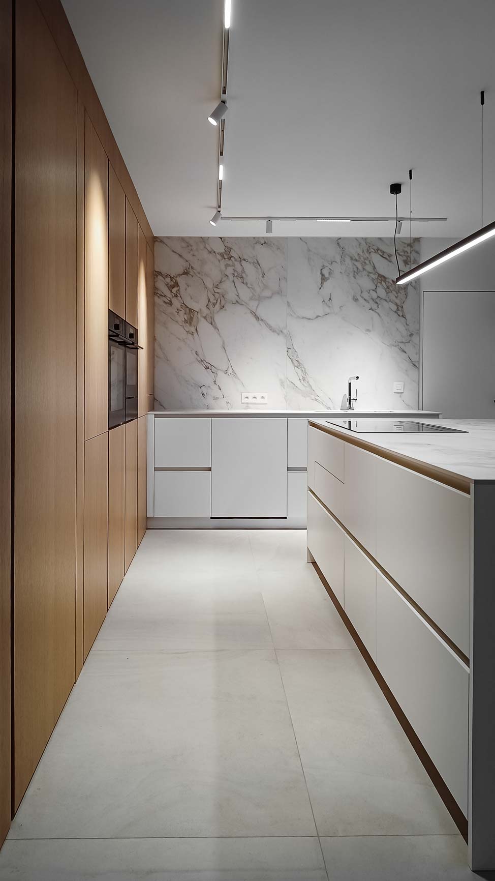 • Cuisine en plaquage noyer, laqué mat blanc et marbre blanc :