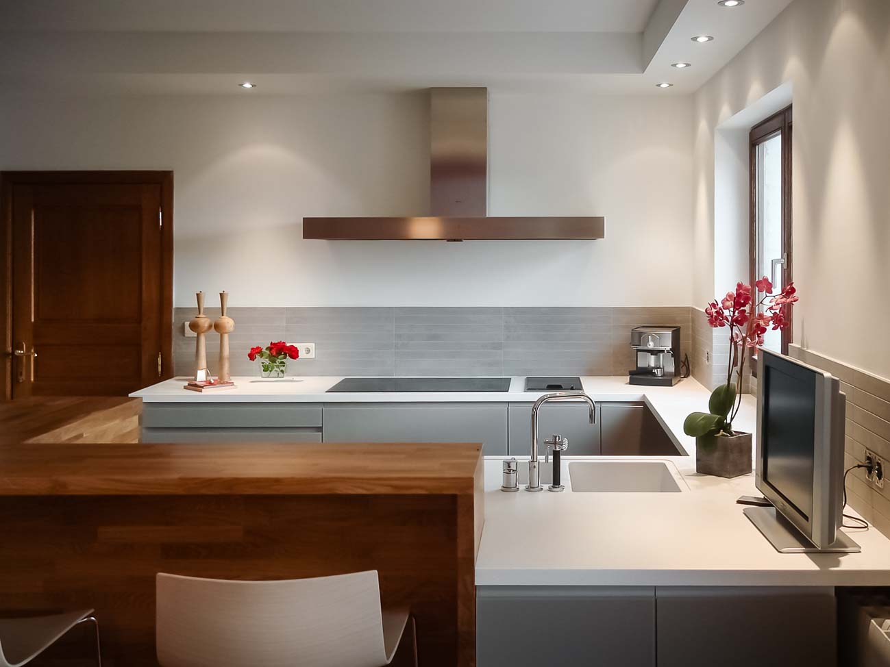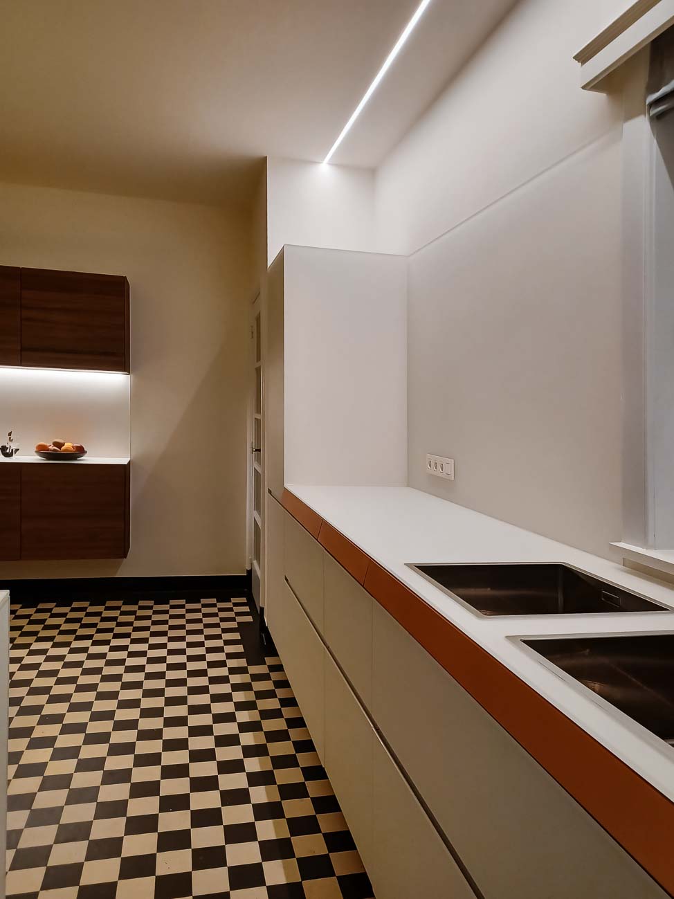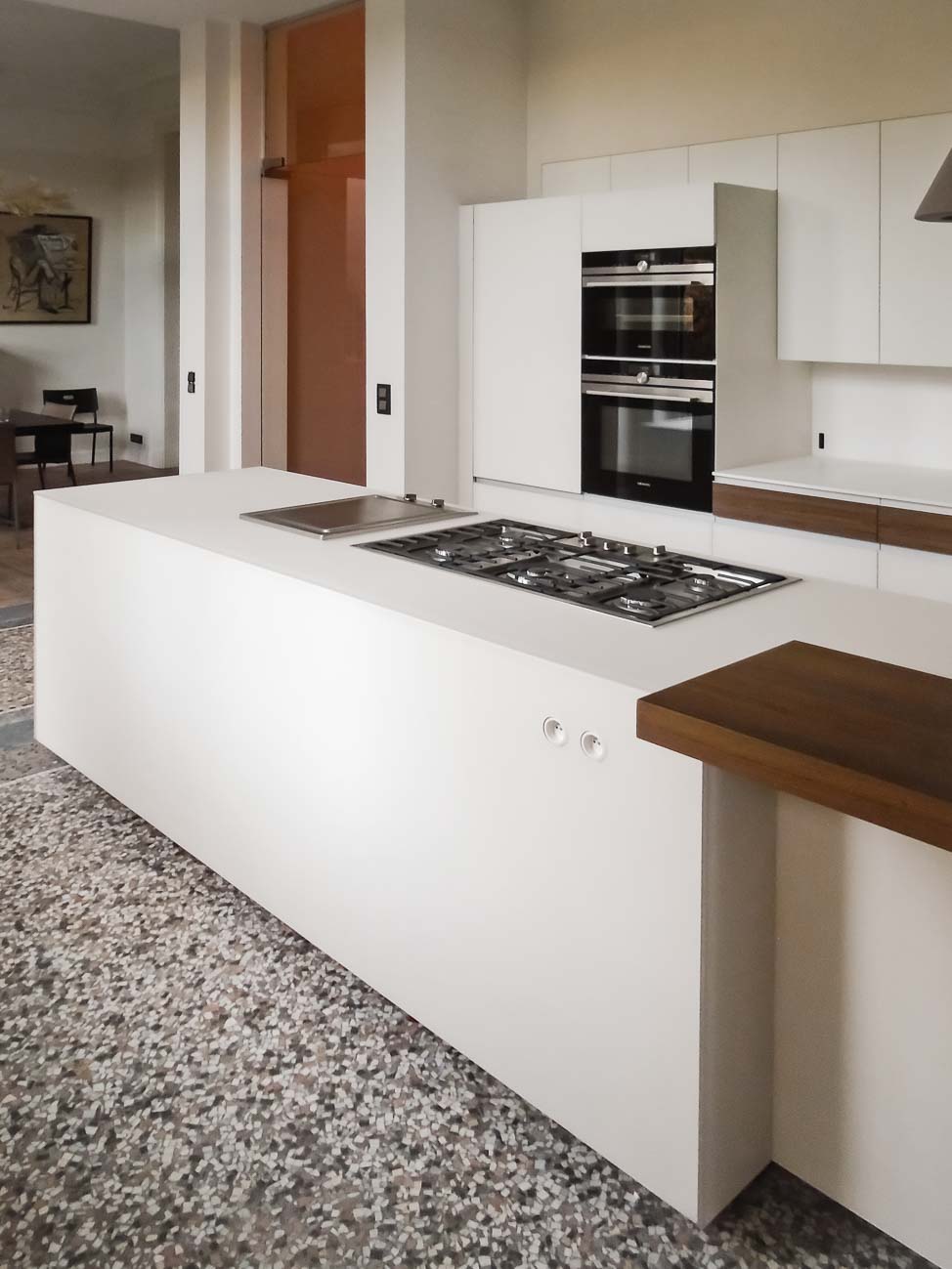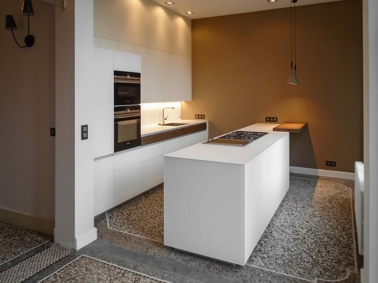 • Cuisine laqué blanc mat, détails en noyer et plan de travail en Corian :