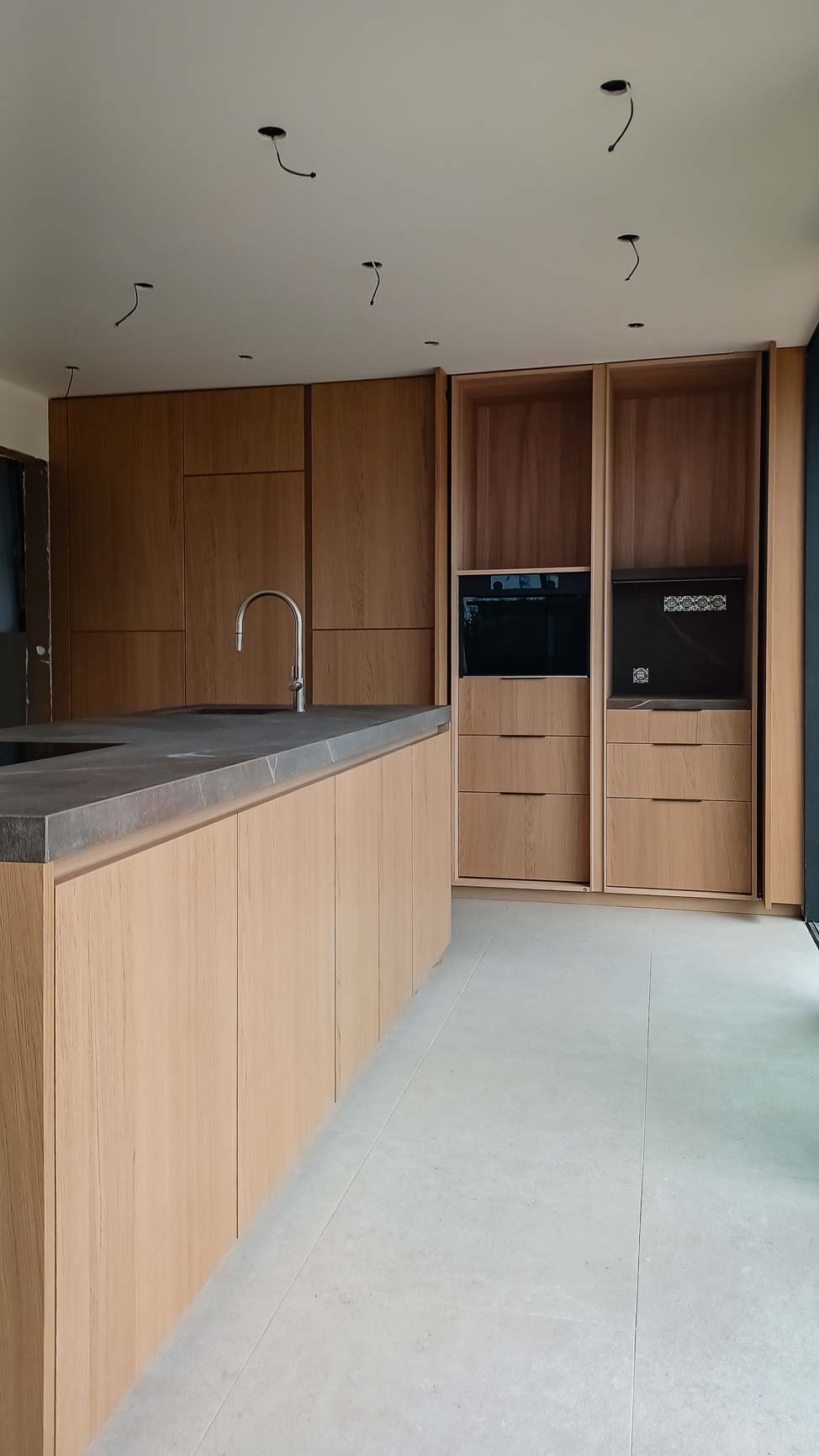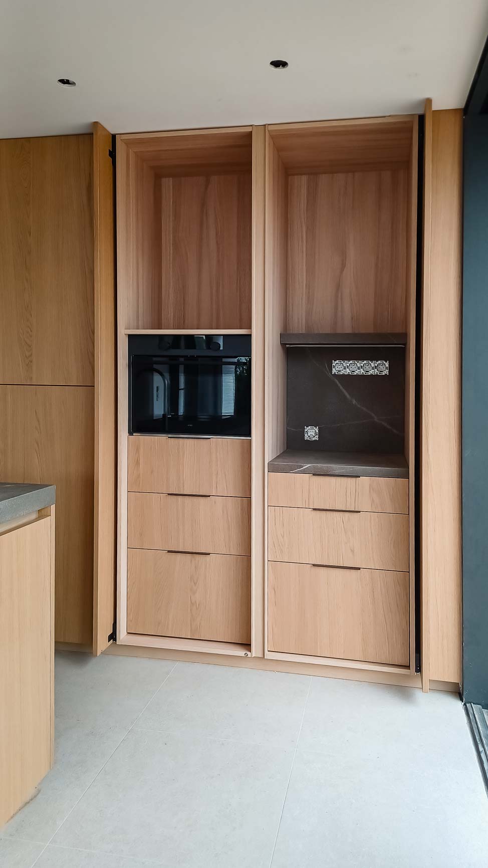 • Cuisine avec plan de travail en pierre bleue naturelle et façades plaqué chêne :