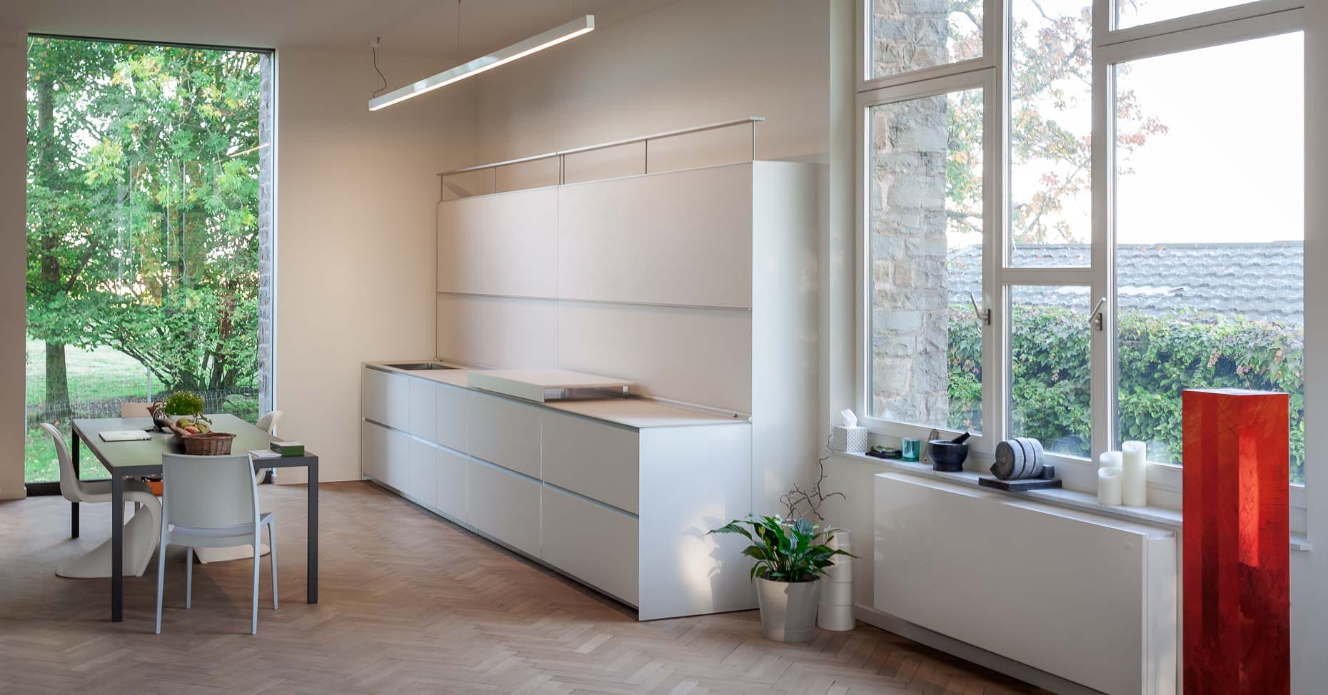 • Cuisine en verre blanc mat et colonnes laqué mat gris suspendues :
