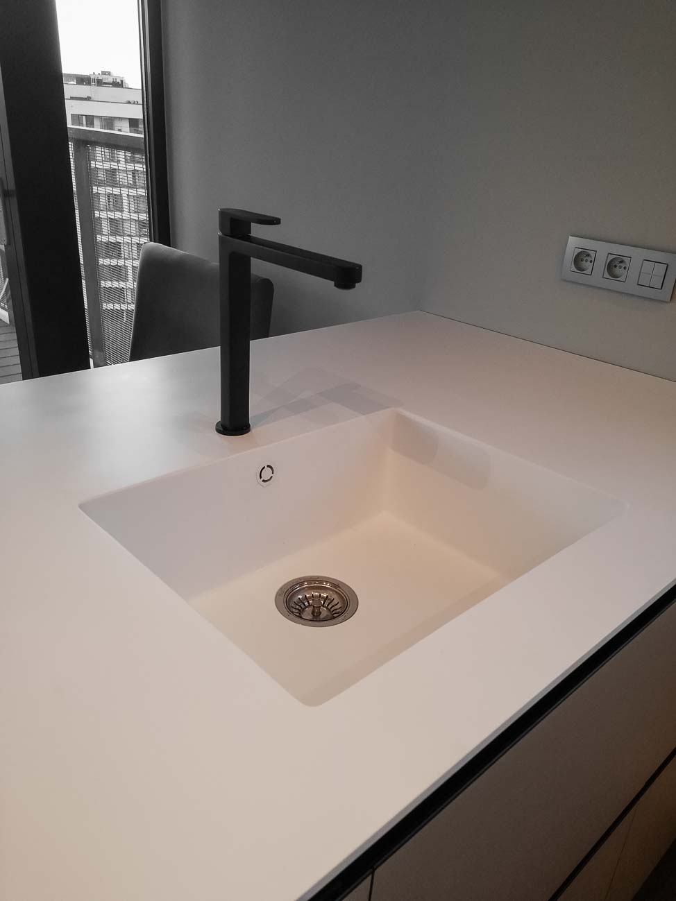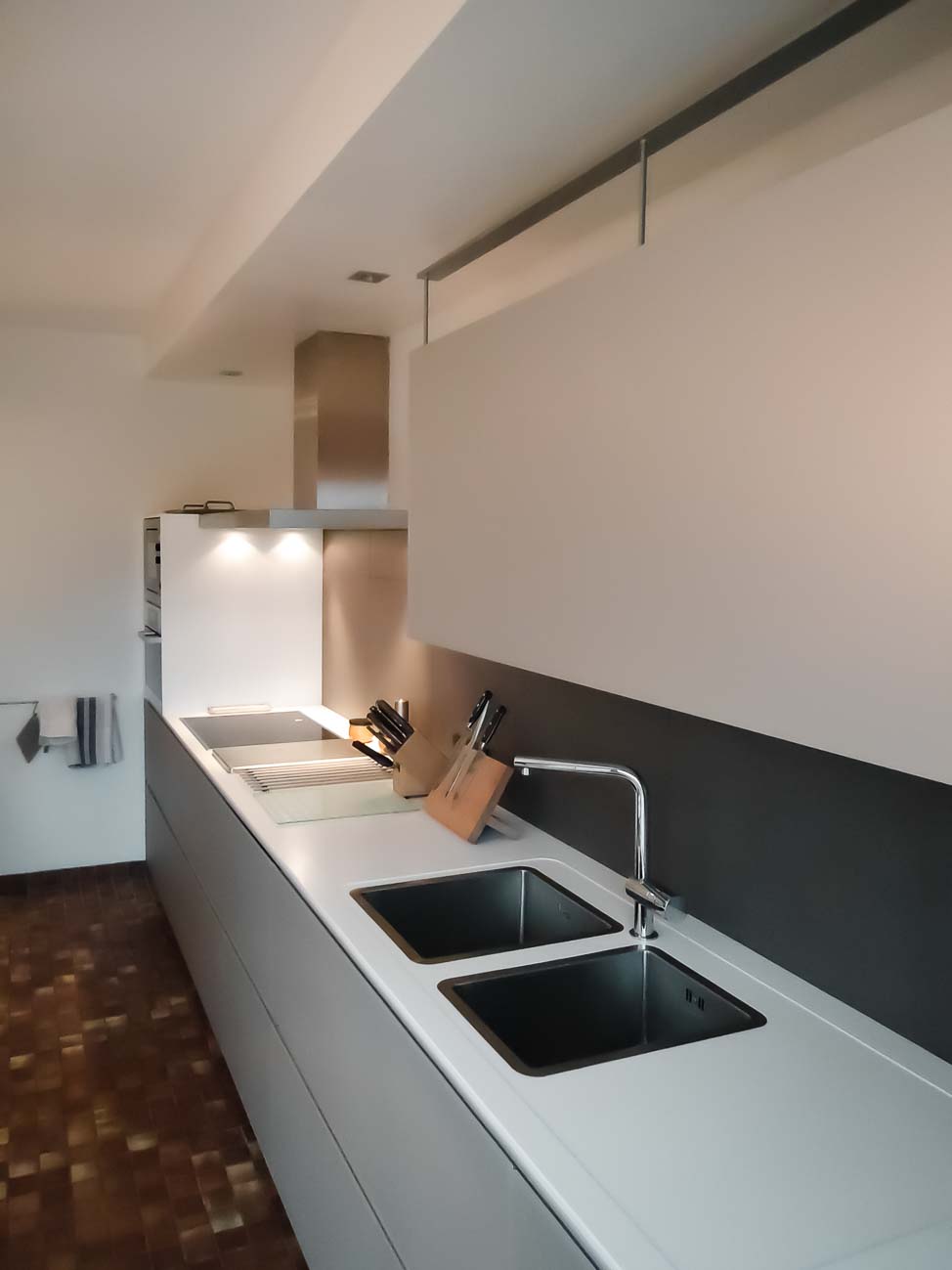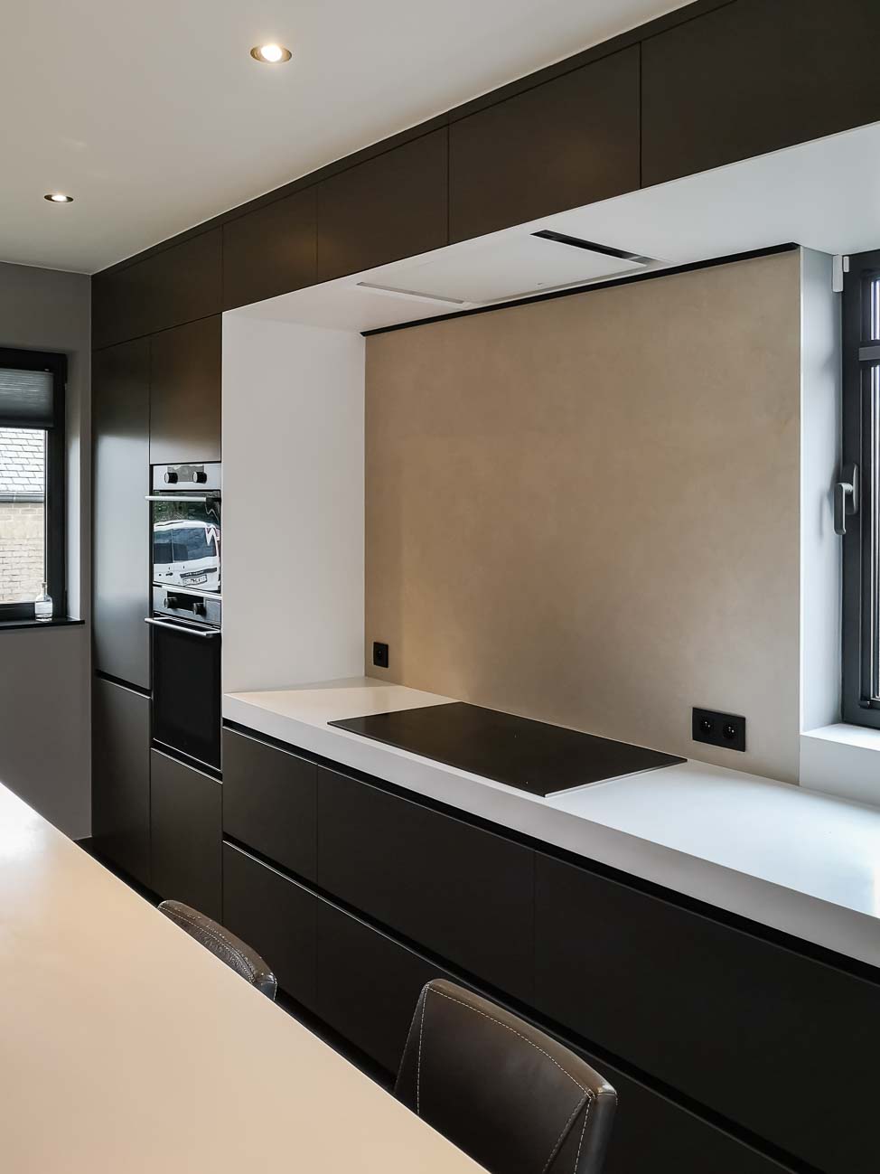 • Cuisine laqué mat gris foncé, plan de travail en Corian blanc :