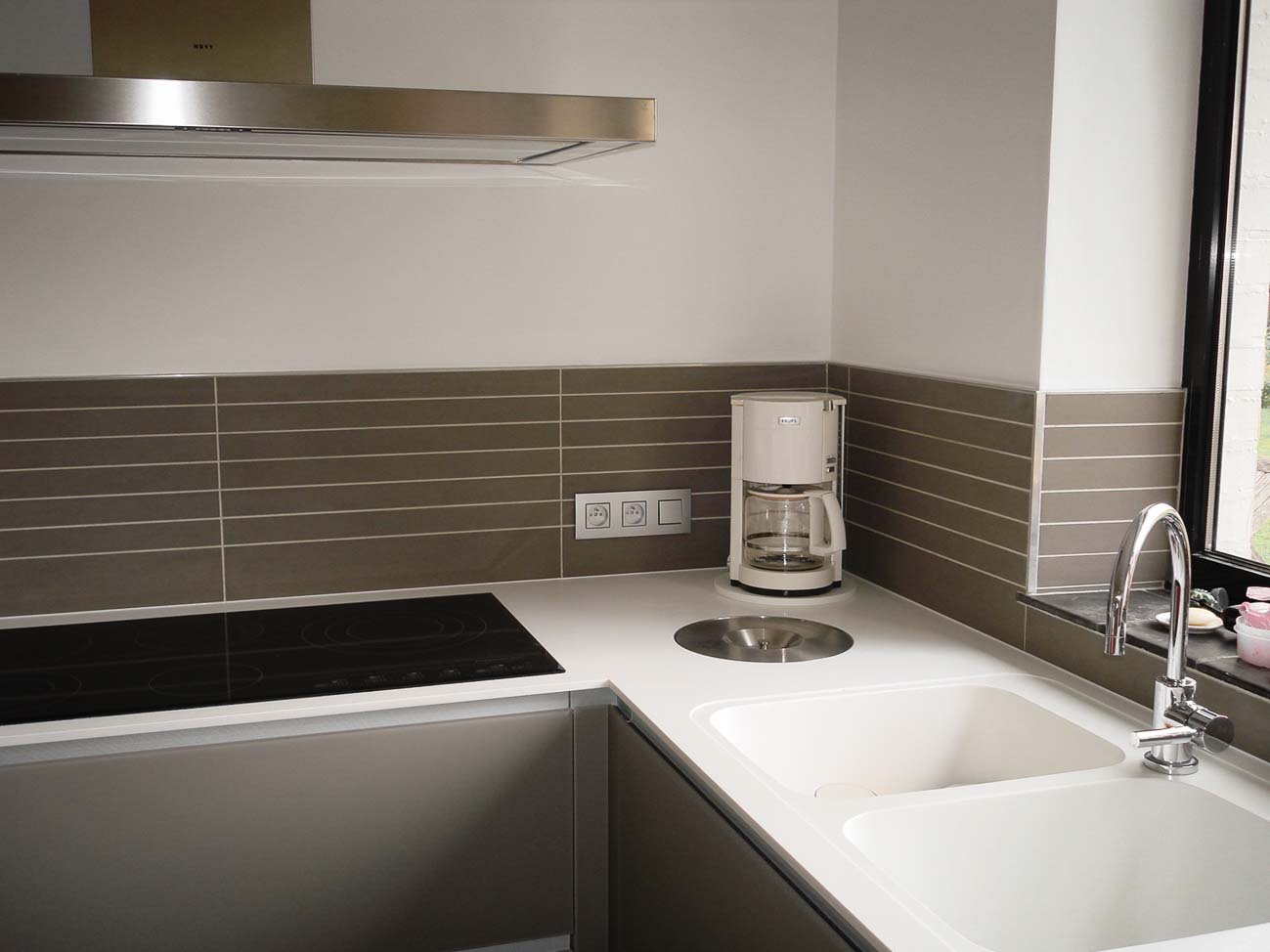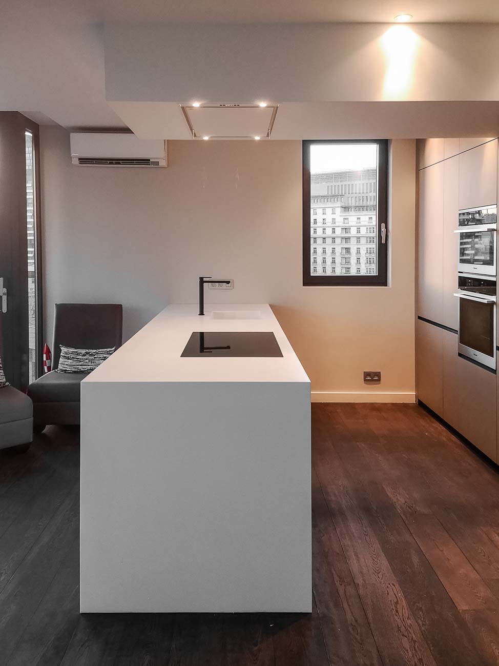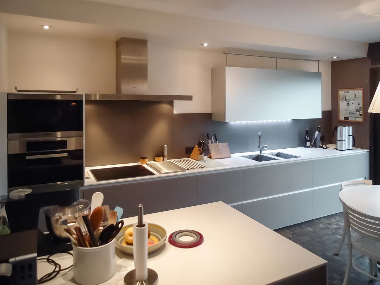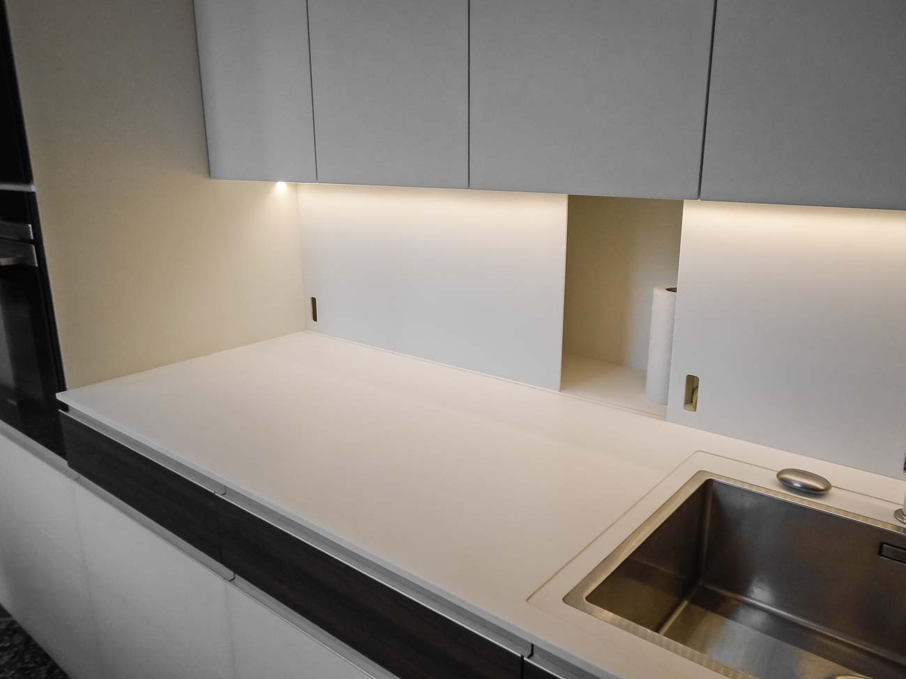 • Cuisine laqué mat gris foncé, plan de travail en Corian blanc :