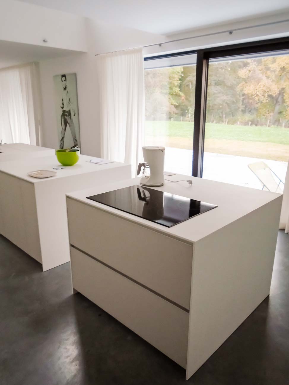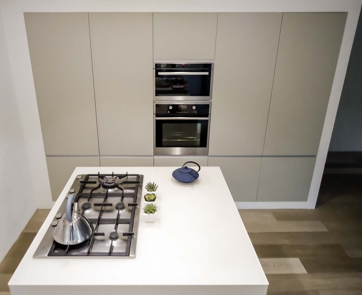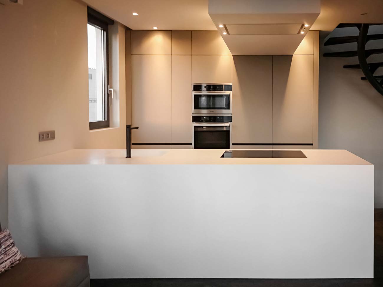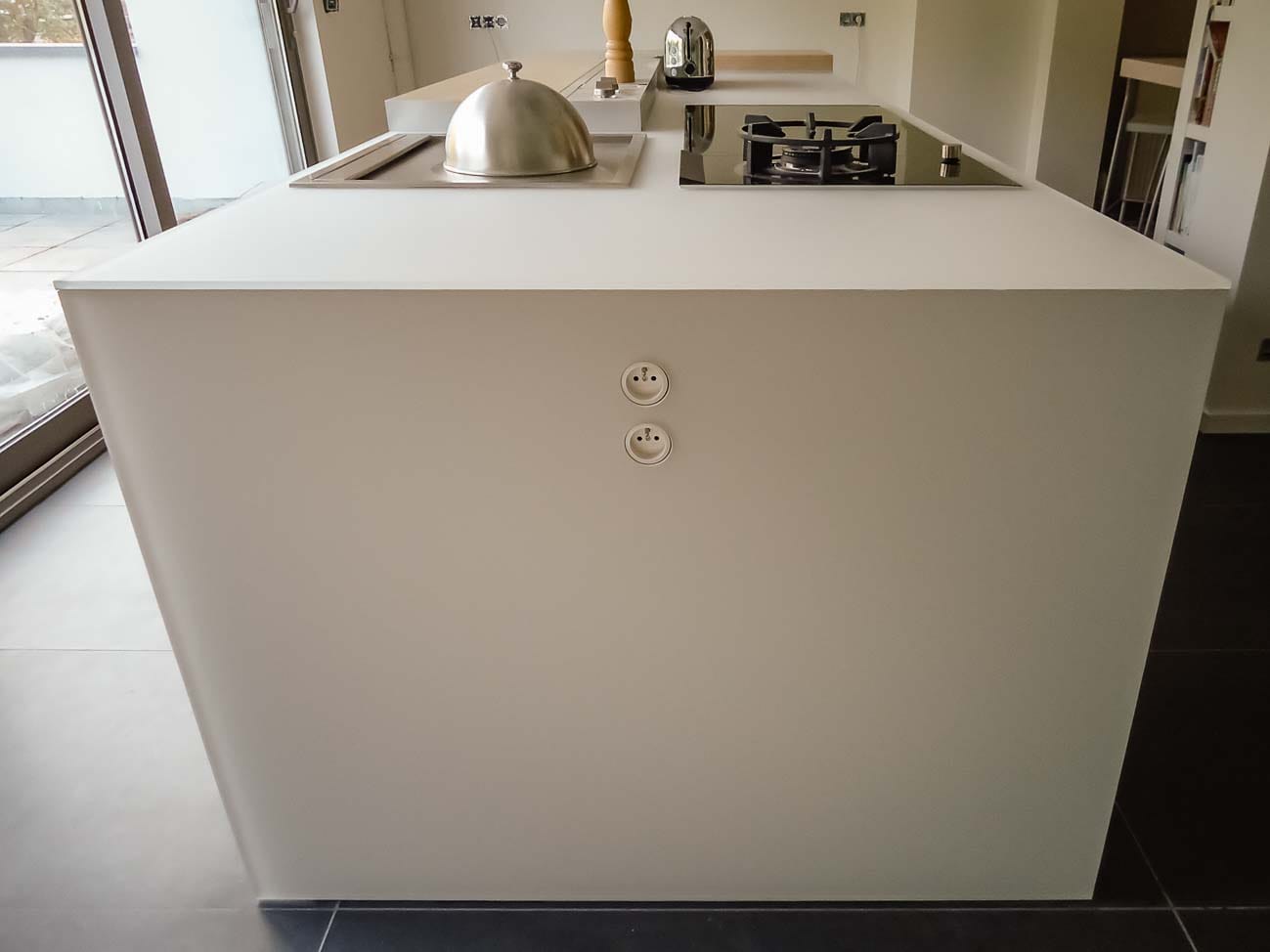 • Cuisine design avec îlot en Corian blanc, plaque de cuisson à fleur, colonnes en stratifié gris mat :
