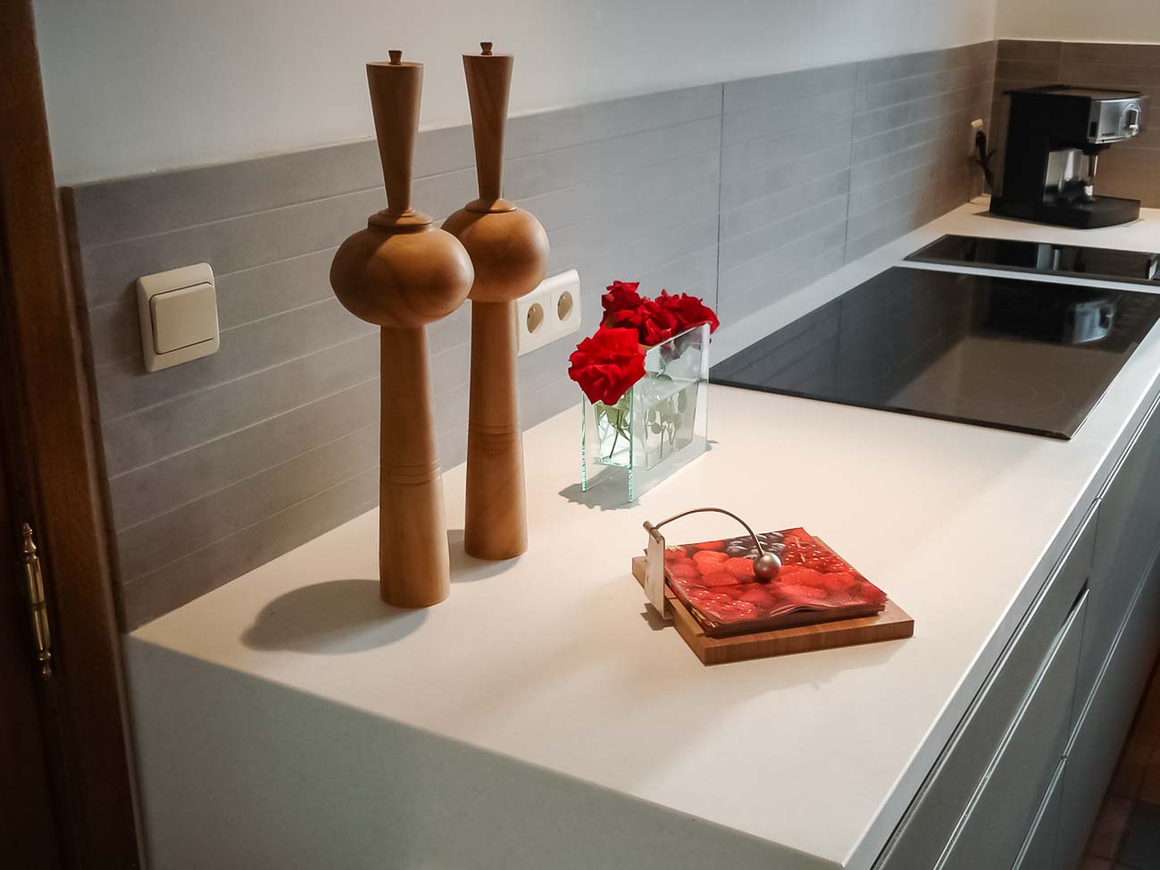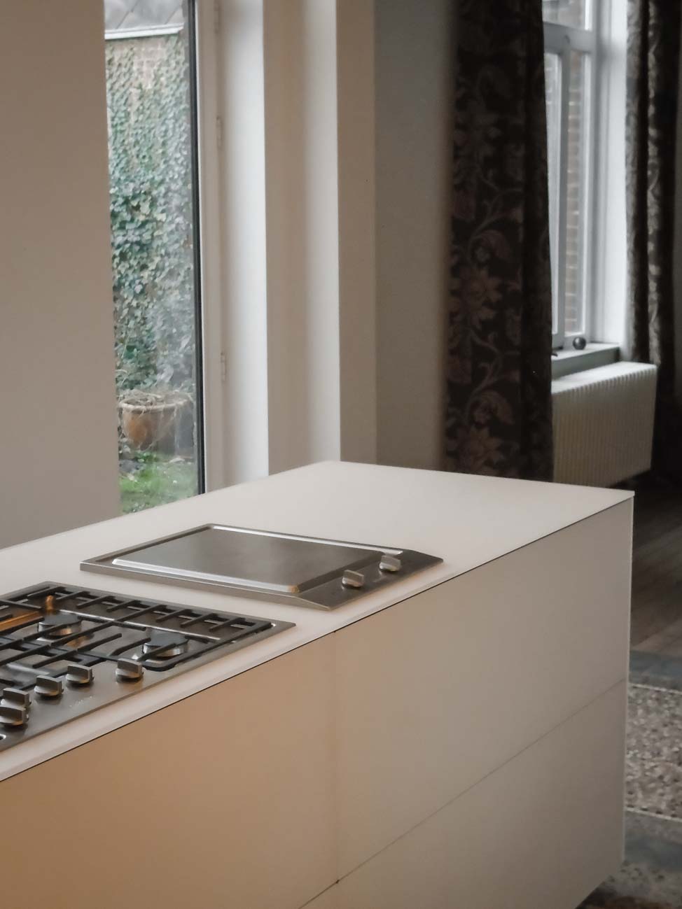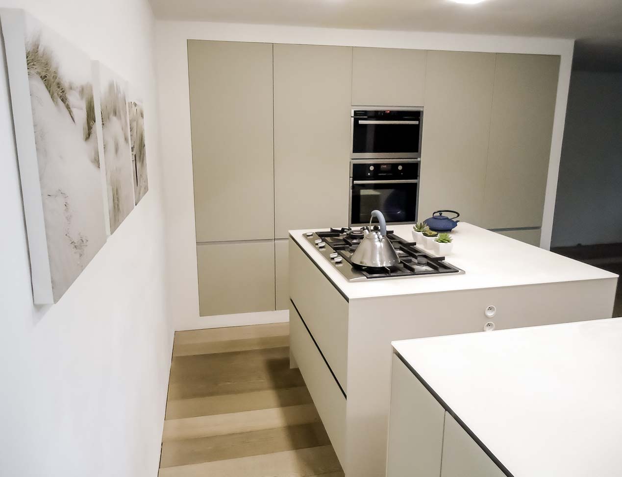 • Cuisine design avec îlot en Corian blanc, plaque de cuisson à fleur, colonnes en stratifié gris mat :
