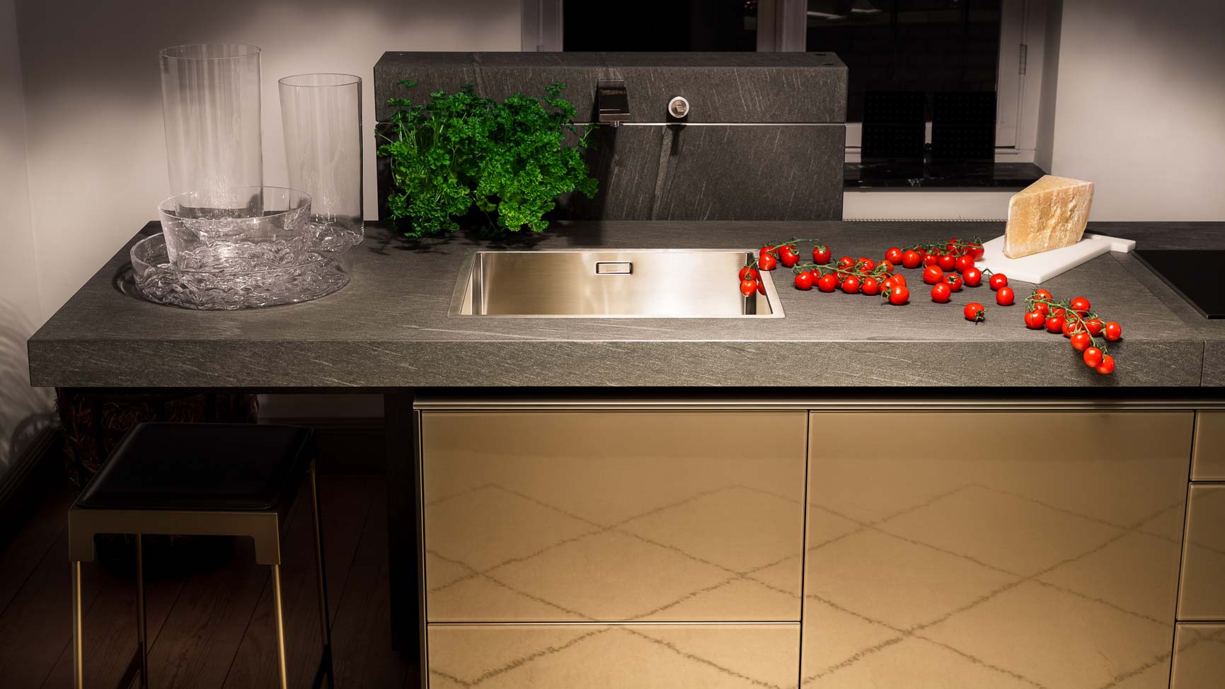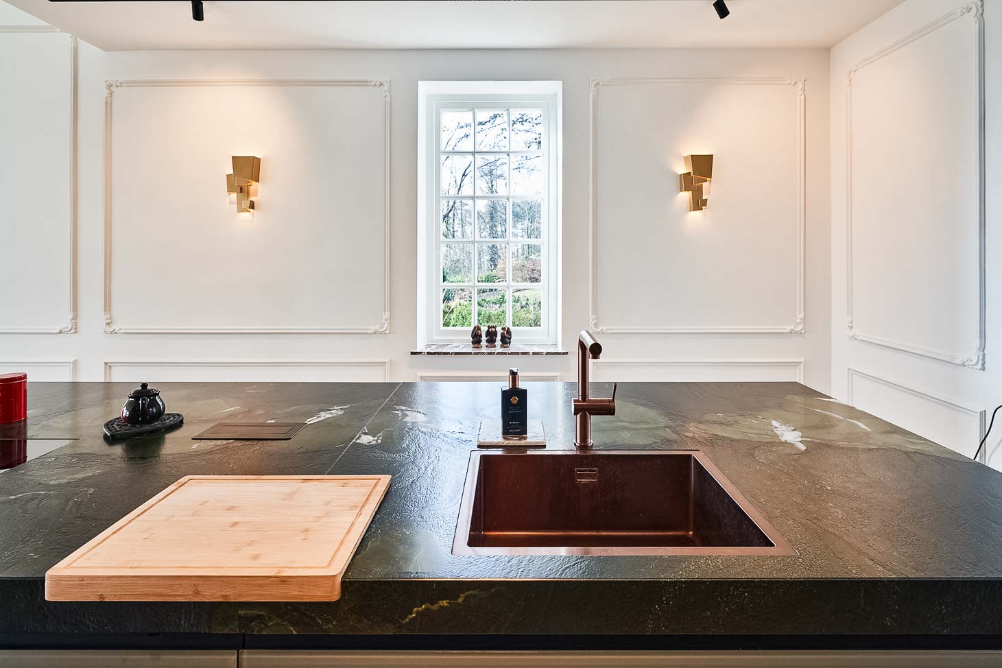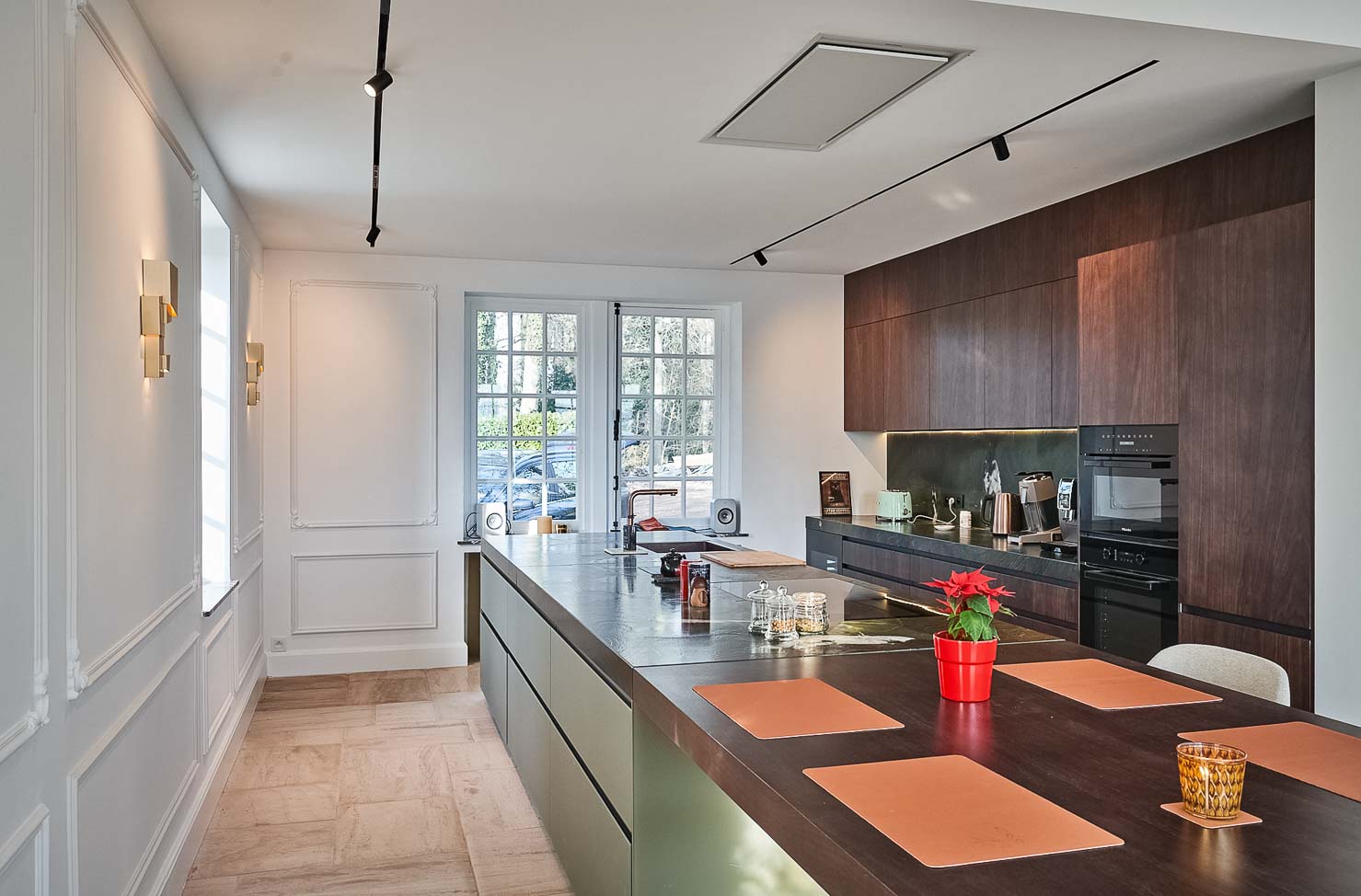 • Cuisine spacieuse haut de gamme avec plan de travail en pierre naturelle vert foncé quartzite, îlot central en verre vert olive, détails en cuivre (Inox PVD) et composition murale en noyer foncé :