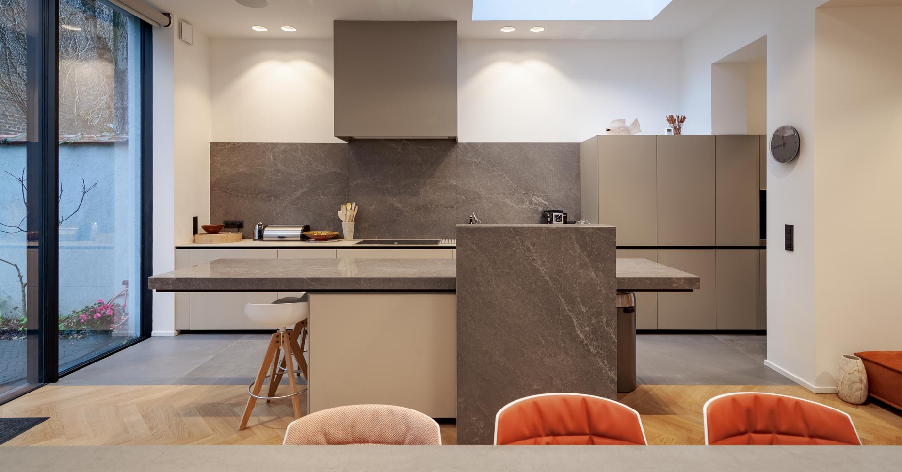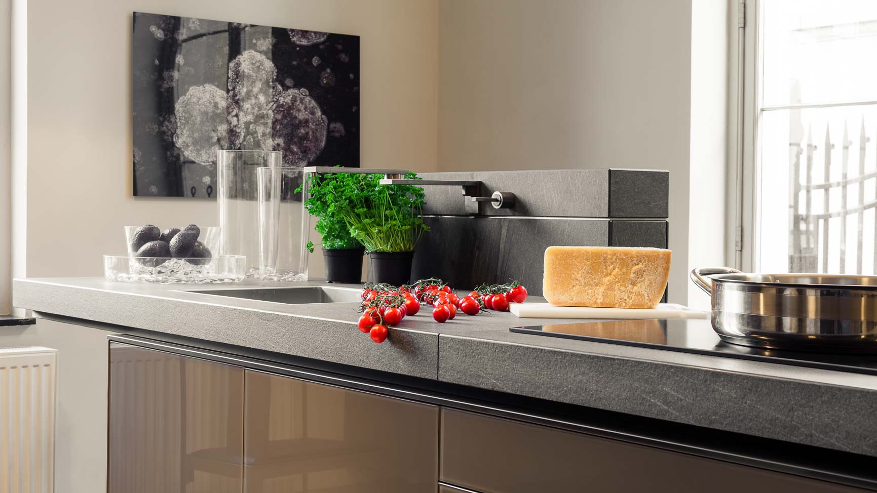 • Cuisine avec plan de travail massif en pierre et grandes colonnes en verres gris brillant suspendues :