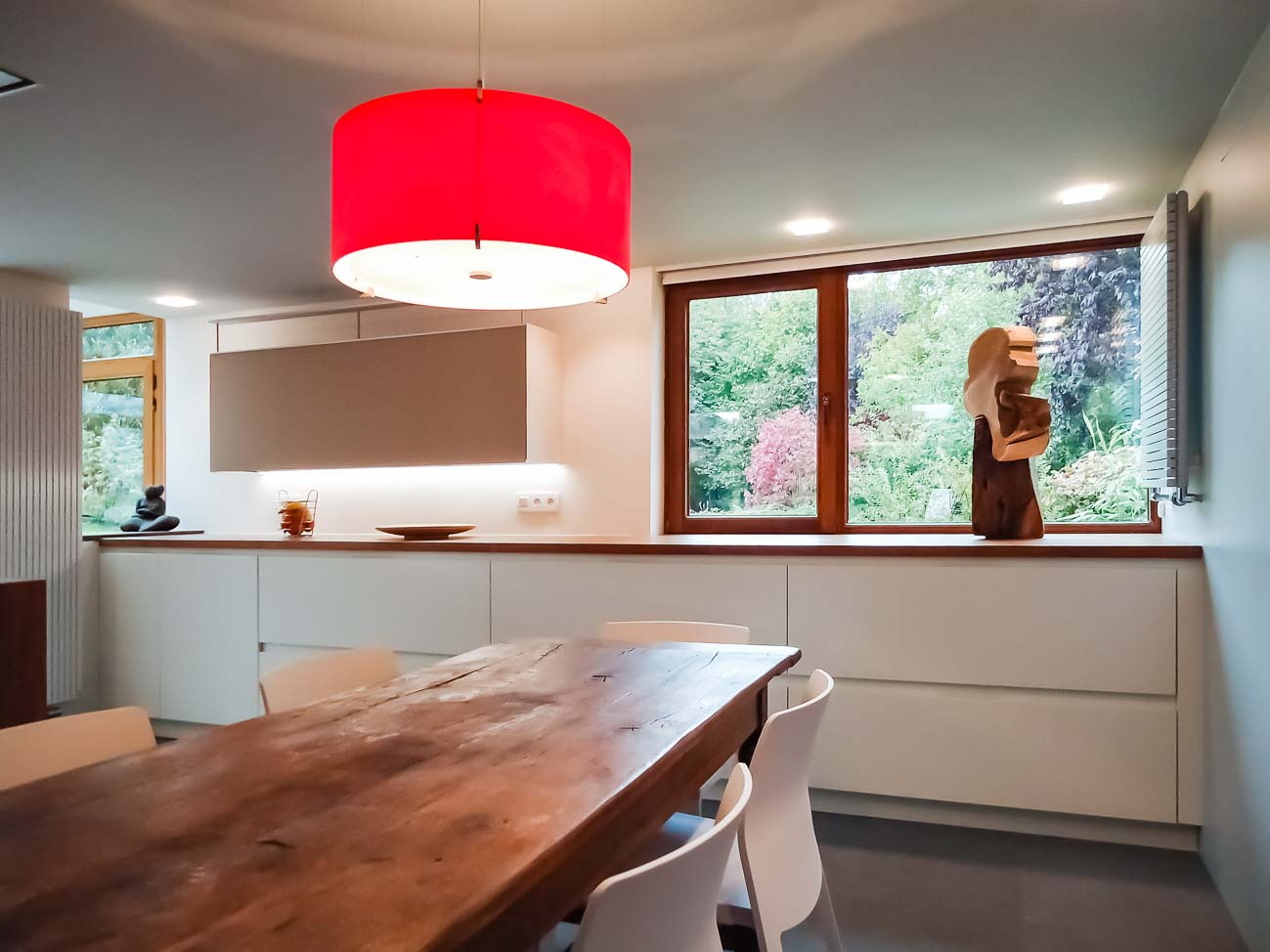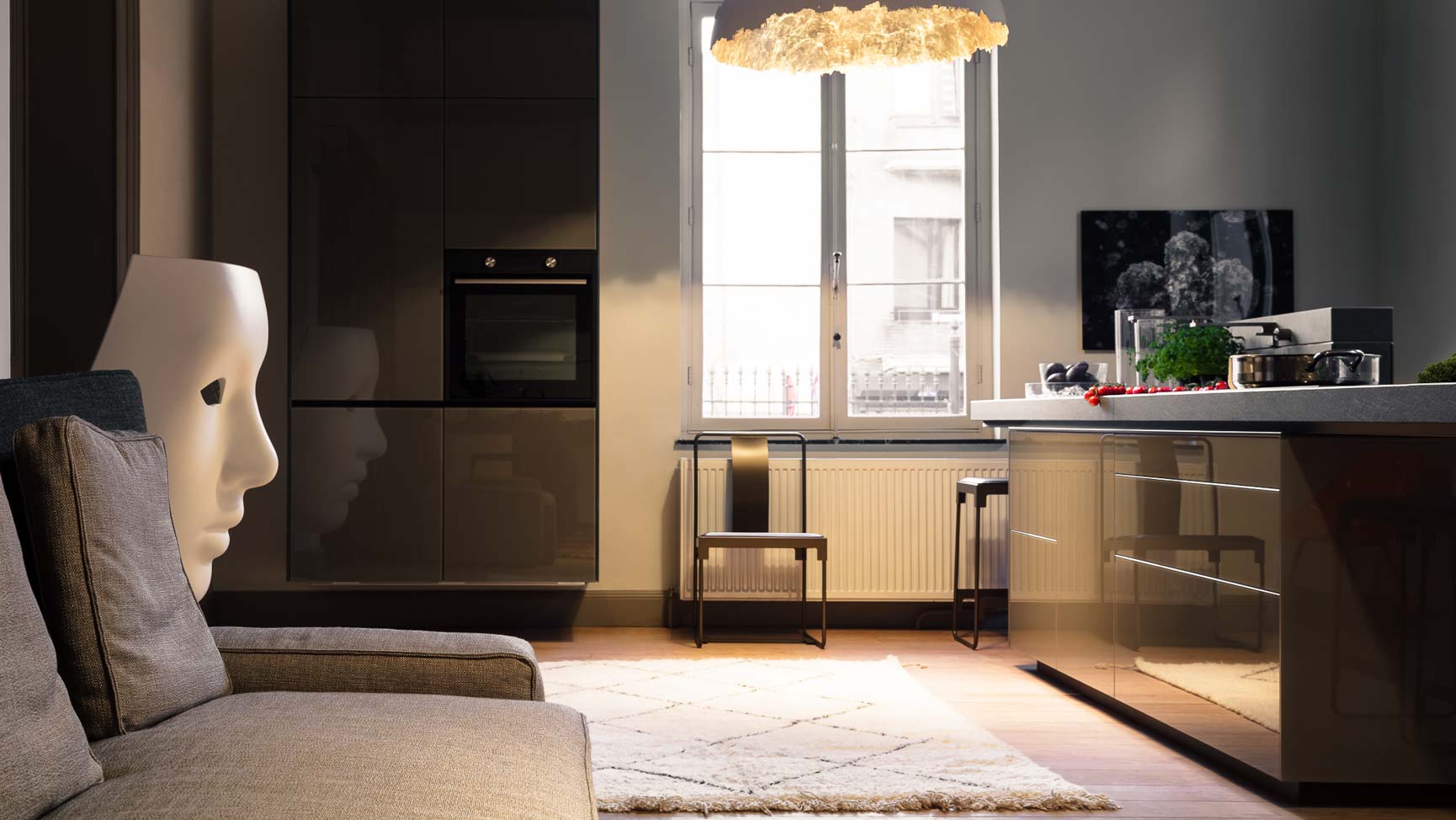 • Cuisine en verre blanc, plaquage noyer et luminaire artisanal haut de gamme :