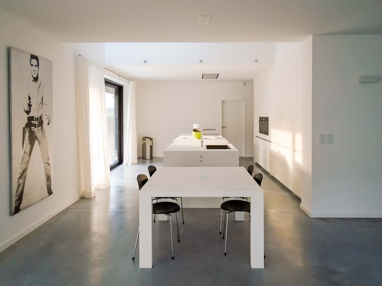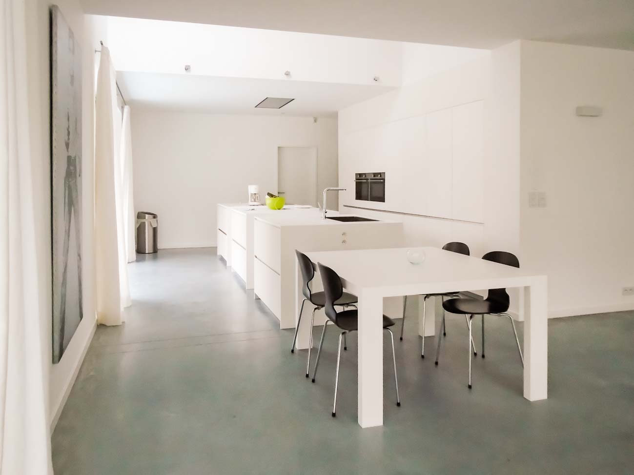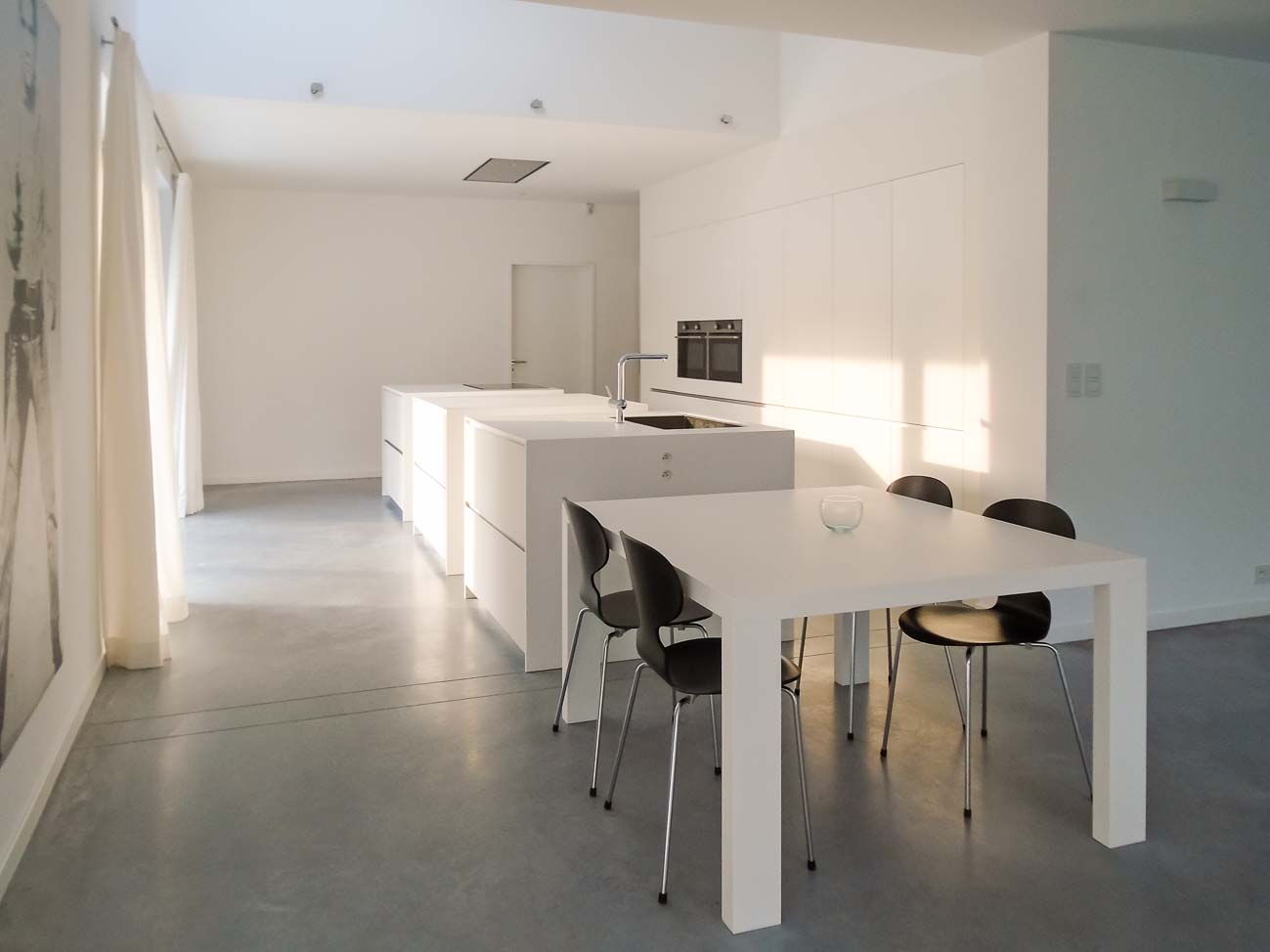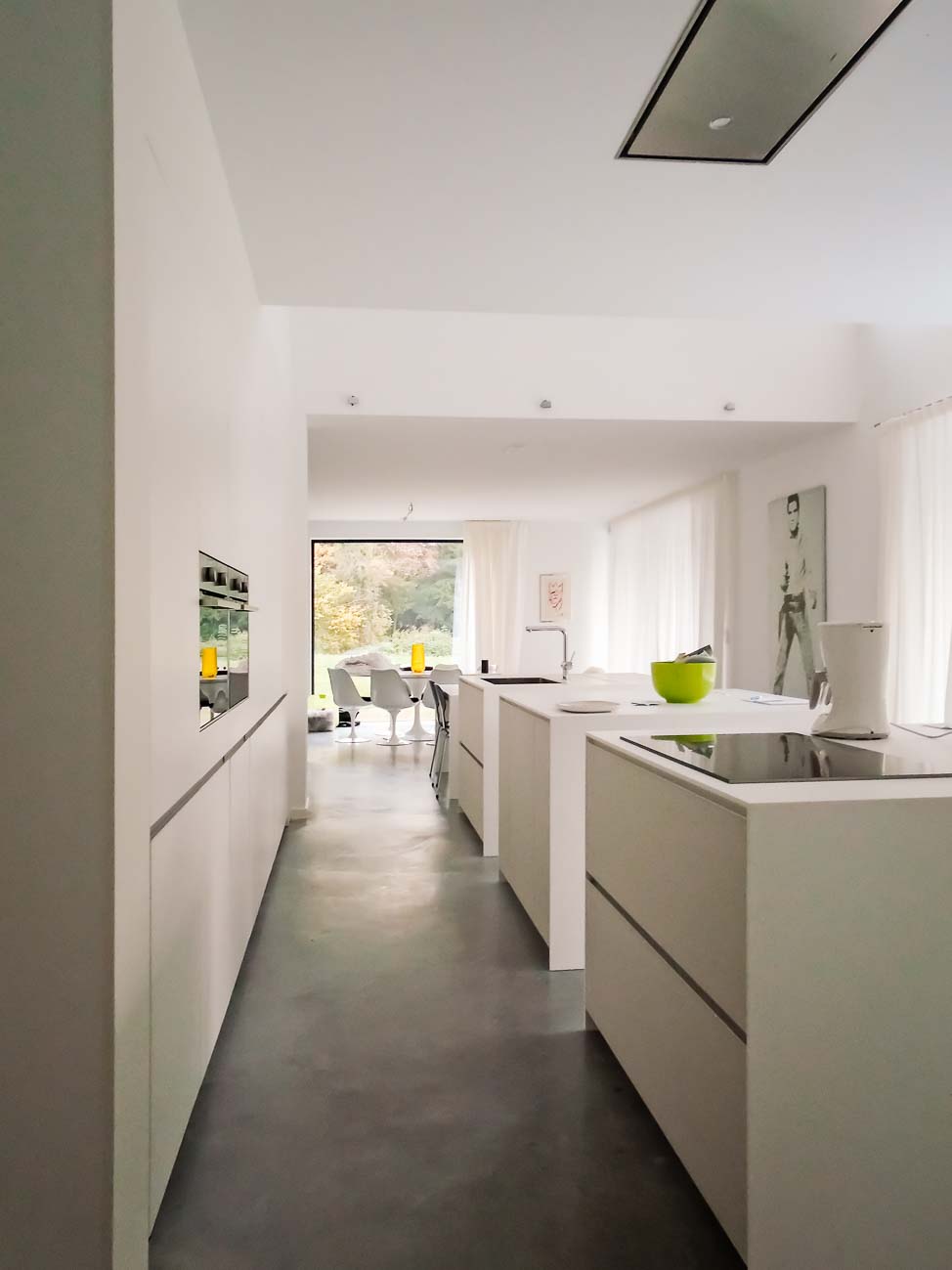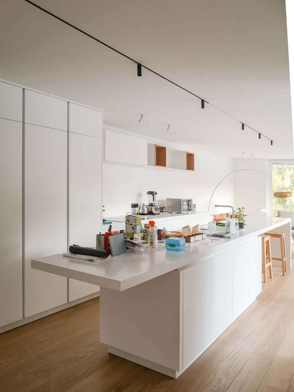 • Cuisine américaine minimaliste blanche laqué mat et Corian :