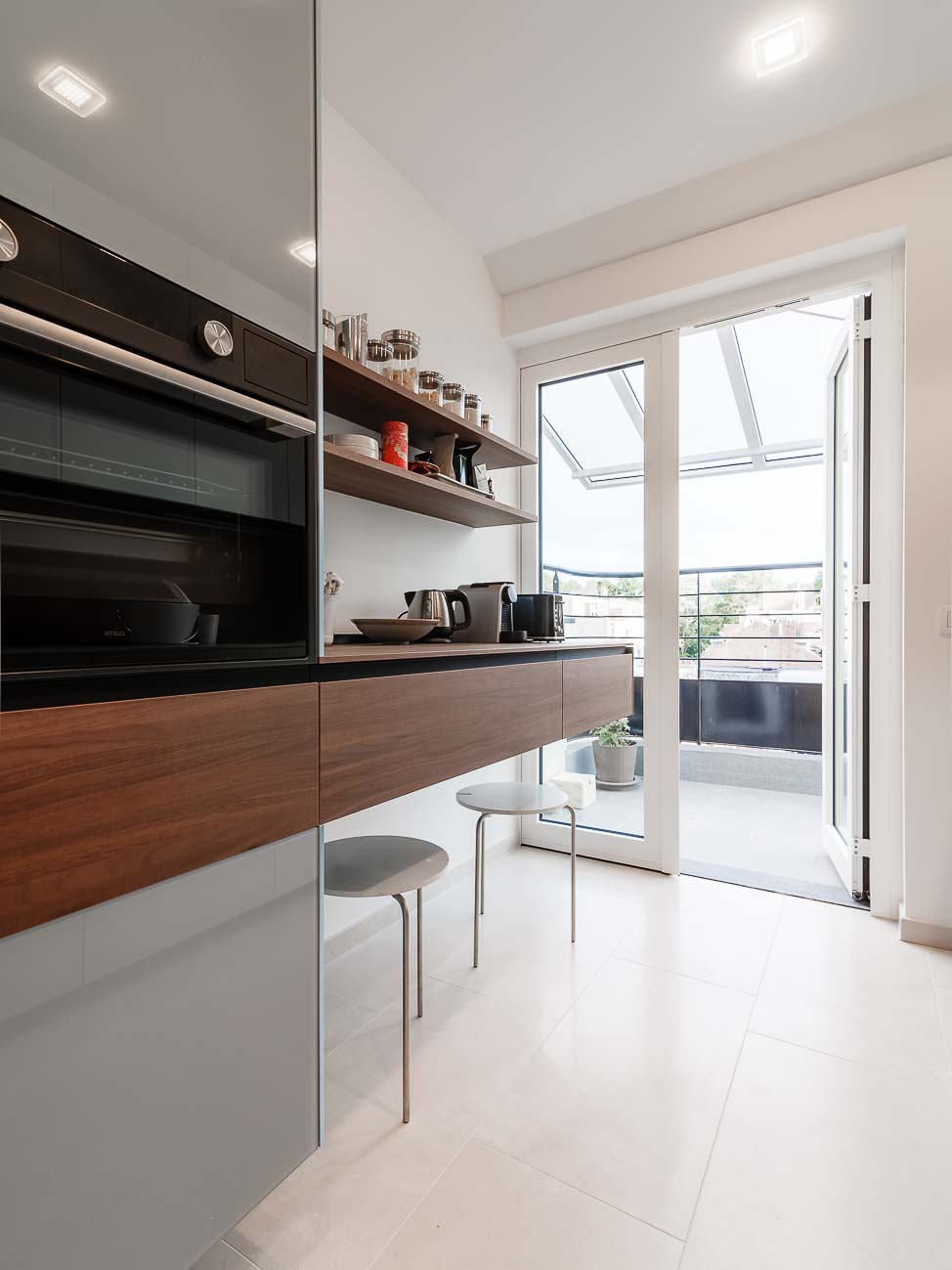• Cuisine en verre gris bleuté mat et brillant avec plaquage bois, noyer :