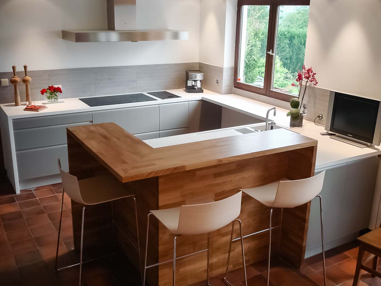 • Cuisine en verre gris et plan de travail en Corian blanc avec coin snack en bois massif :