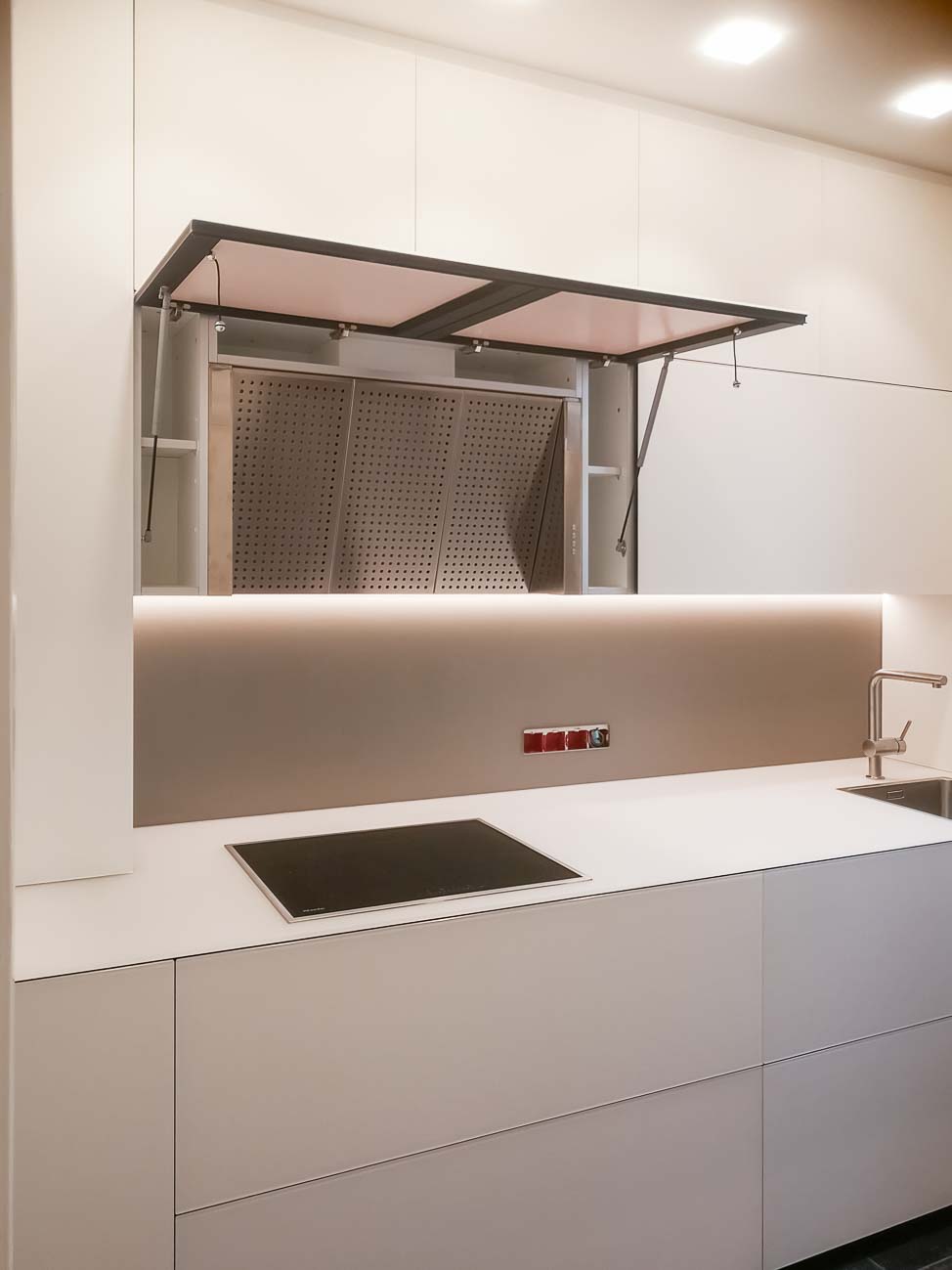 • Cuisine en verre blanc mat, hotte cachée et colonnes en verre gris suspendues :