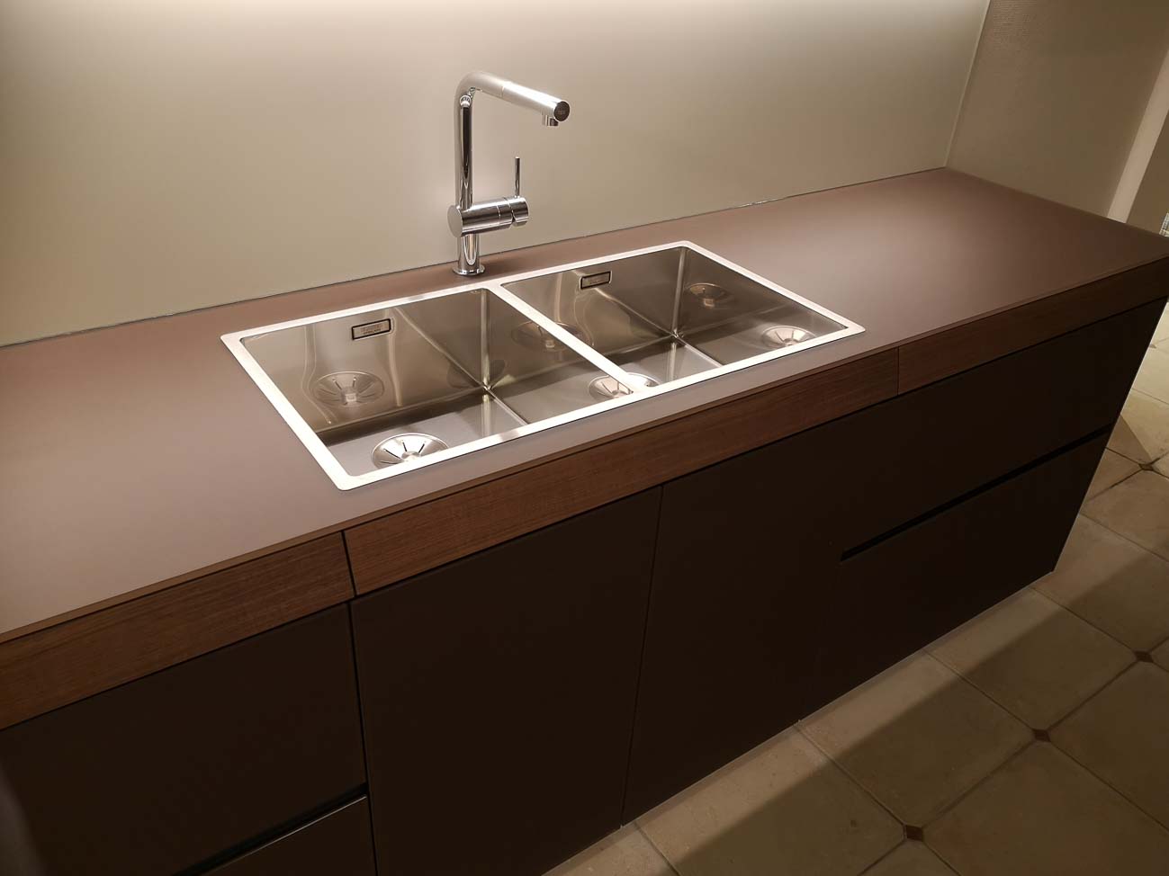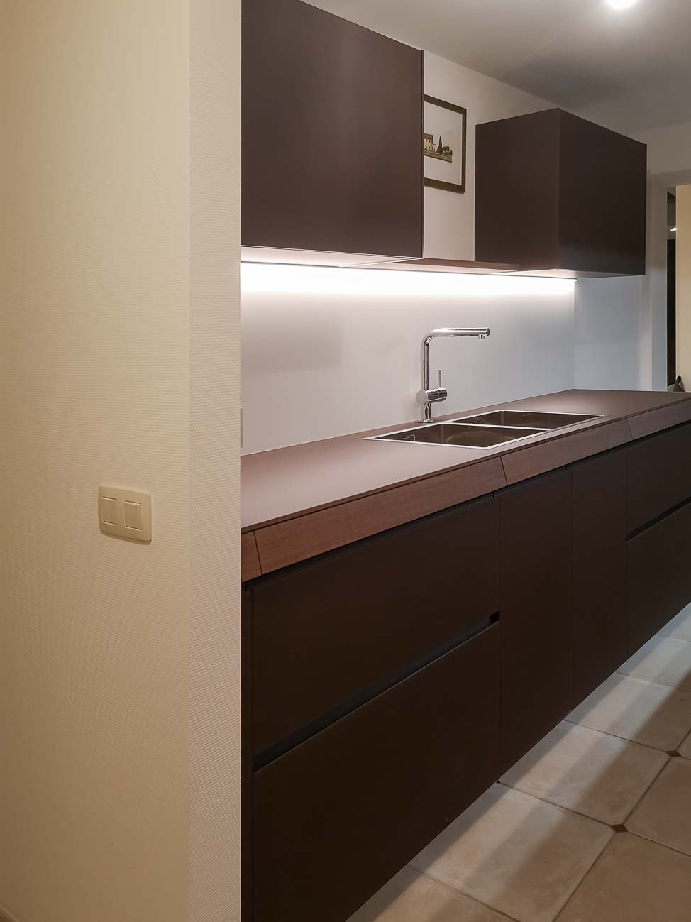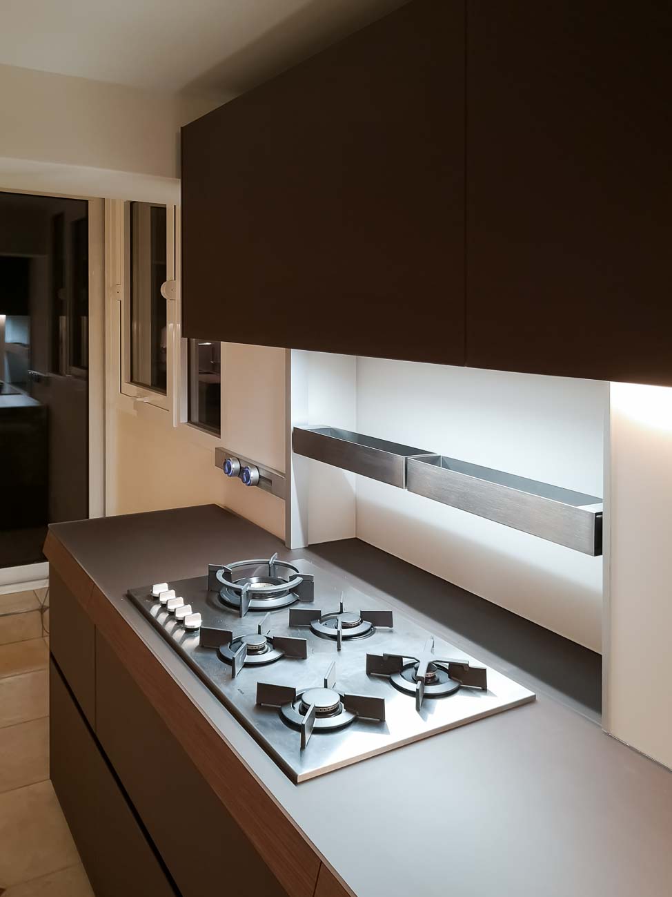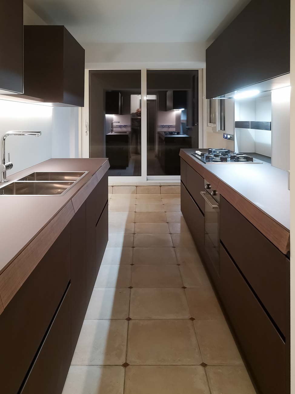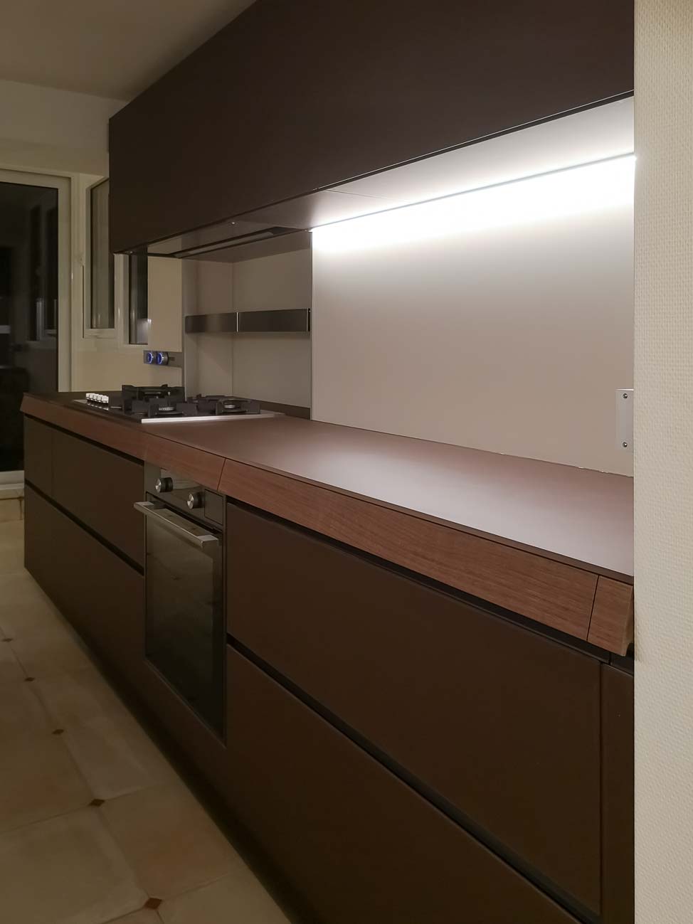 • Cuisine en verre chocolat et éléments en plaquage noyer :