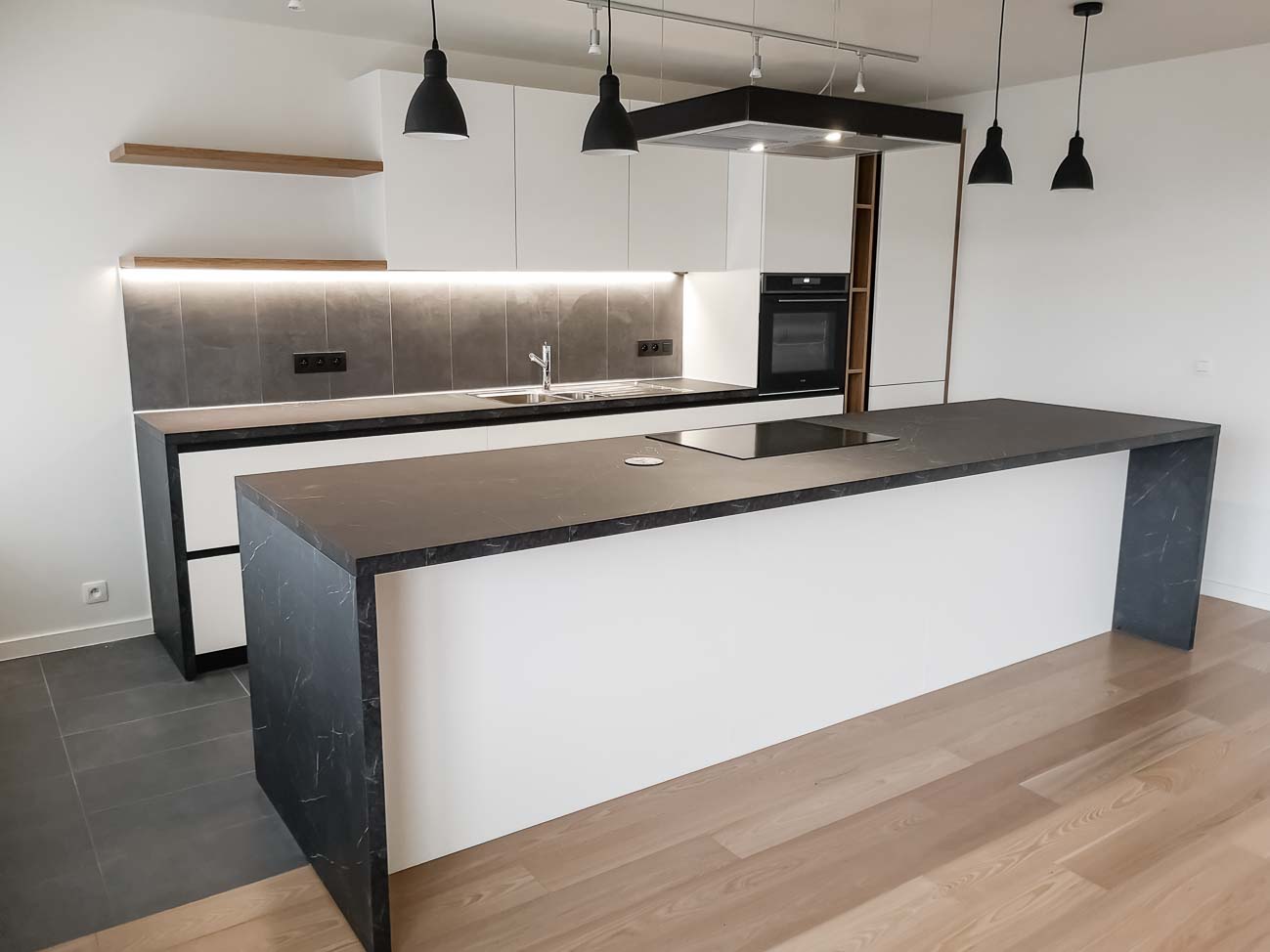 • Cuisine noir et blanc avec plan de travail en Grés Céram noir :