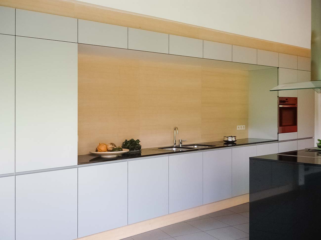 • Cuisine sur mesure avec composition murale en aluminium et éléments en plaquage bois :
